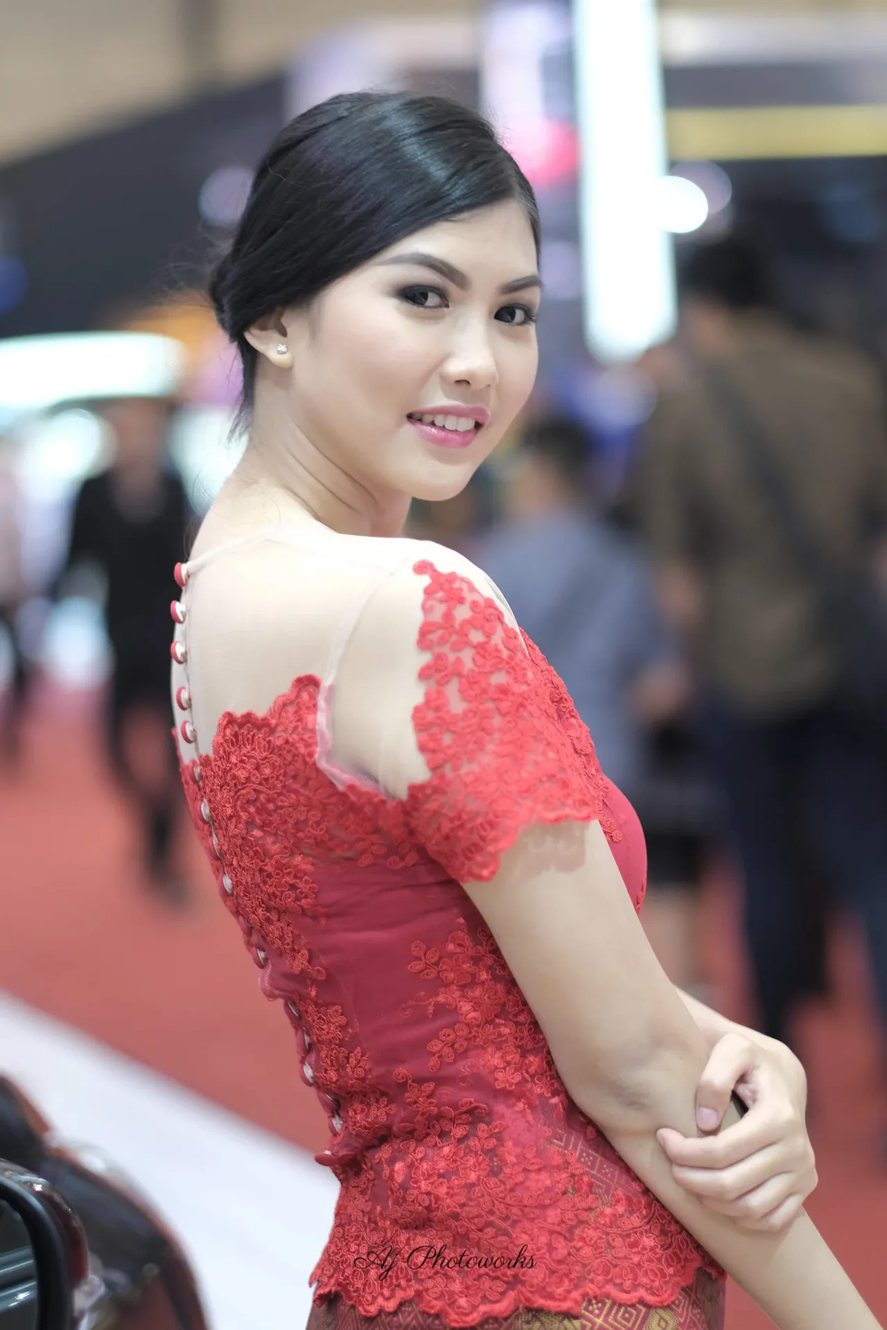 Elegance meets vibrancy in a striking red lace ensemble, radiating confidence at a bustling event.