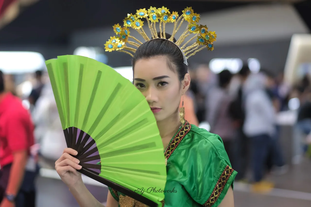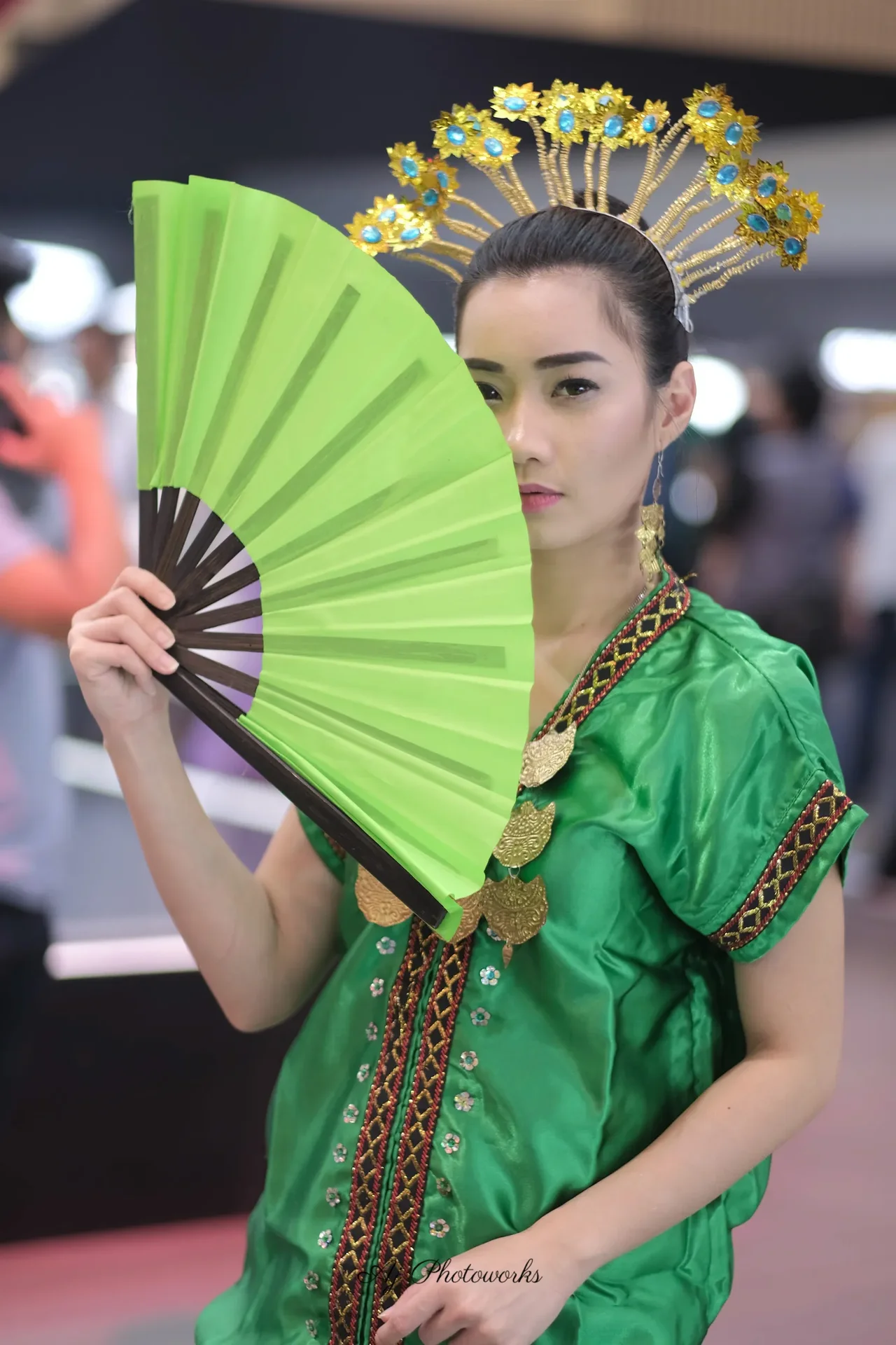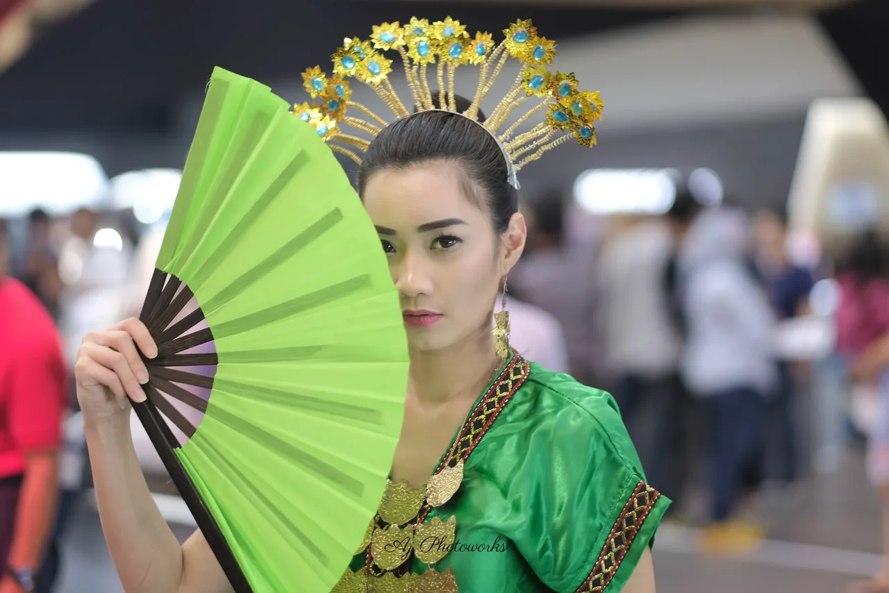 A woman in a green traditional costume with a gold headpiece holds a lime green fan at a cultural event.