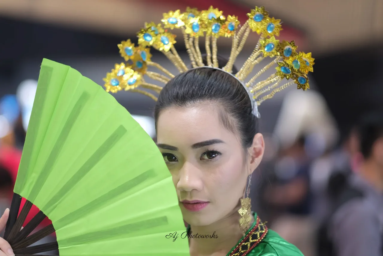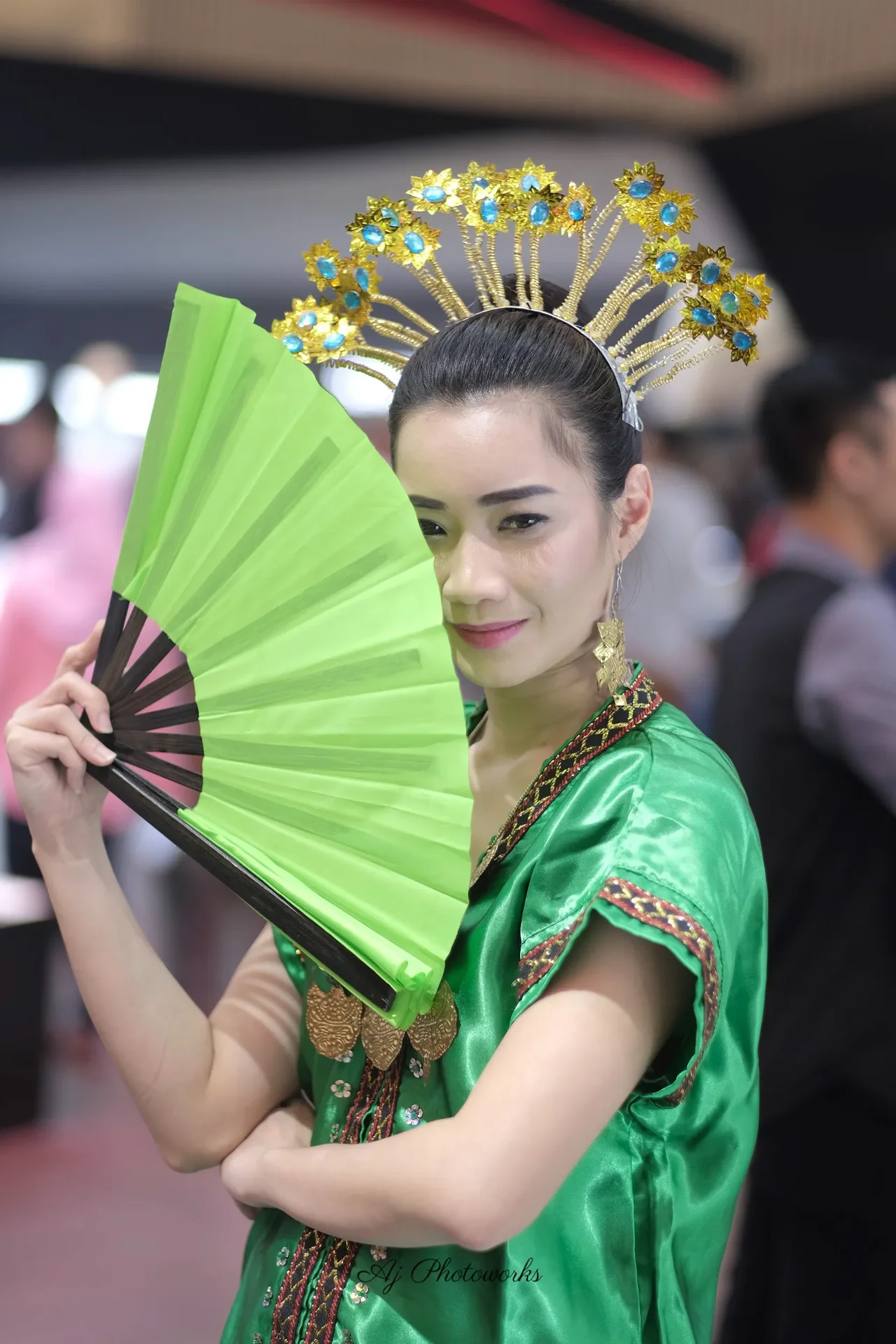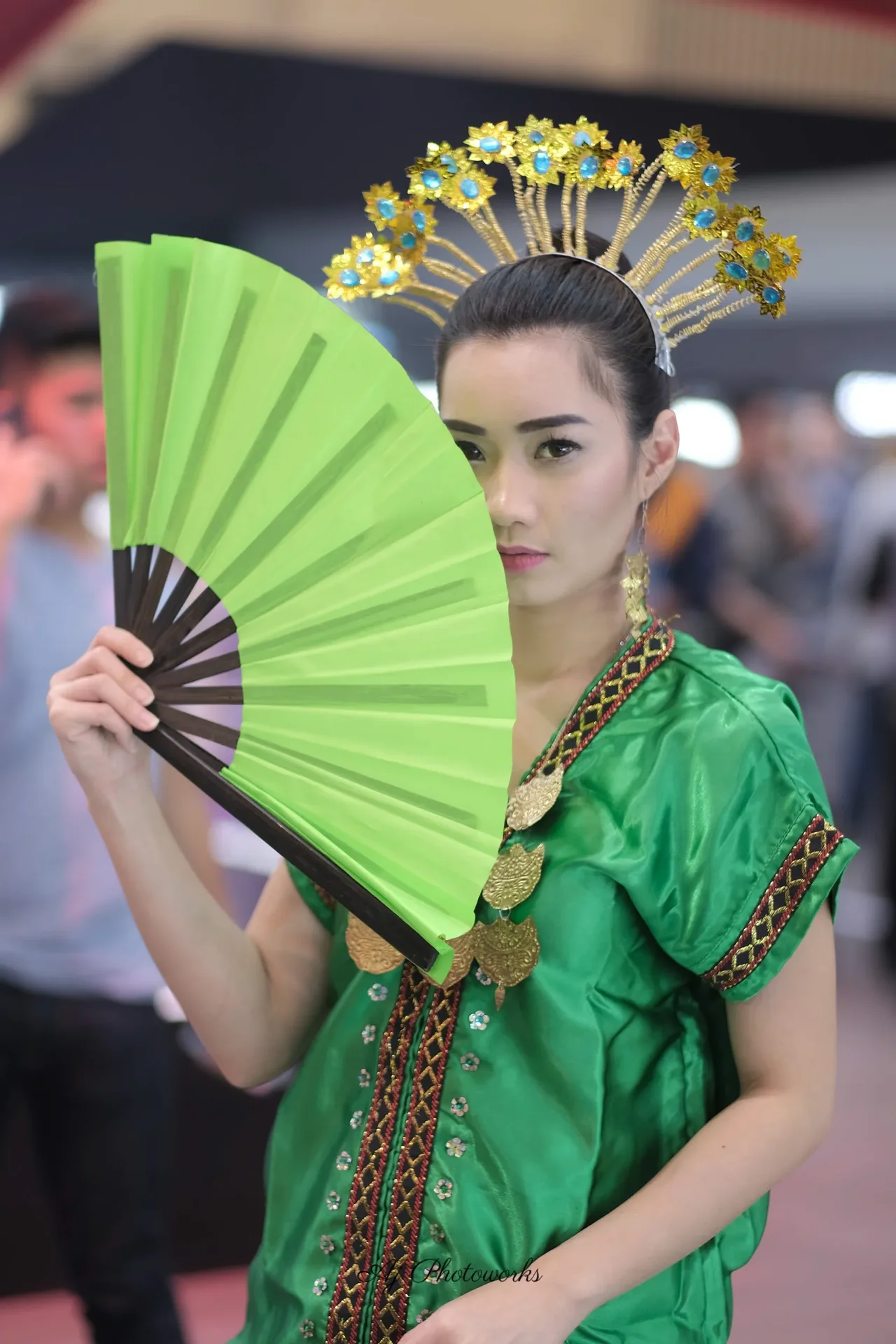 A woman in a green traditional costume with a gold headpiece holds a lime green fan at a cultural event.