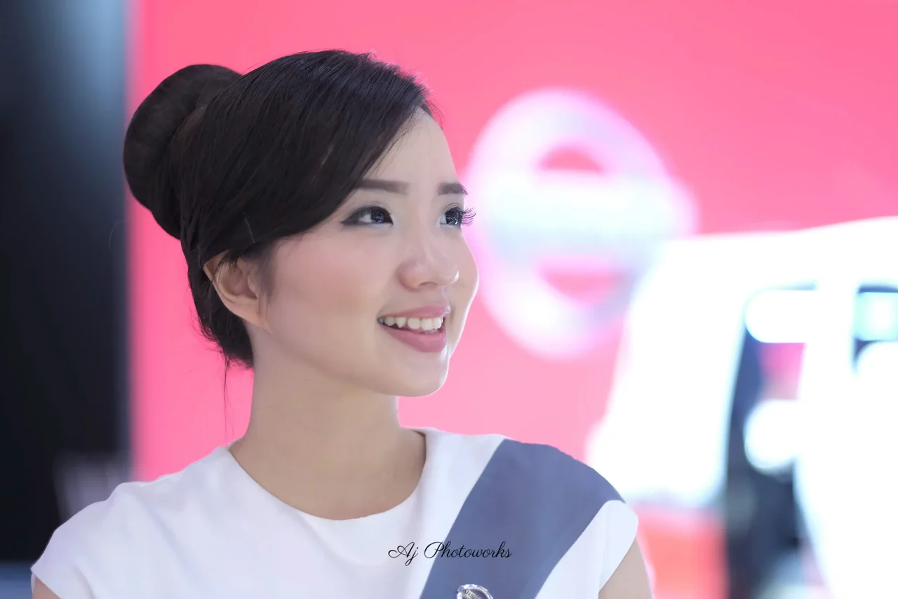 Elegance meets confidence in a vibrant exhibition setting, highlighted by crisp attire and warm, lively lighting.