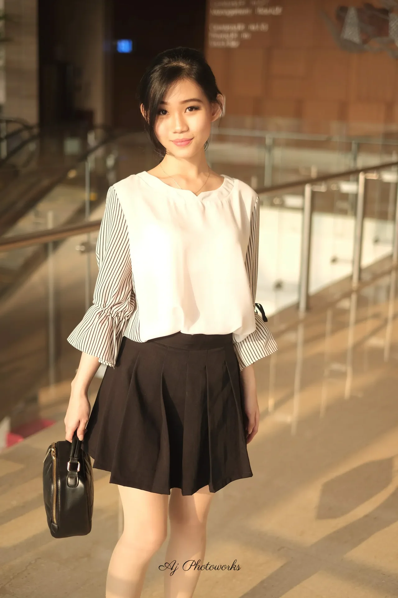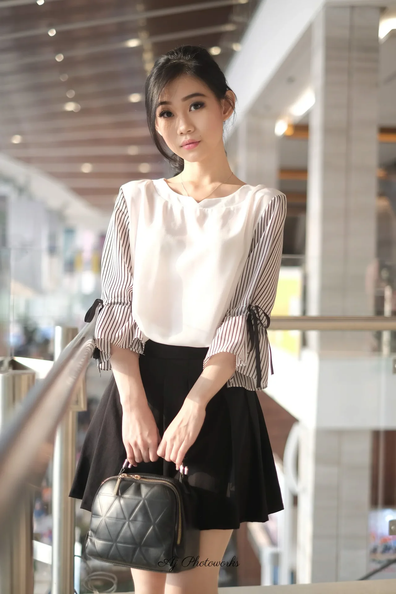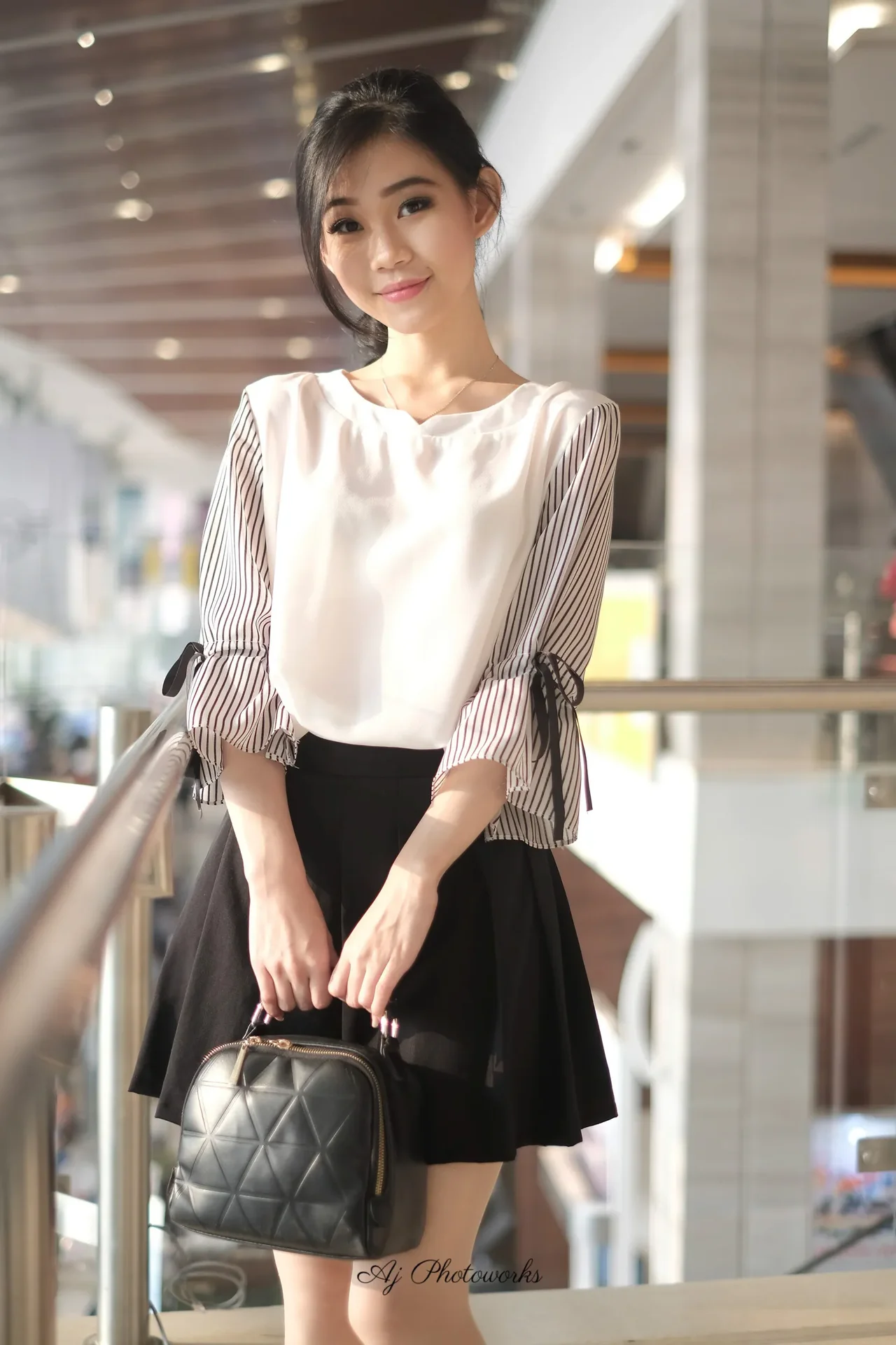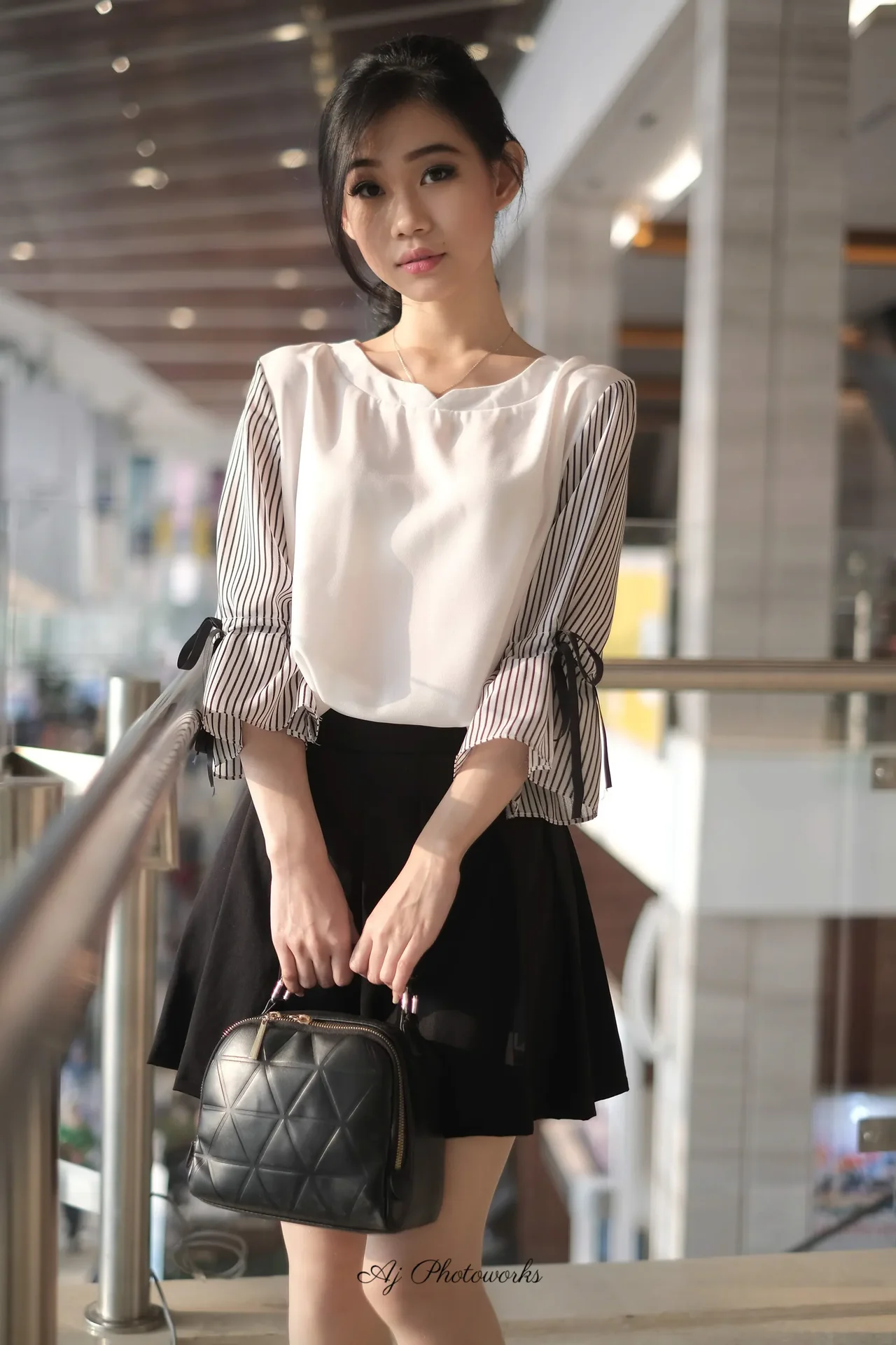 A modern and elegant fashion portrait featuring a black and white striped blouse paired with a pleated black skirt. The model exudes professionalism and sophistication while holding a stylish quilted handbag.