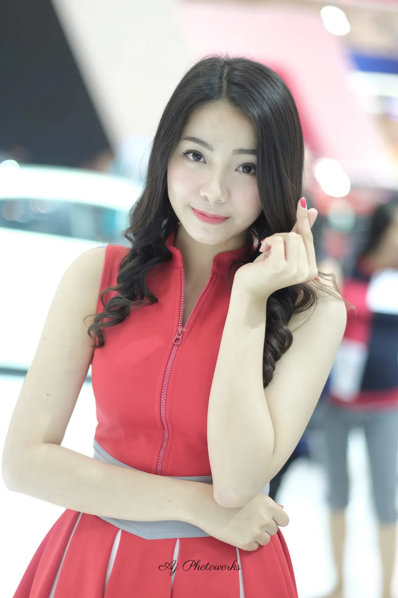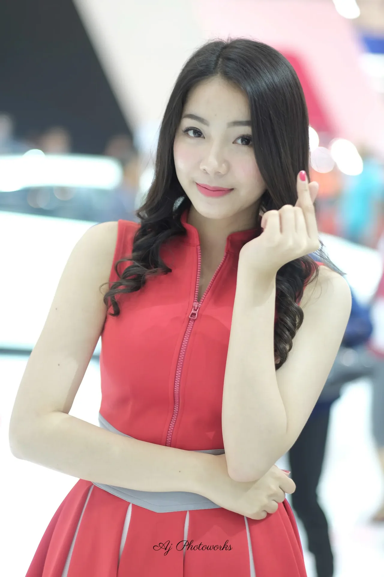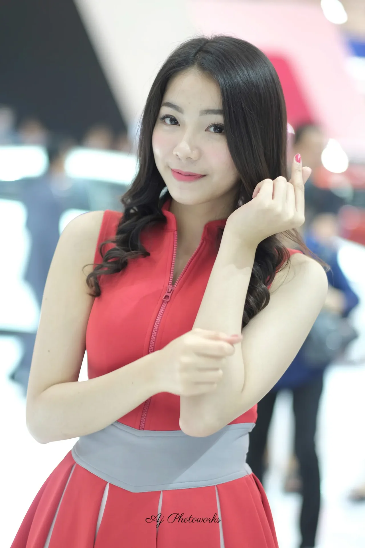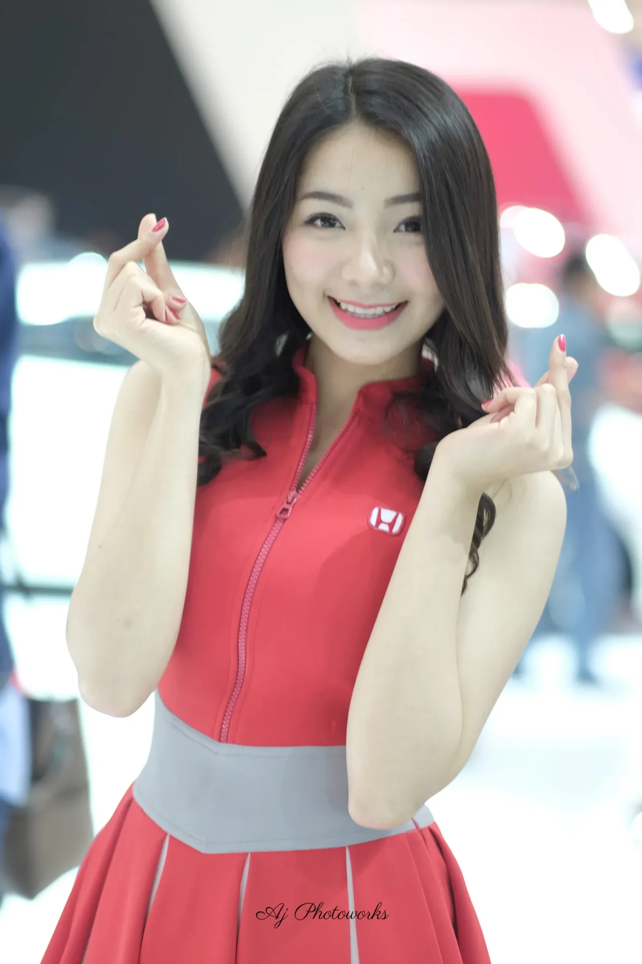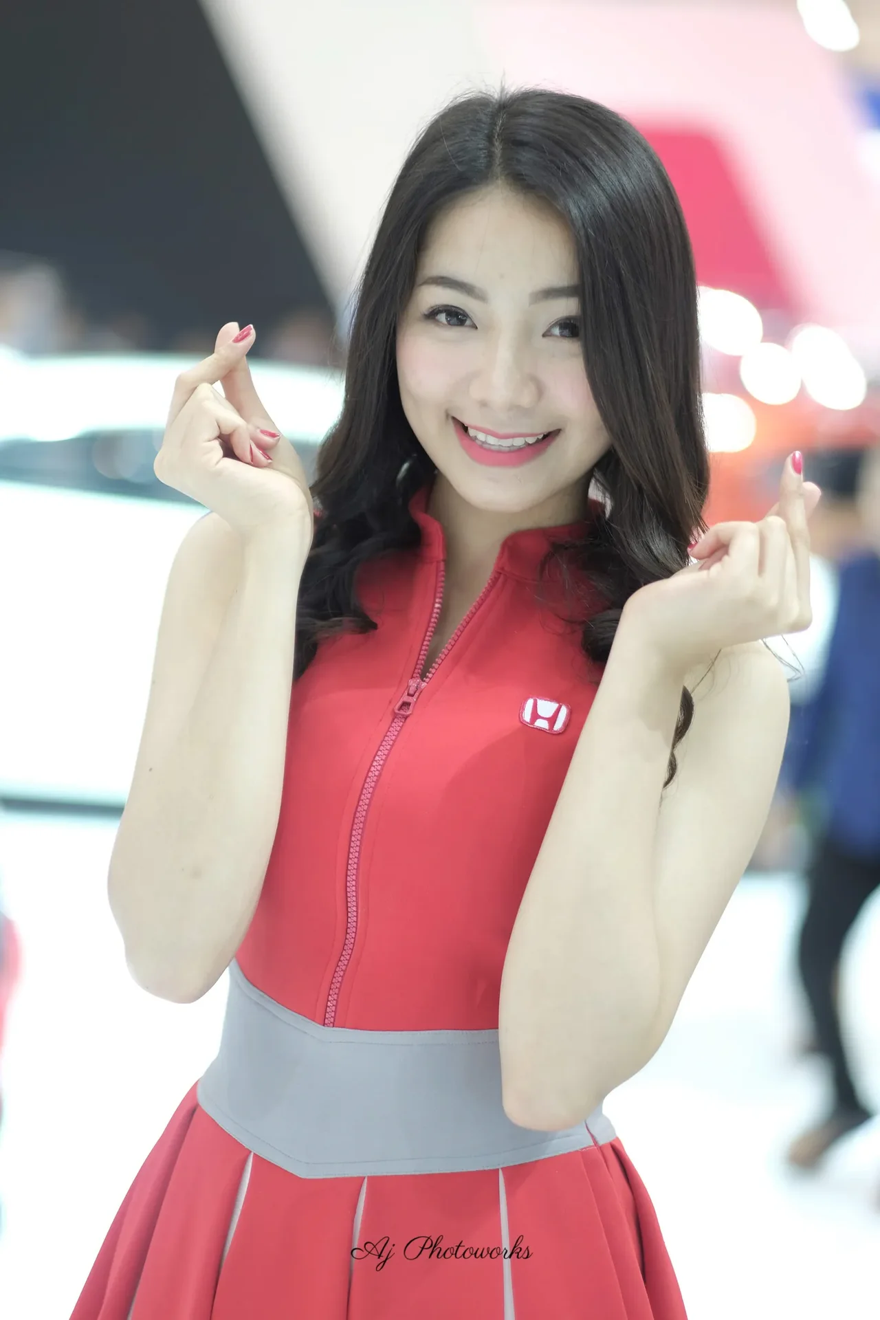 A confident model showcasing a vibrant red Honda-branded dress in an exhibition setting.