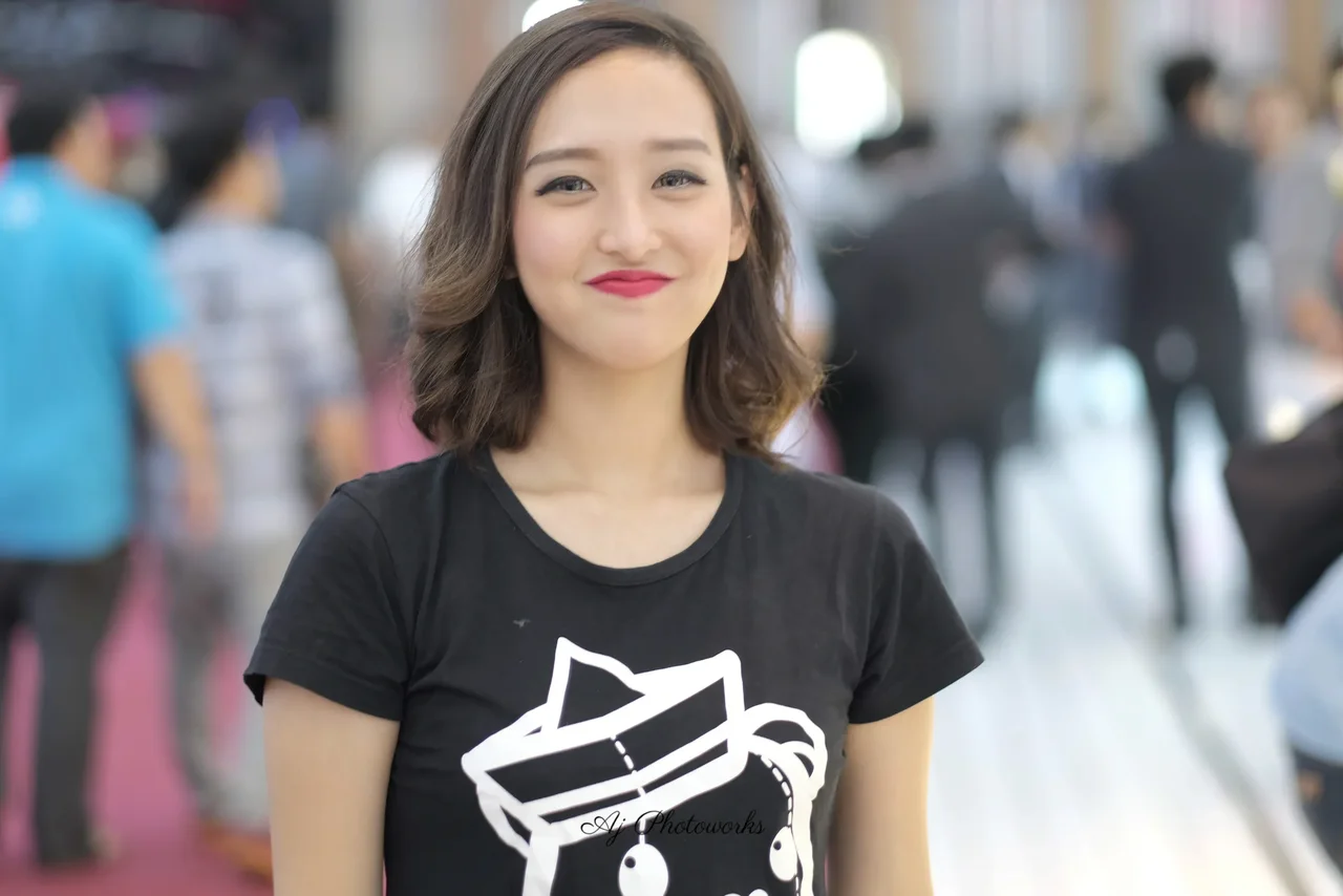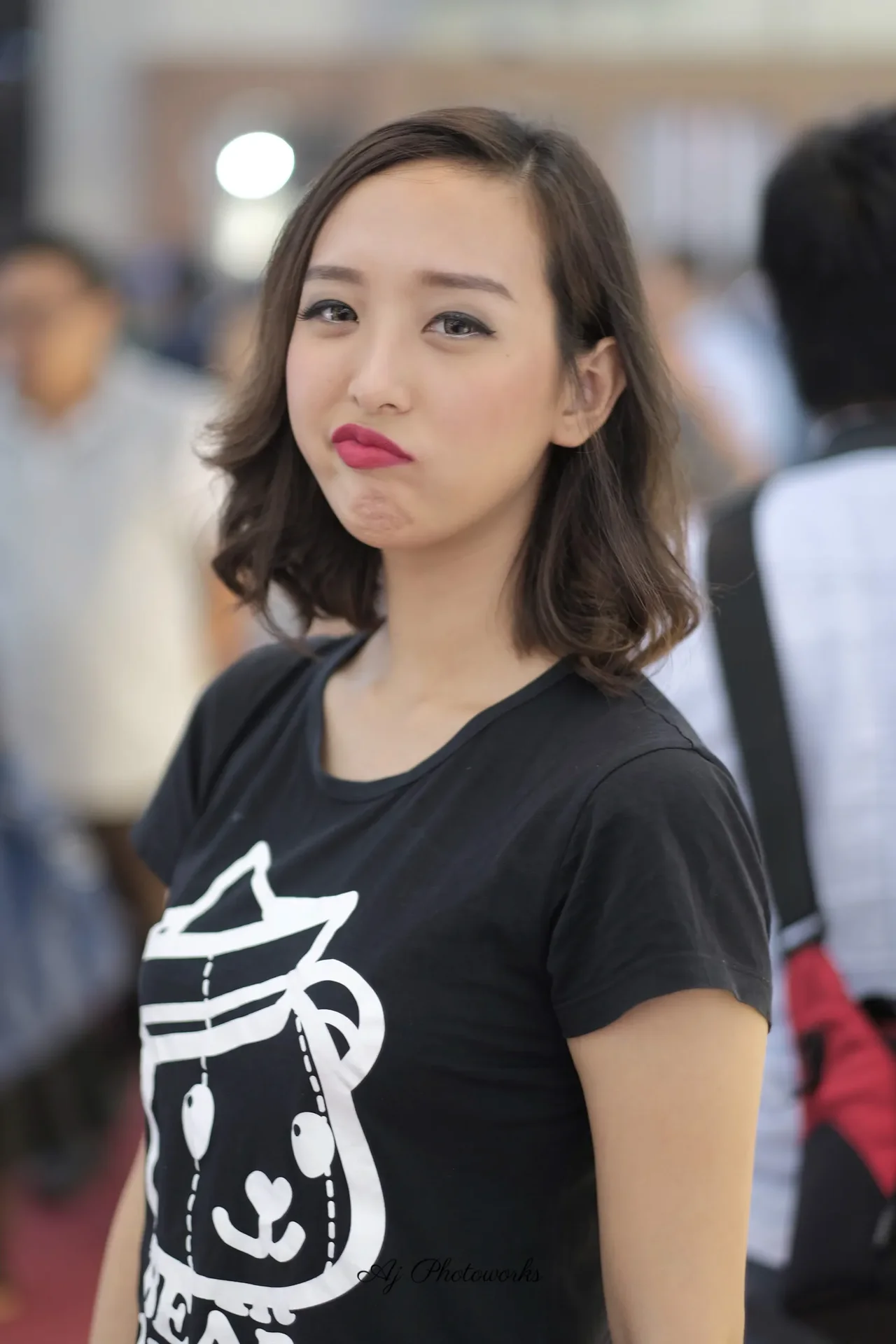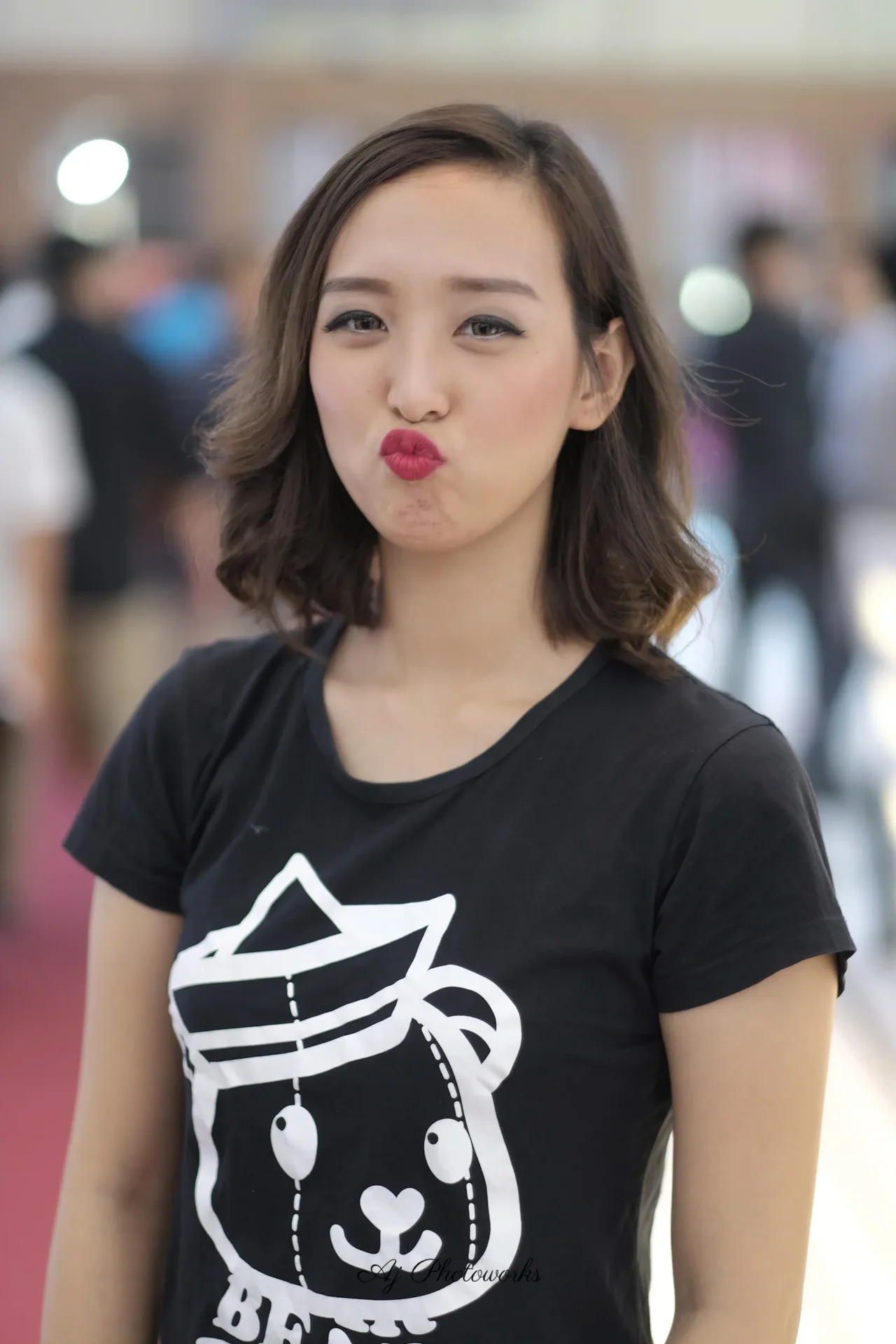 A young woman at an indoor event, wearing a black T-shirt with a white bear graphic, standing in front of a crowd. The photos capture candid, focused, and dynamic poses with vibrant indoor lighting.