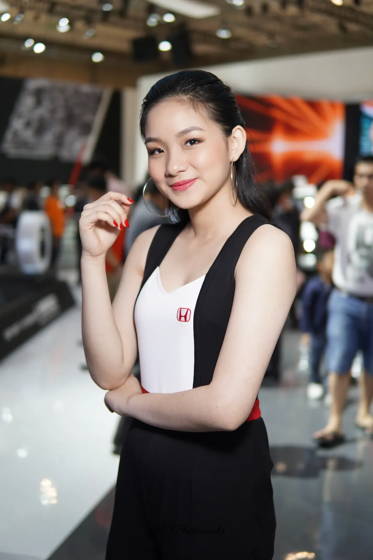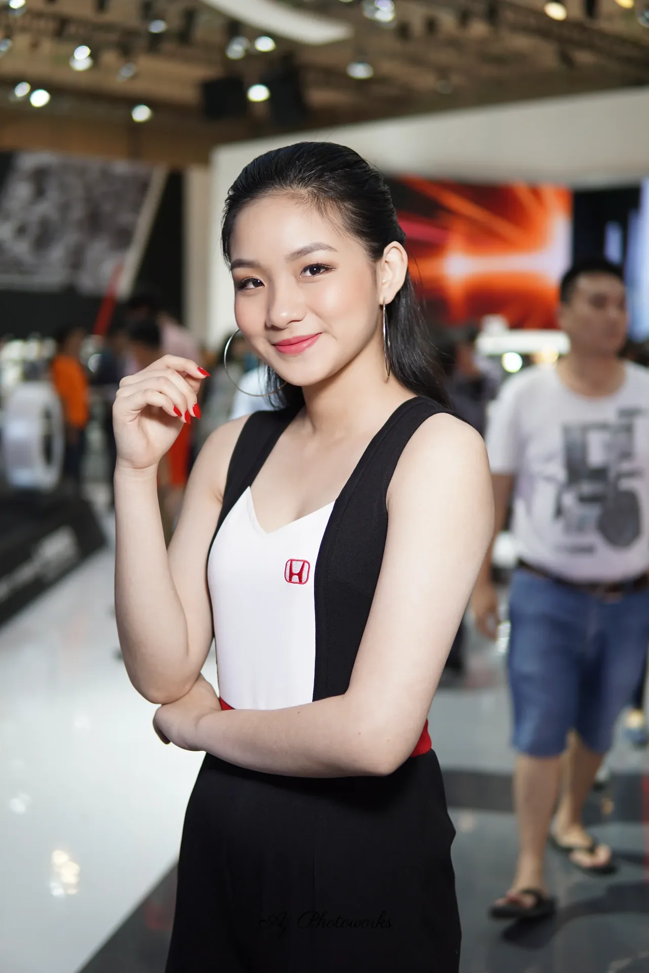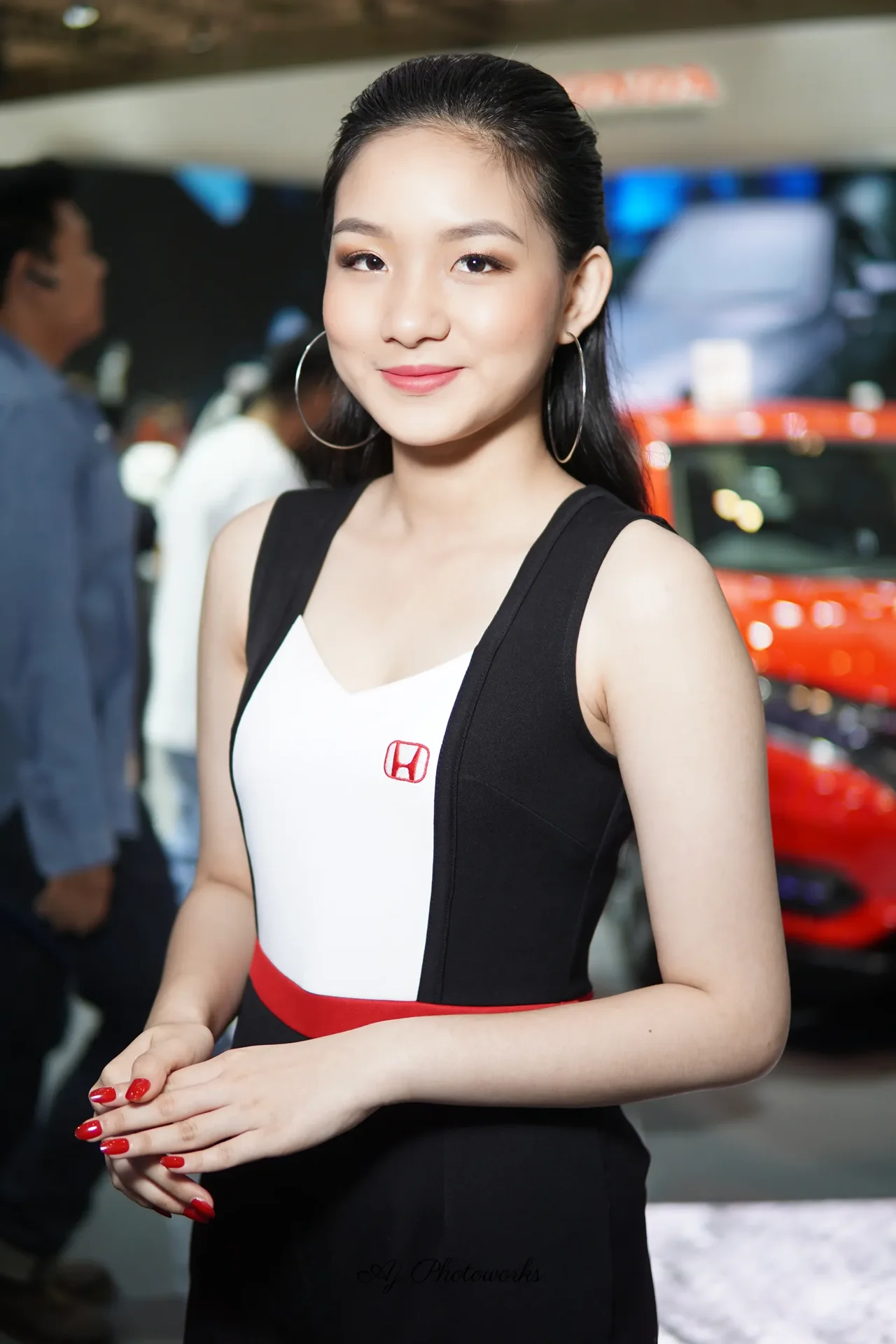 A confident woman in a sleek black and white tank dress with red accents poses at an auto show, exuding modern elegance.