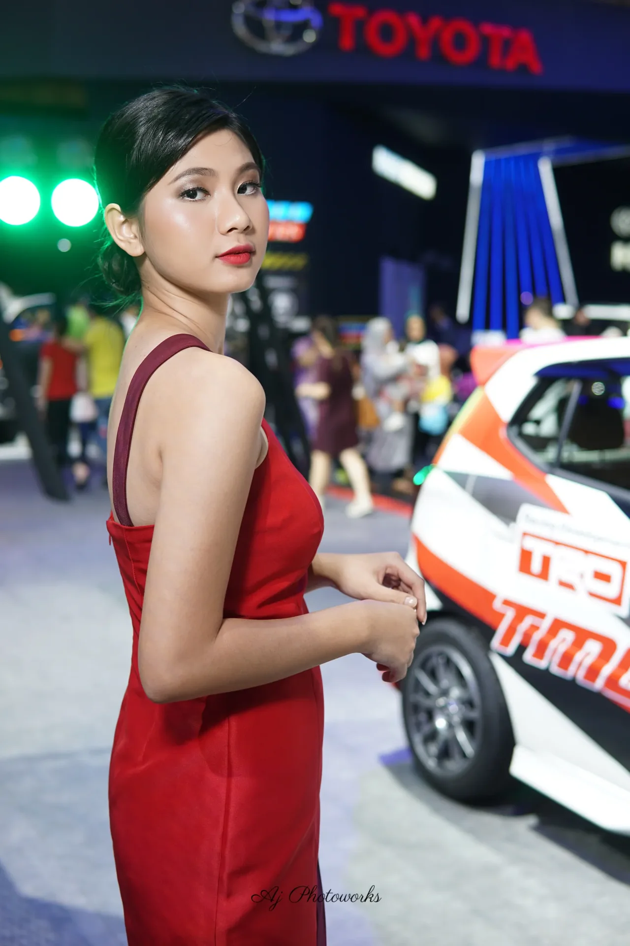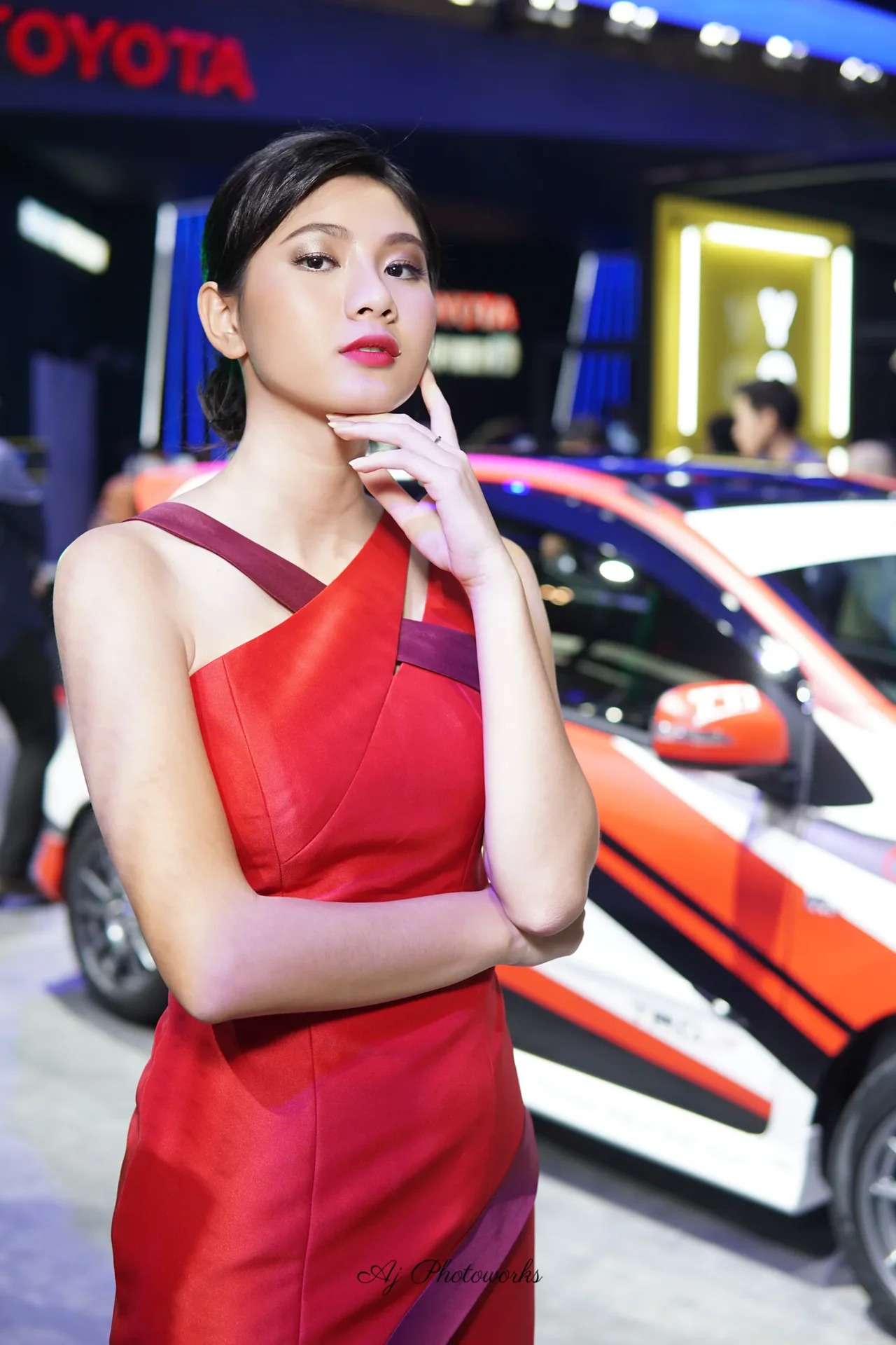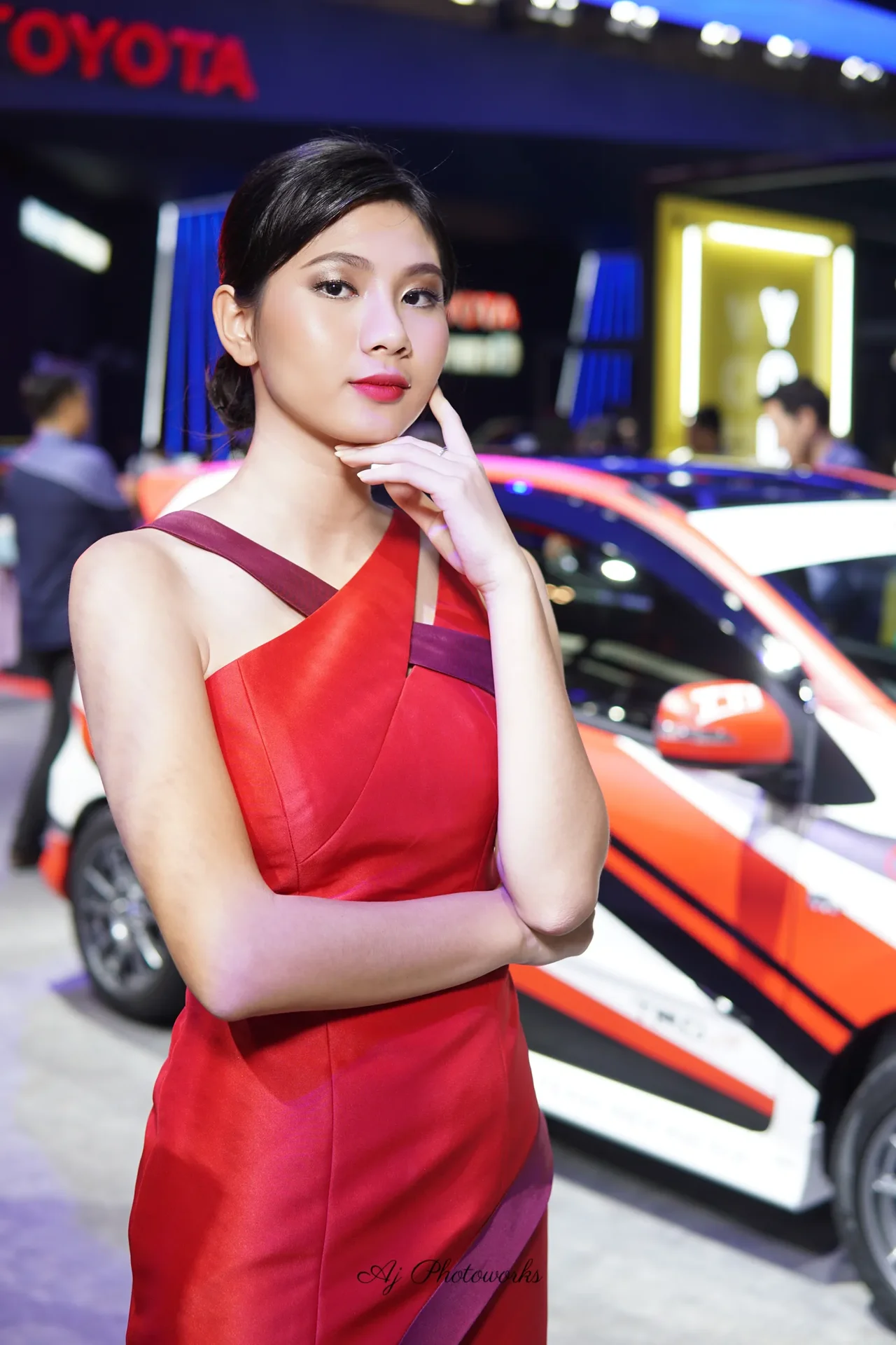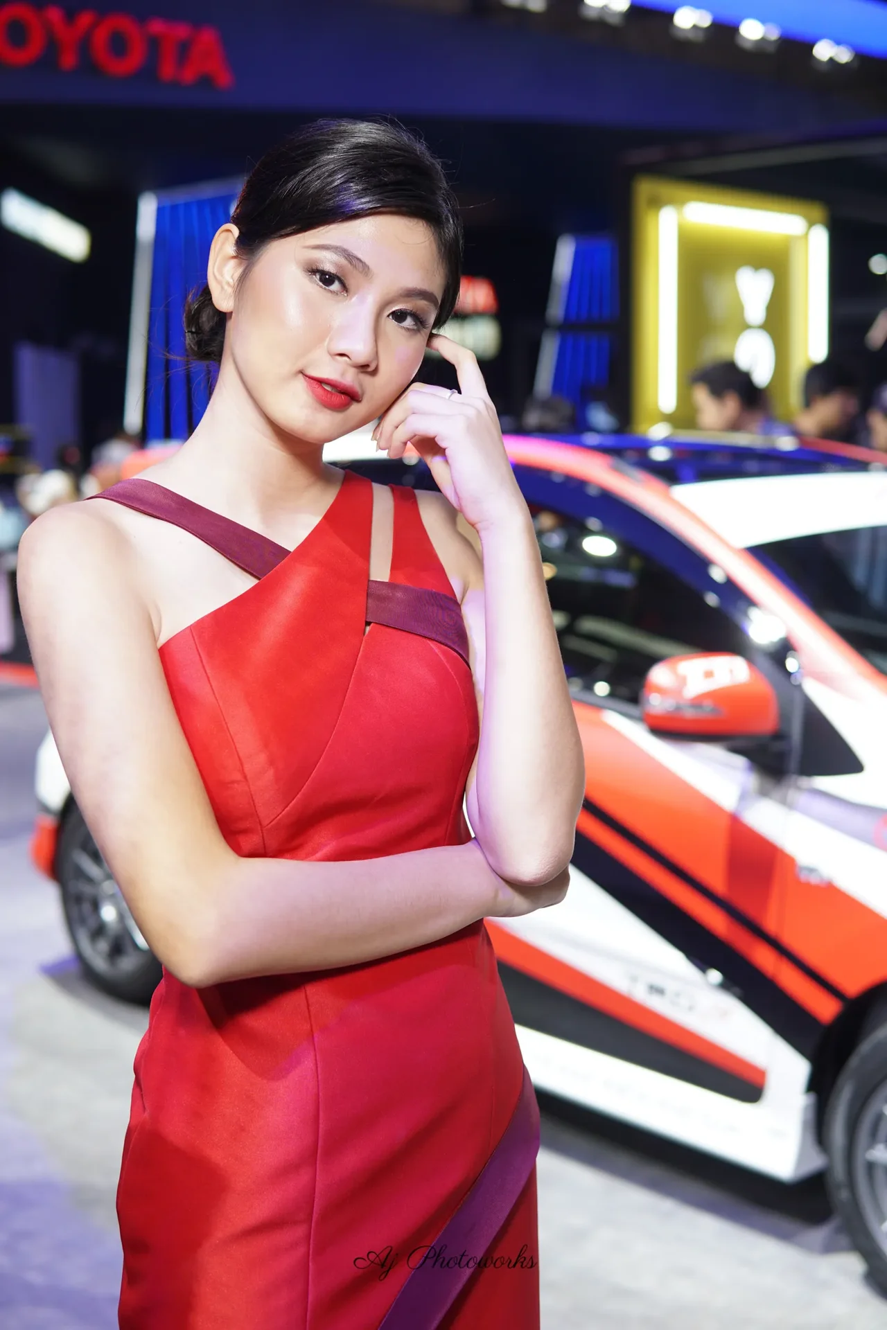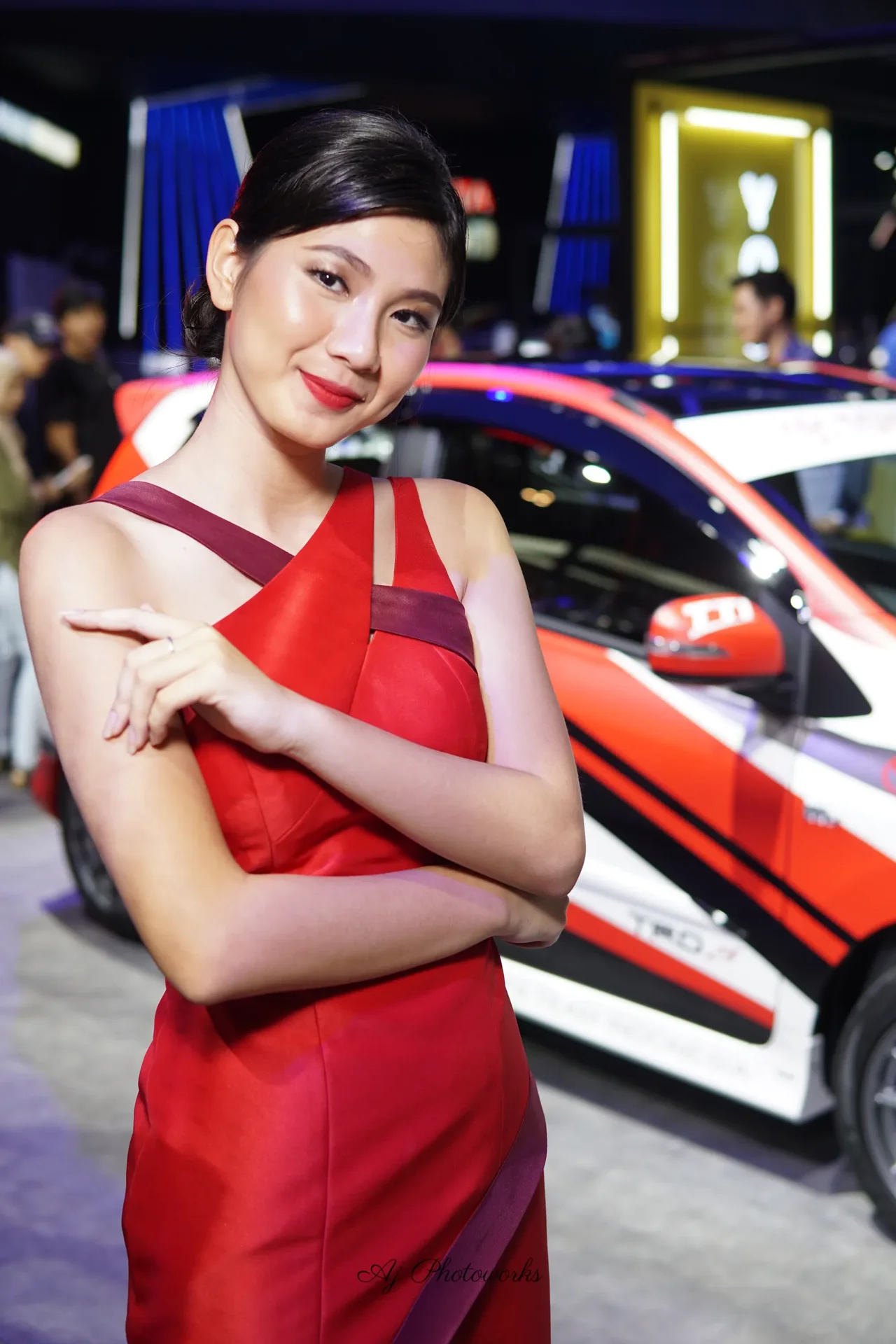 A poised woman in a rich red dress with purple detailing stands confidently beside a sleek sports car at an automotive exhibition, blending fashion and motorsport aesthetics in a vibrant setting.