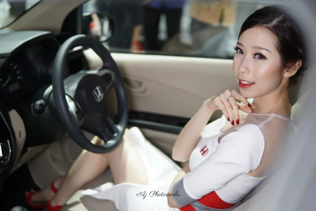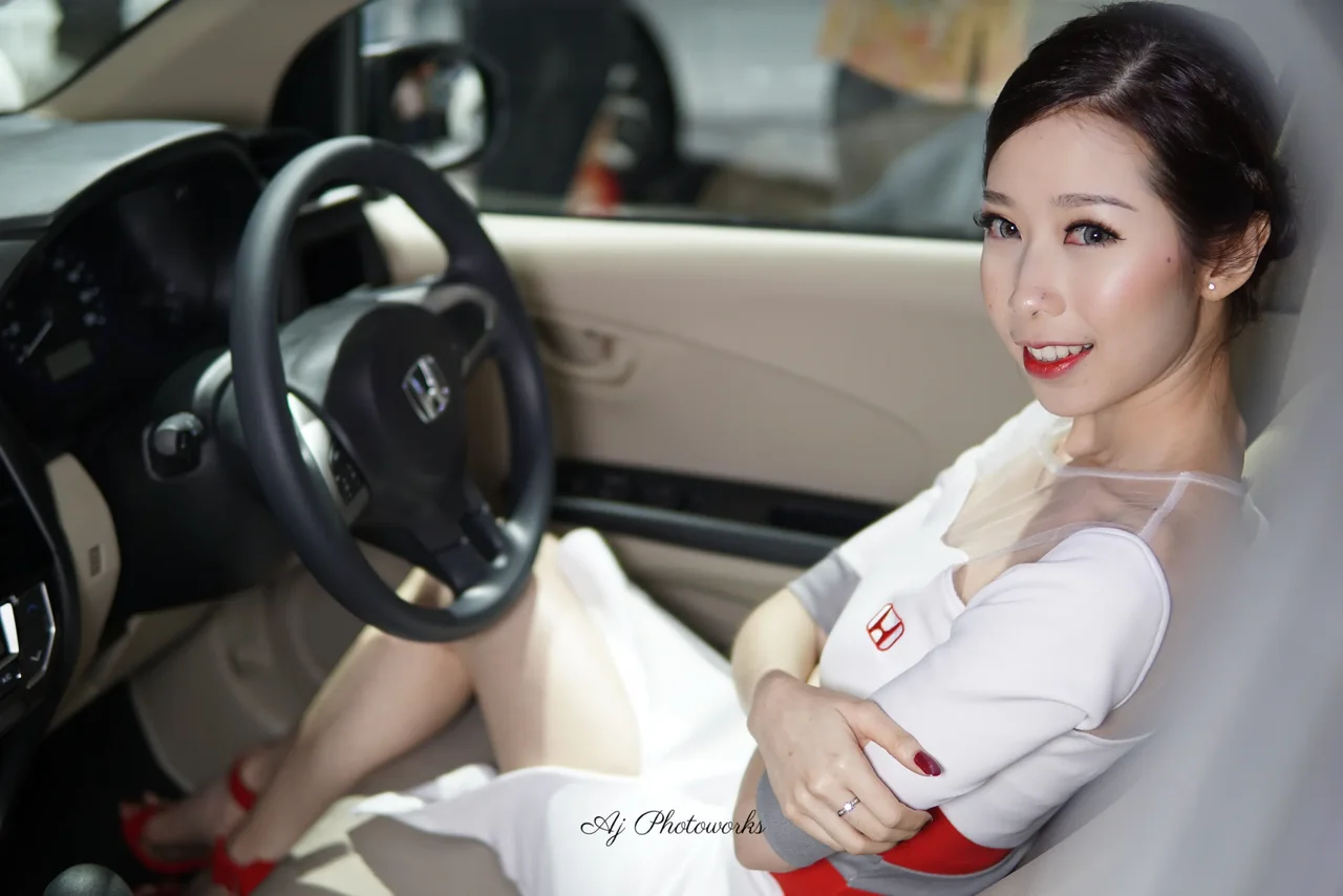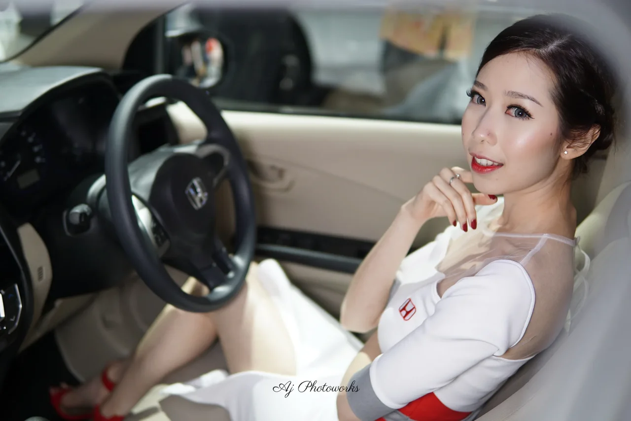 A model in a white dress with red Honda branding poses confidently inside a car, blending automotive promotion with sophisticated style.
