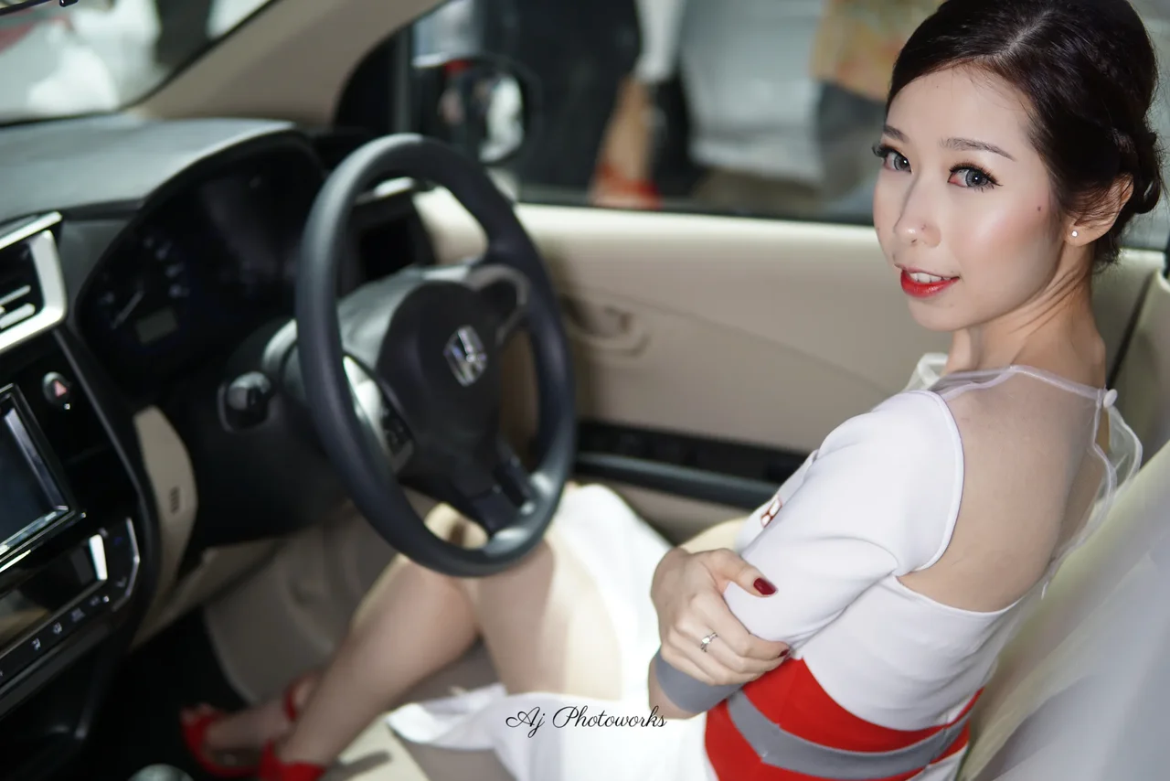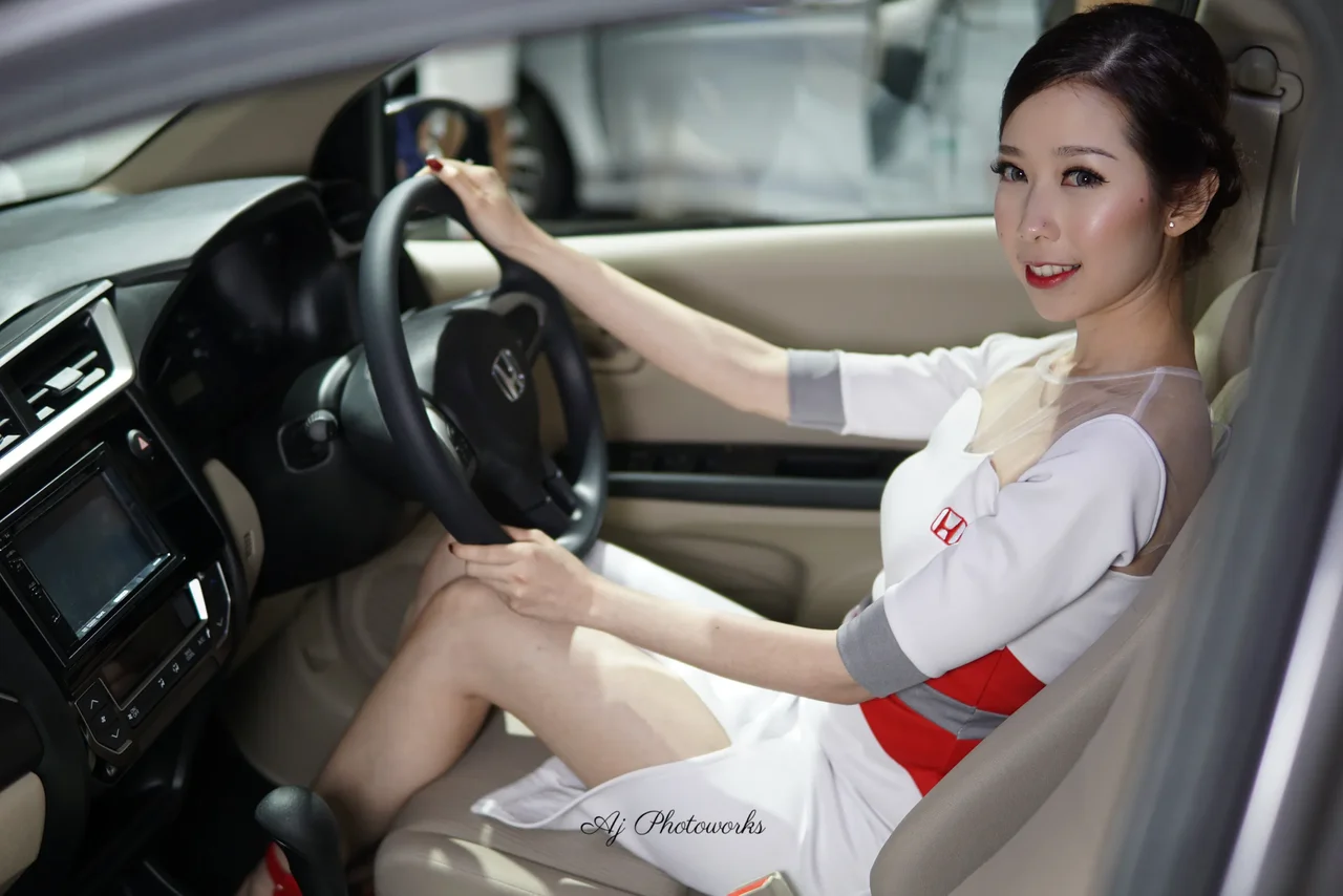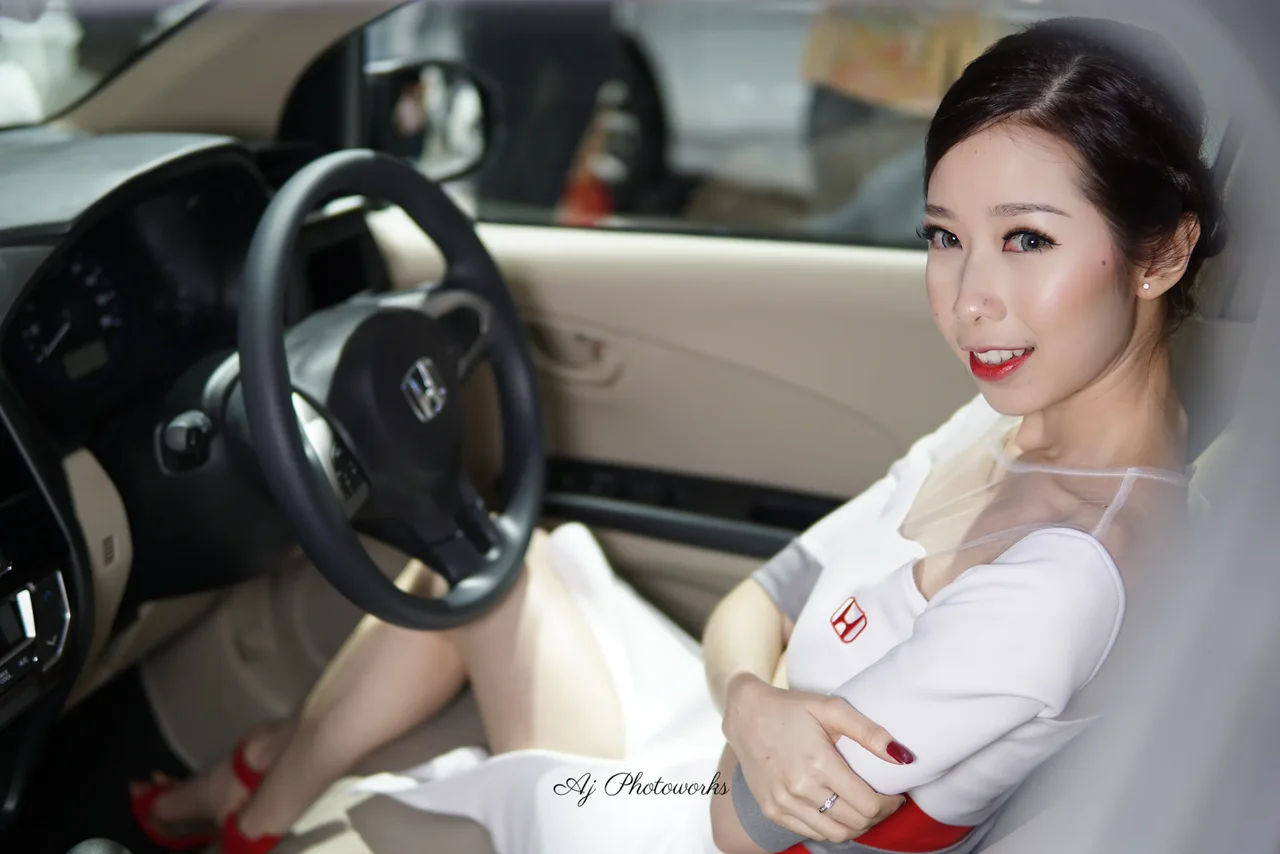 A model in a white dress with red Honda branding poses confidently inside a car, blending automotive promotion with sophisticated style.