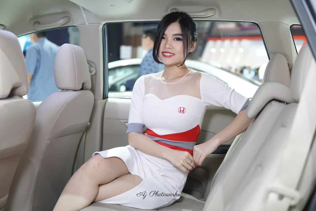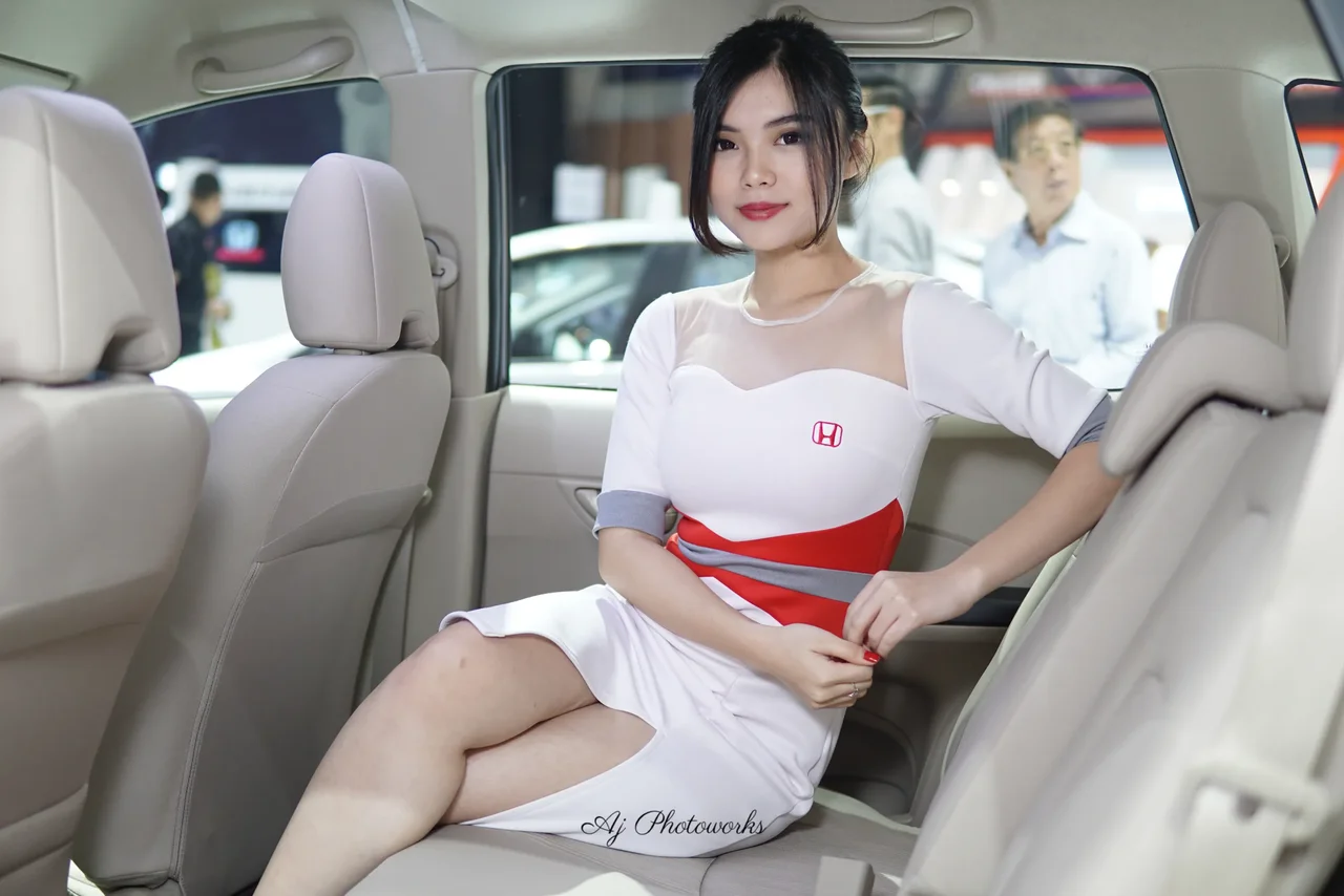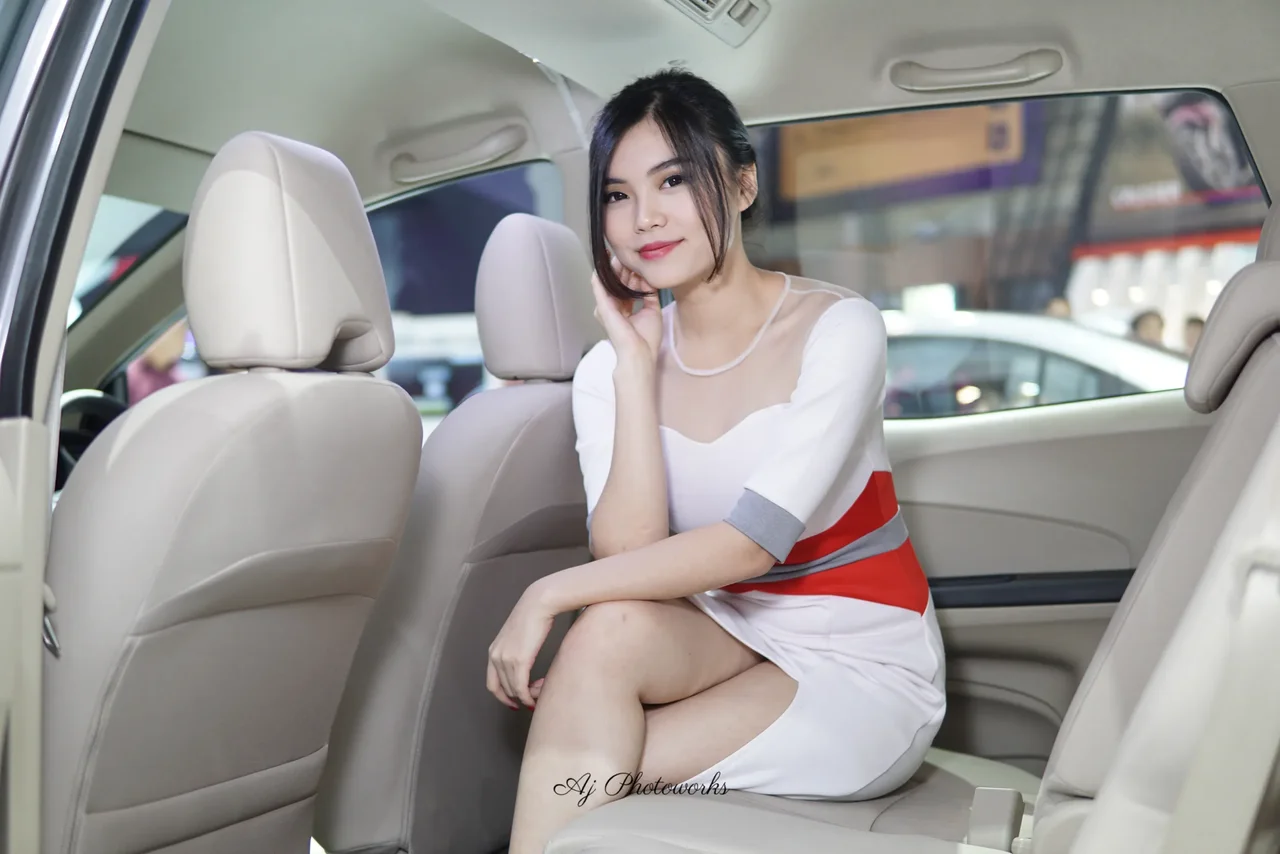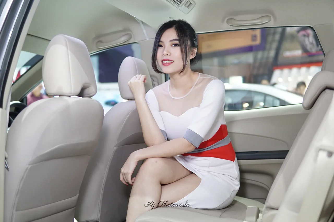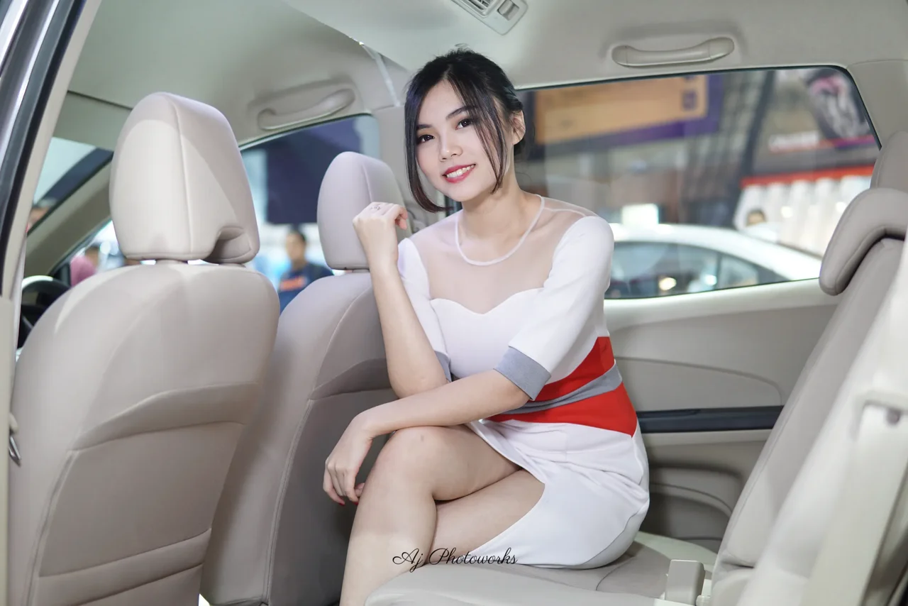 A woman in a white, red, and gray striped dress poses elegantly inside a car at an event, exuding sophistication.
