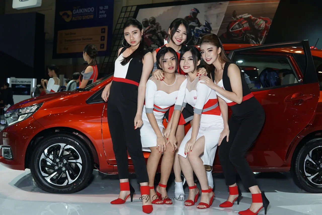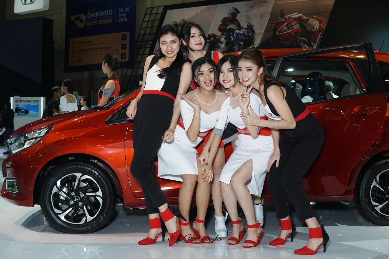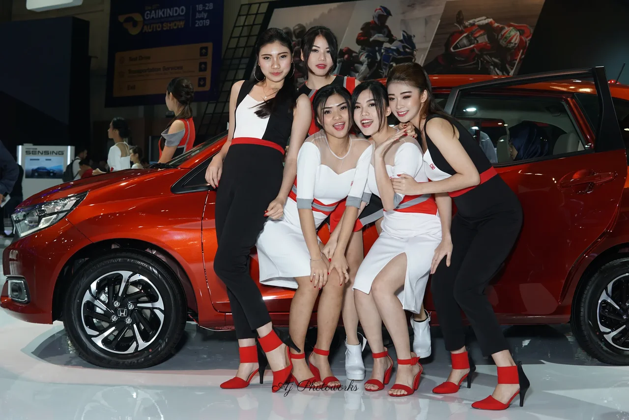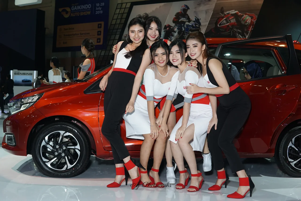 Honda celebrates its legacy at the Gaikindo Auto Show 2019 with a vibrant display of brand ambassadors and a striking red car showcase.