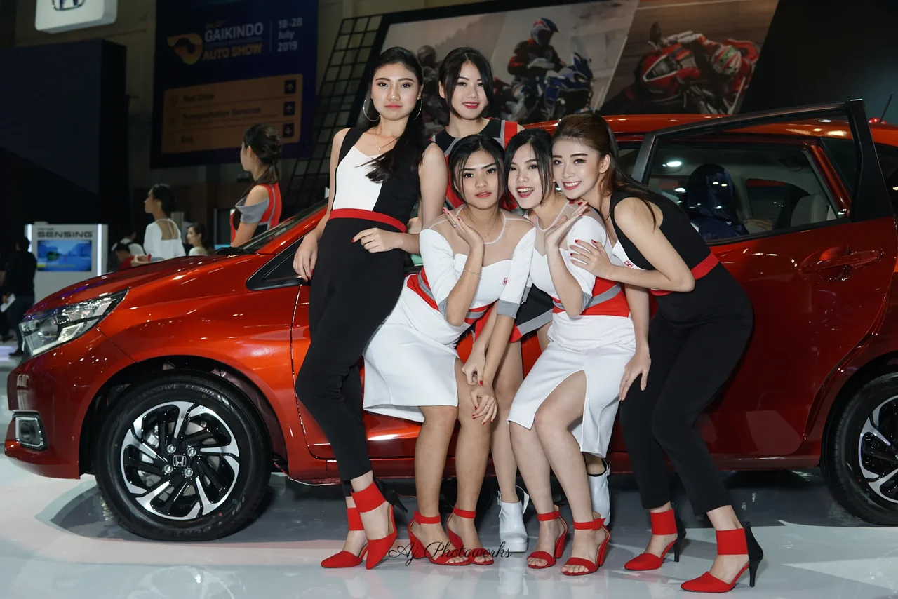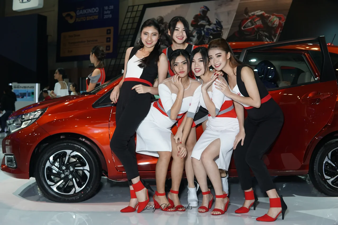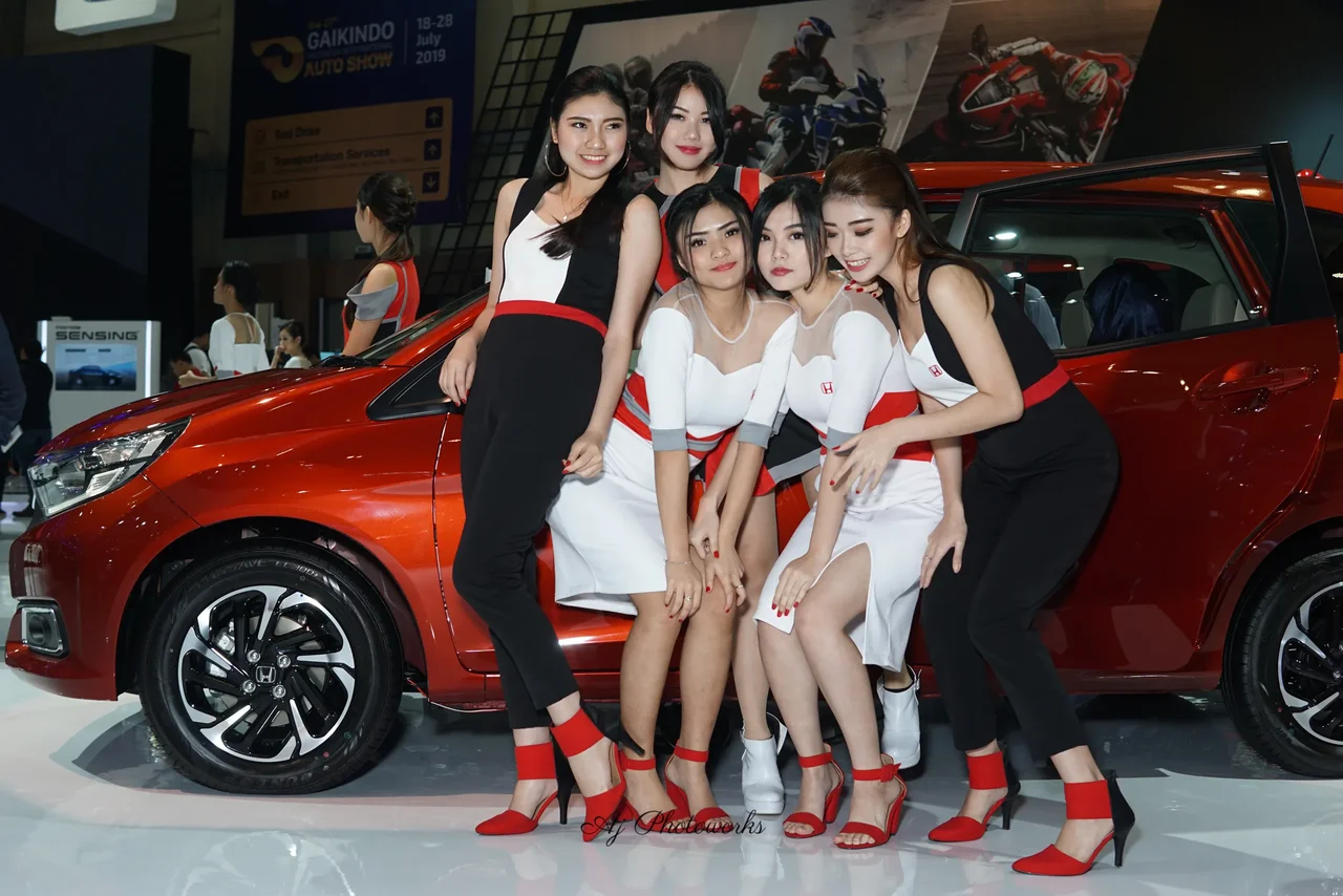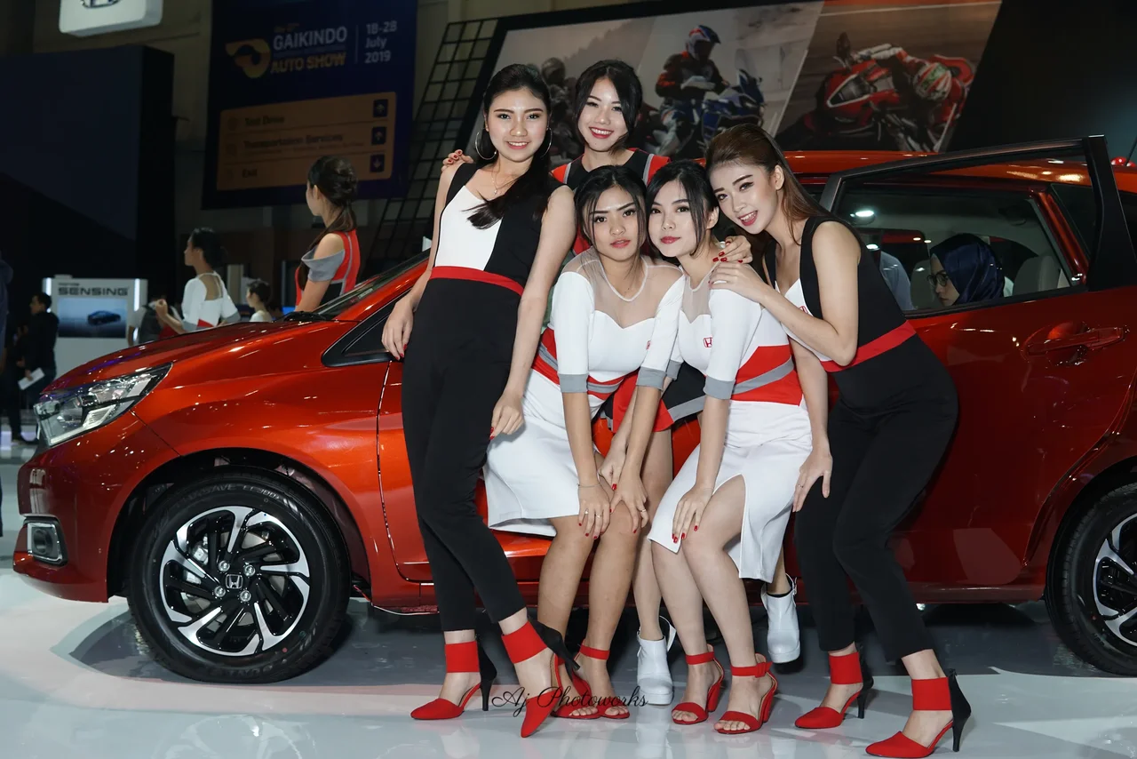 Honda celebrates its legacy at the Gaikindo Auto Show 2019 with a vibrant display of brand ambassadors and a striking red car showcase.