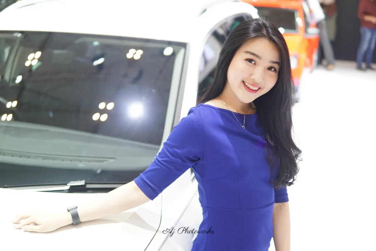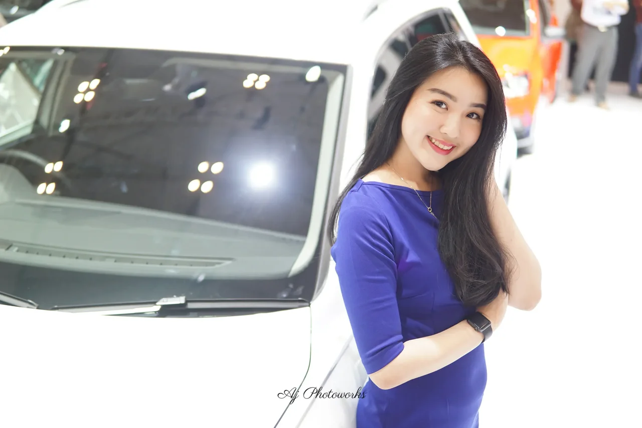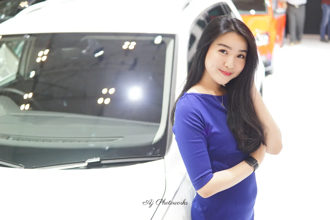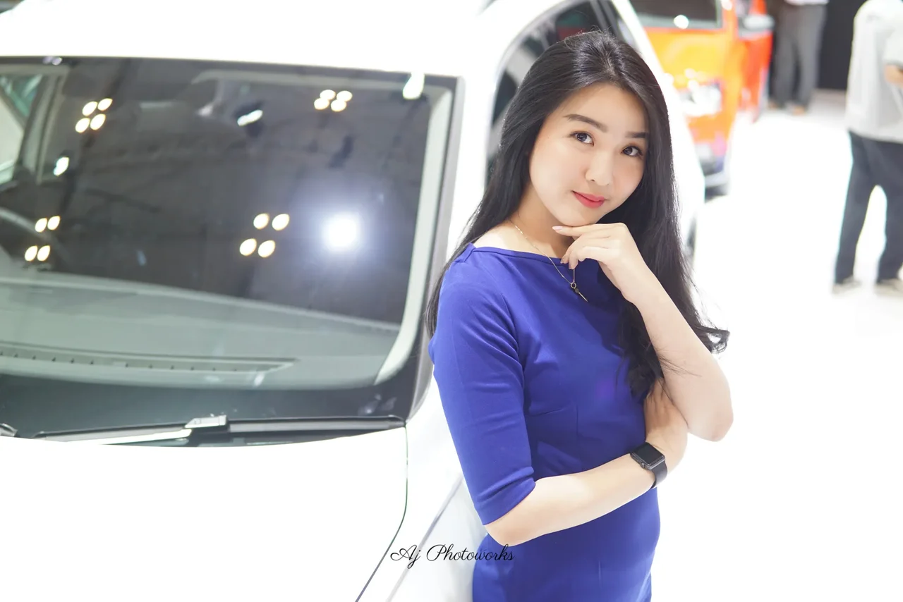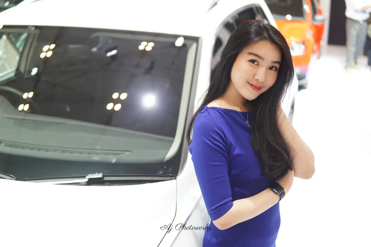 Elegance meets excitement as a confident woman showcases a sleek white car at a vibrant industry expo.