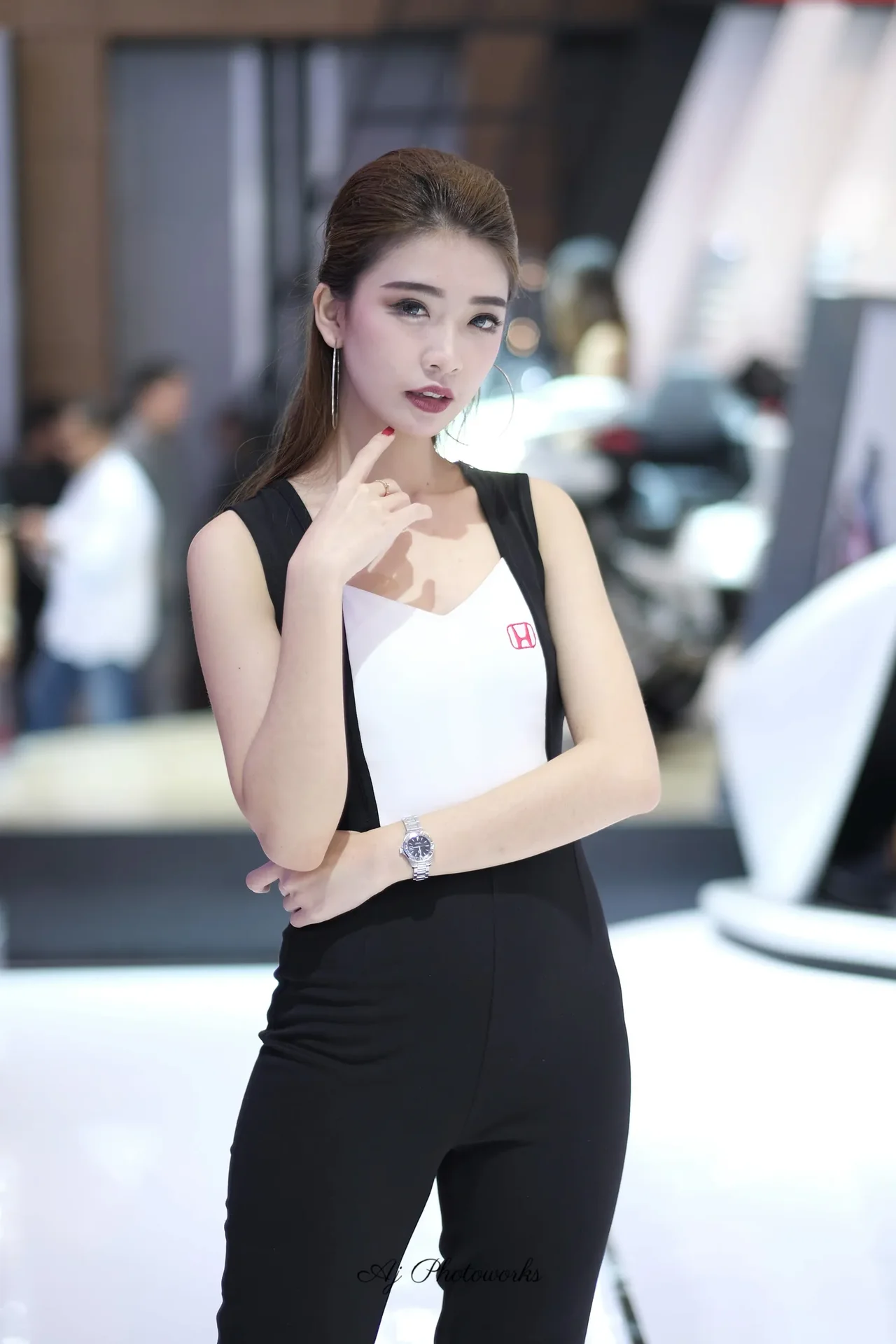 A model embodies elegance and professionalism in a sleek automotive-themed shoot, blending structured fashion with subtle branding.