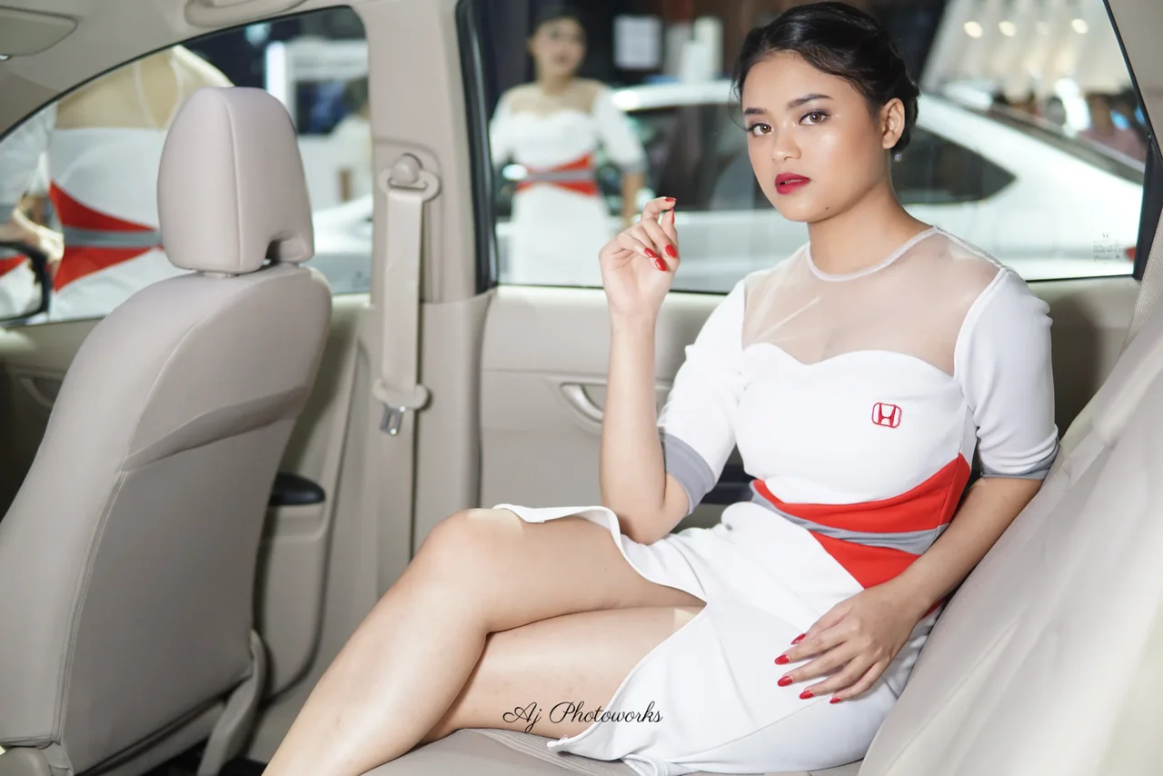 Elegant white ensemble with bold red accents meets automotive precision in a showroom setting, blending sophistication and mechanical allure.