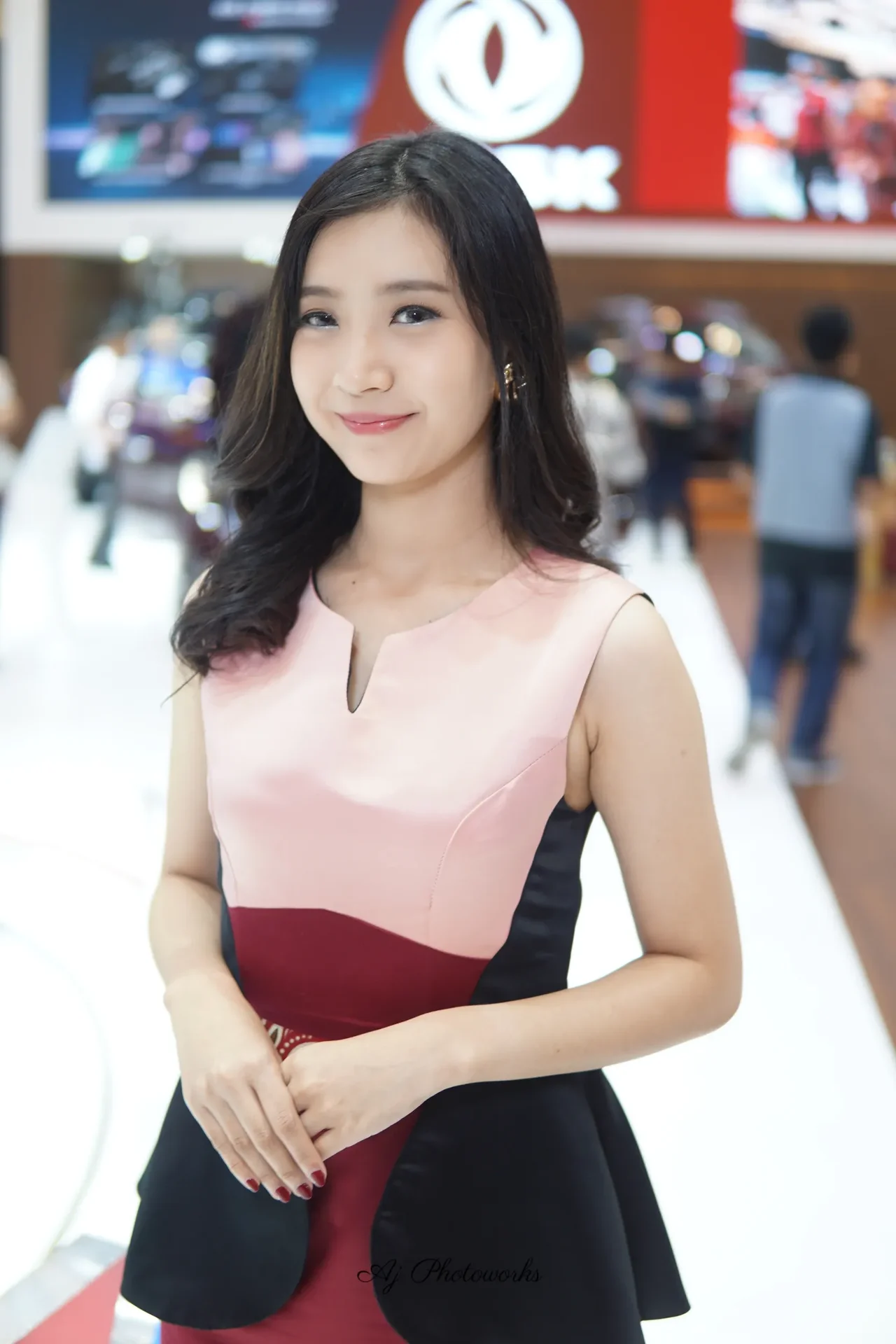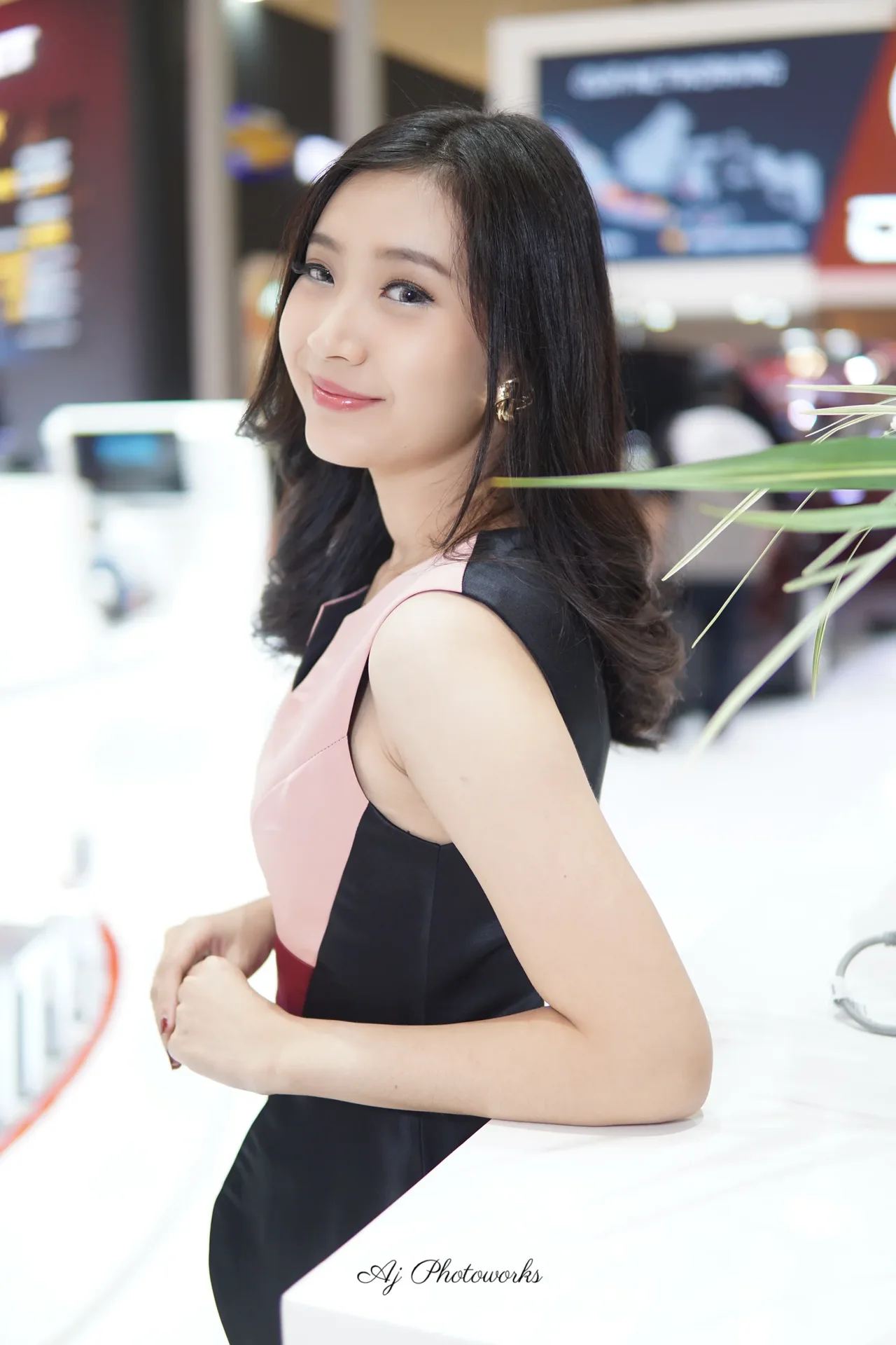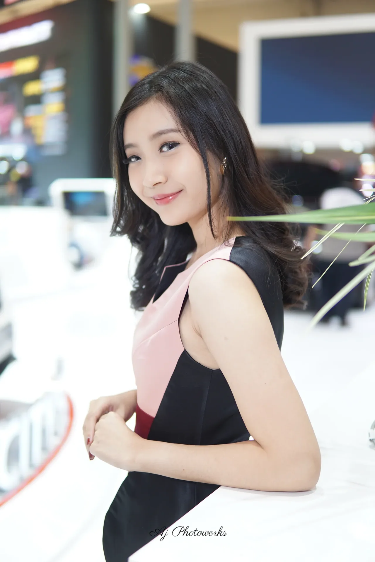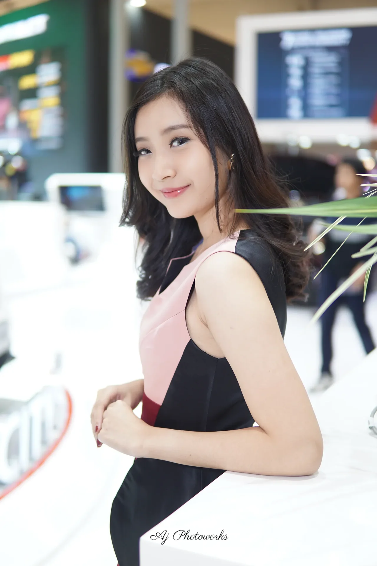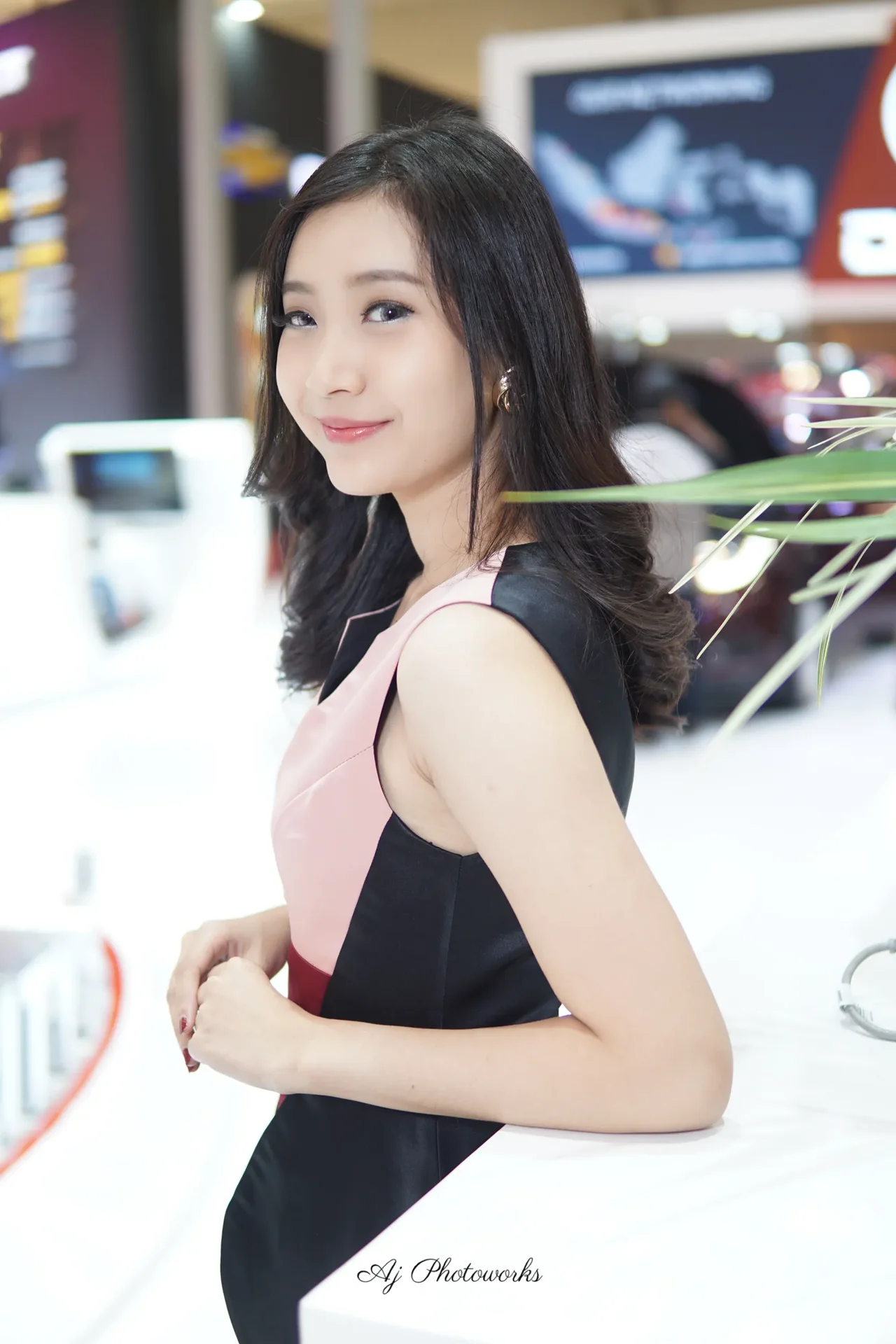 Elegance meets modernity in this striking portrait of a woman in a structured pink dress, set against the vibrant hum of a bustling exhibition hall.