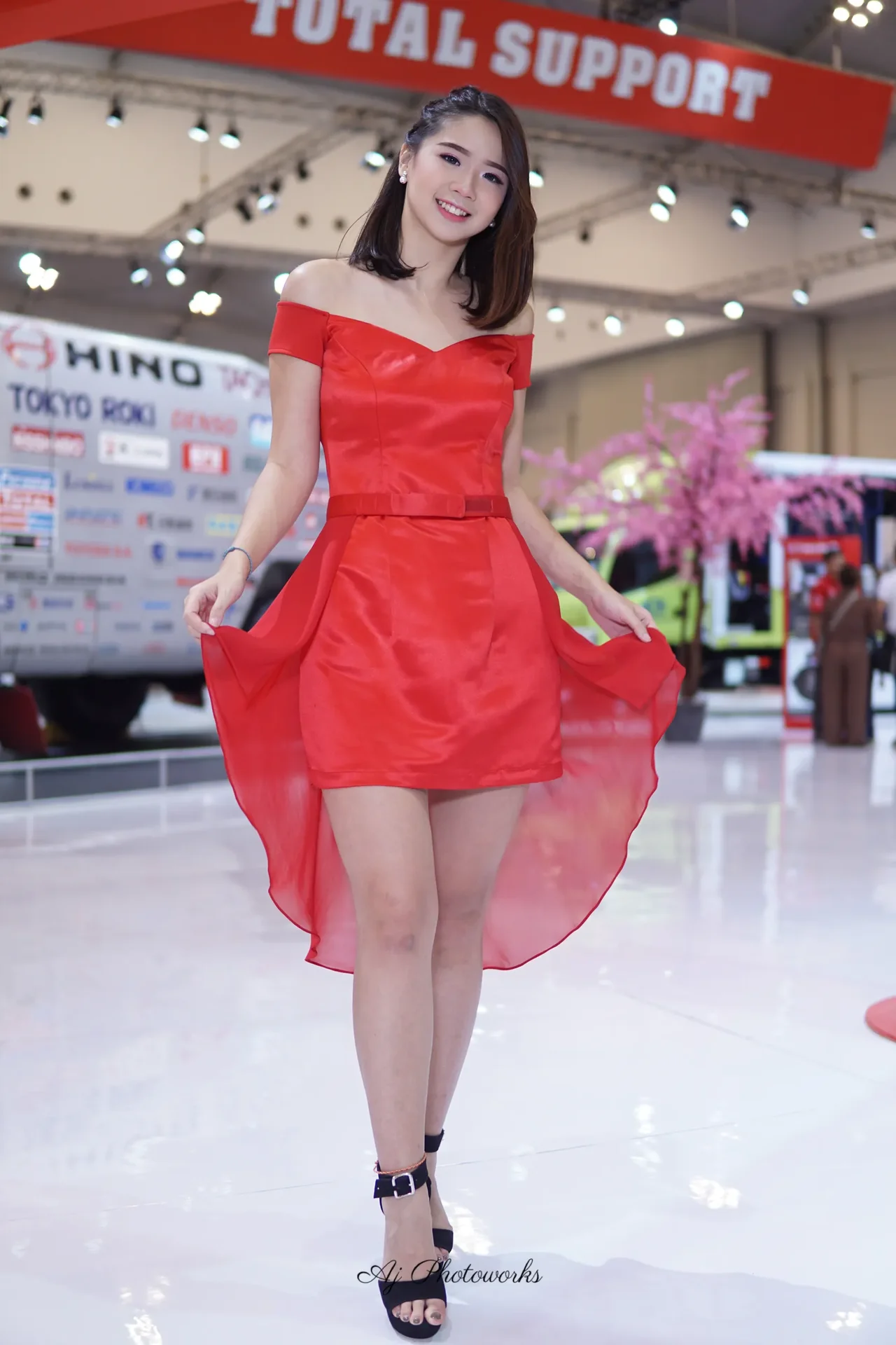 a radiant portrait of elegance and confidence in a vivid red ensemble at a bustling trade show