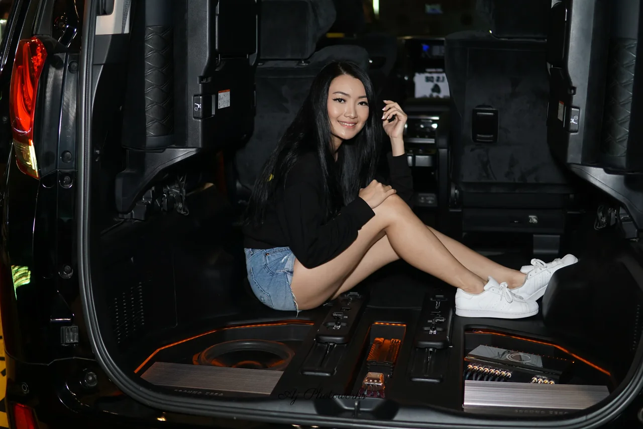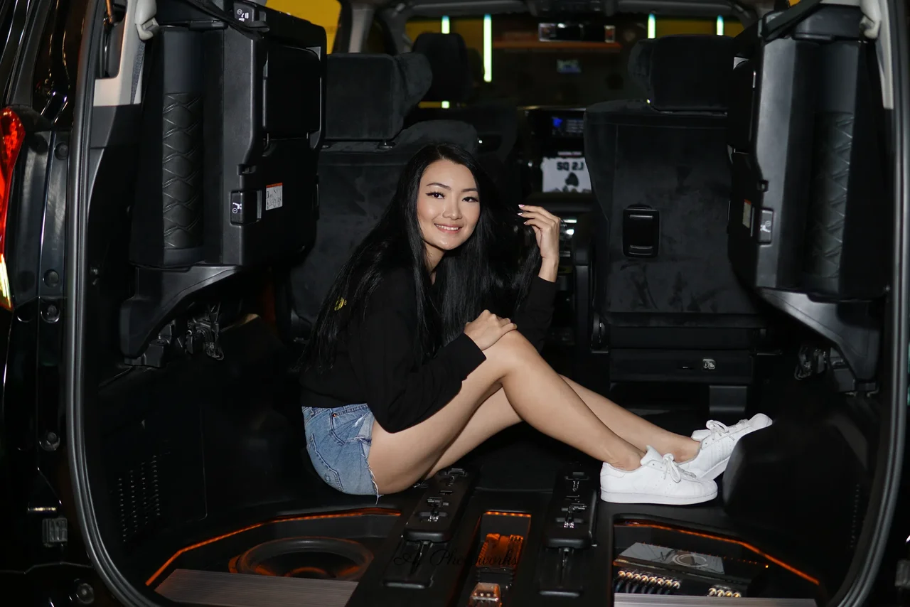 A young woman sits confidently in a high-end car trunk with orange LED lighting, blending monochrome style with vibrant accents.