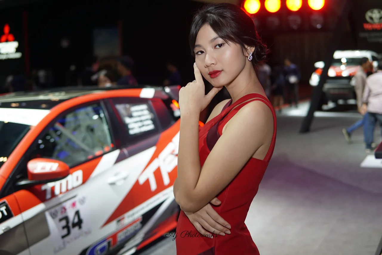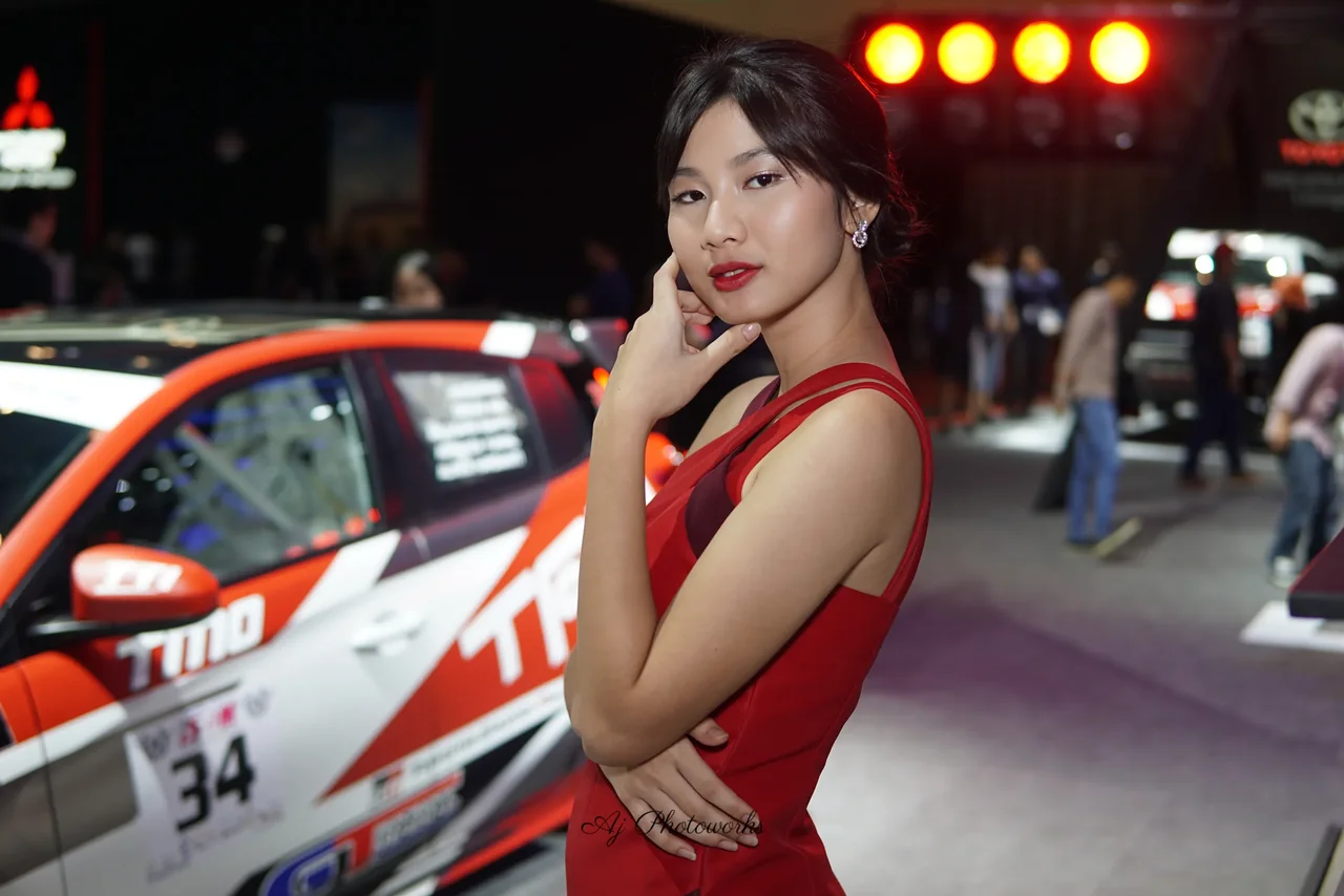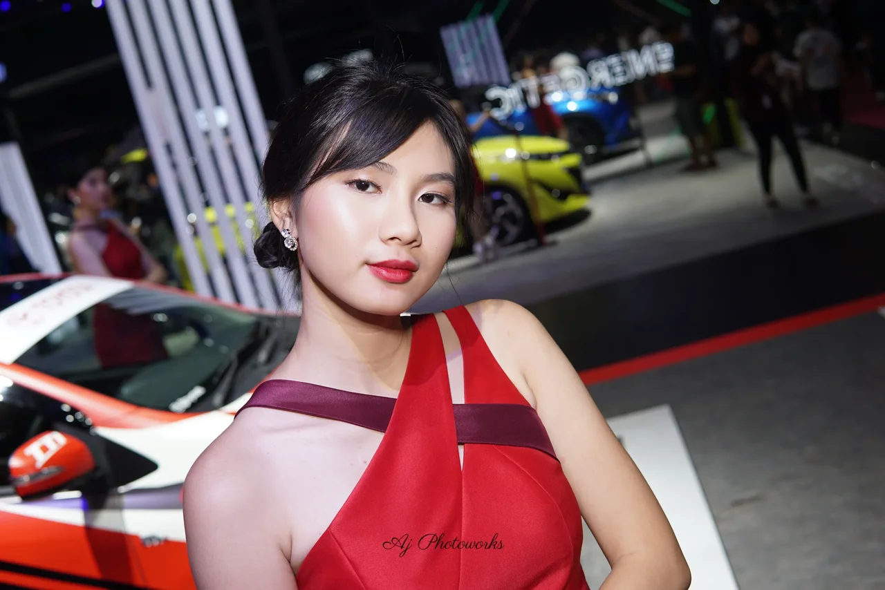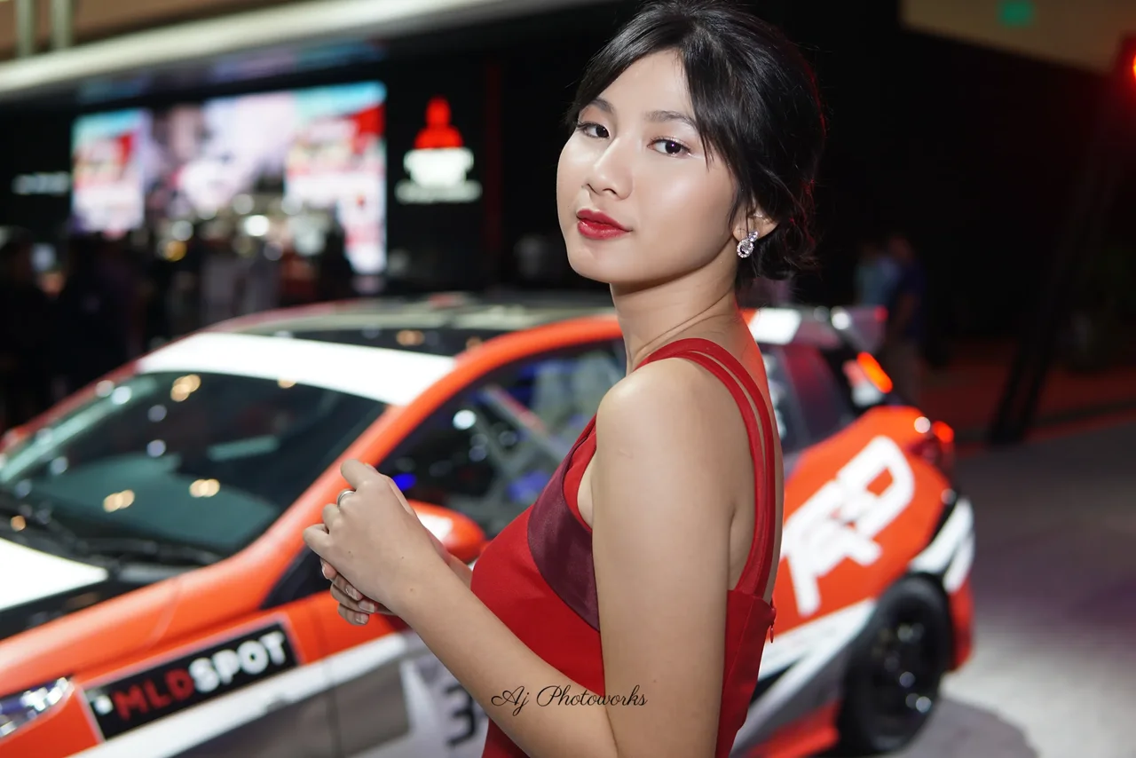 A woman in a bold red and maroon dress poses confidently at a car exhibition, surrounded by vibrantly colored sports cars and dynamic event lighting.