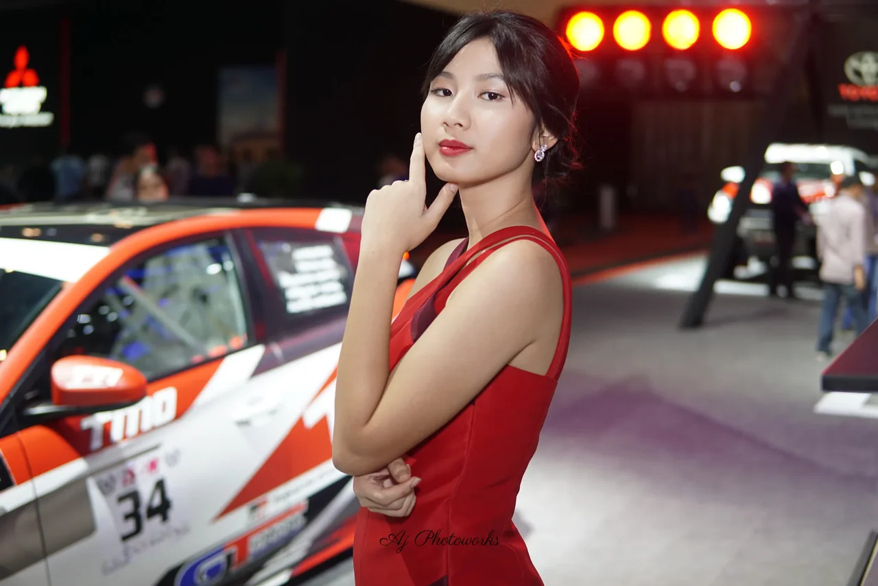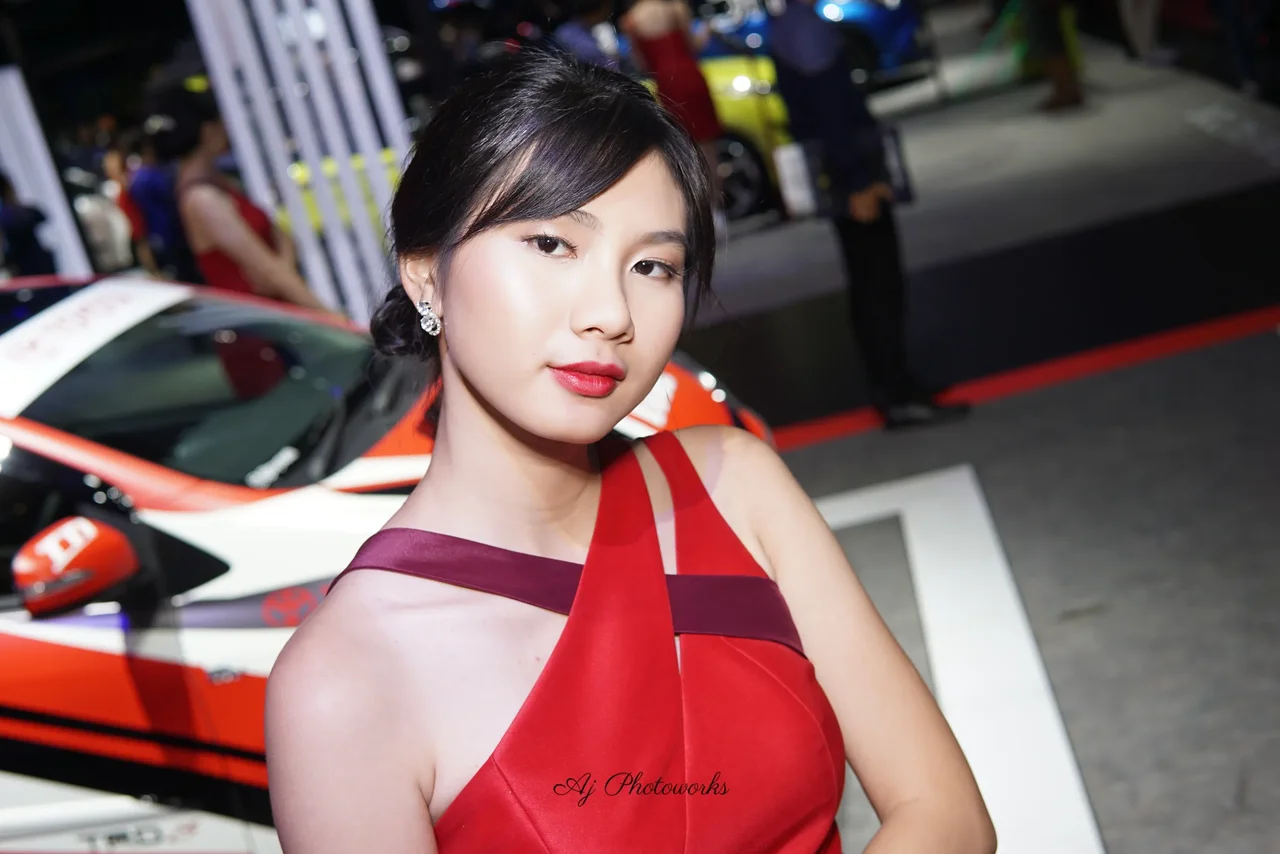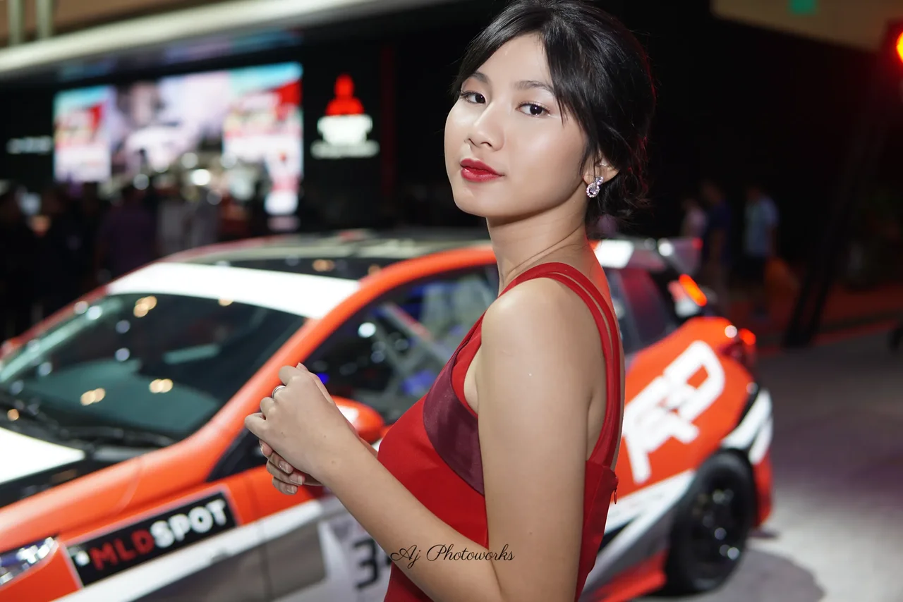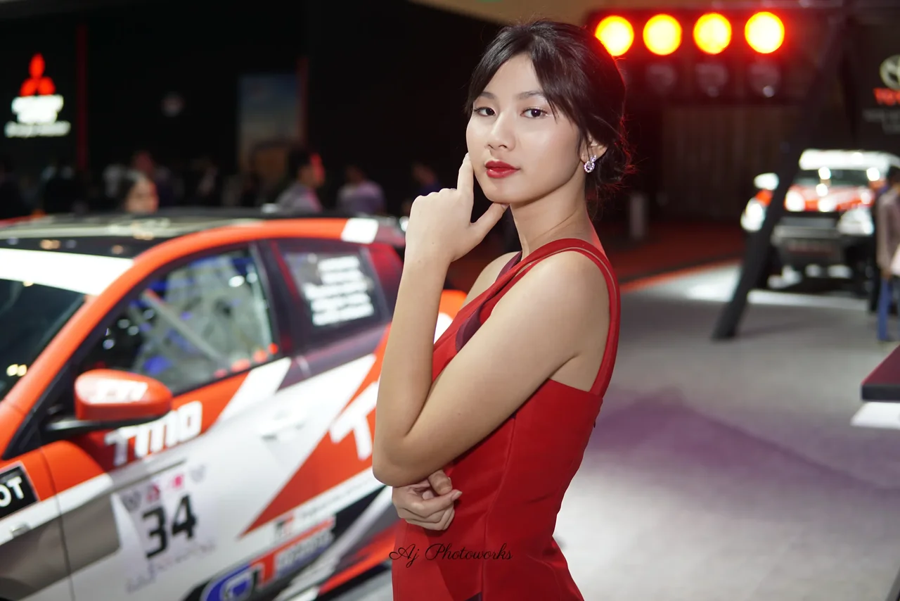 A woman in a bold red and maroon dress poses confidently at a car exhibition, surrounded by vibrantly colored sports cars and dynamic event lighting.