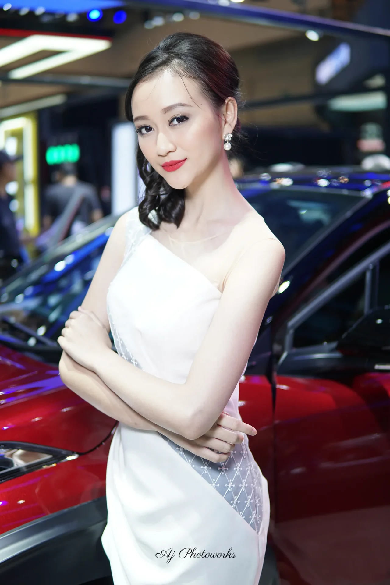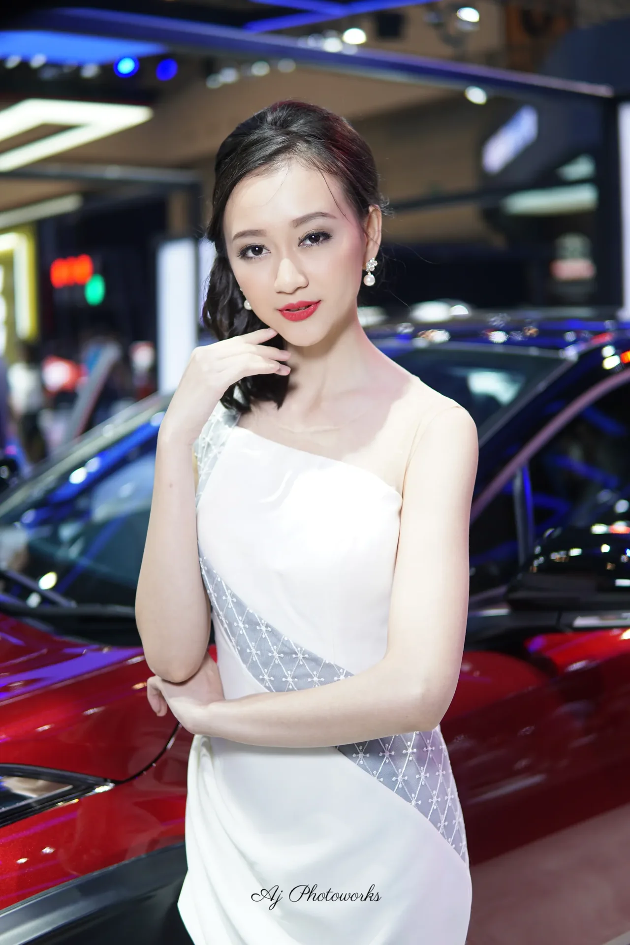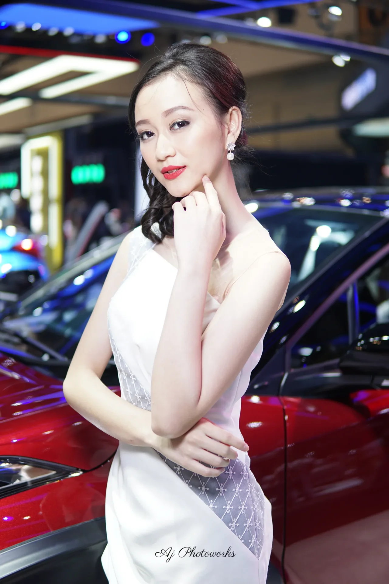 A model gracefully poses beside a sleek red sports car in a vibrant showroom, her elegant white dress contrasting the bold automotive backdrop.