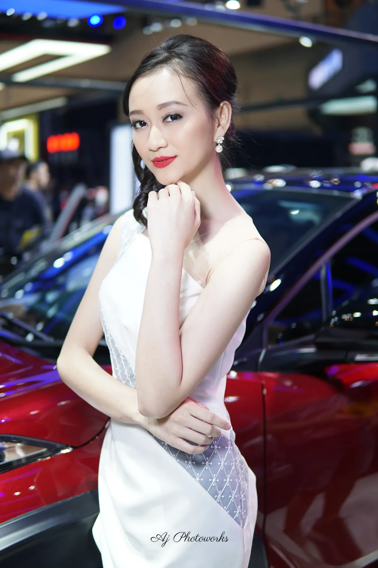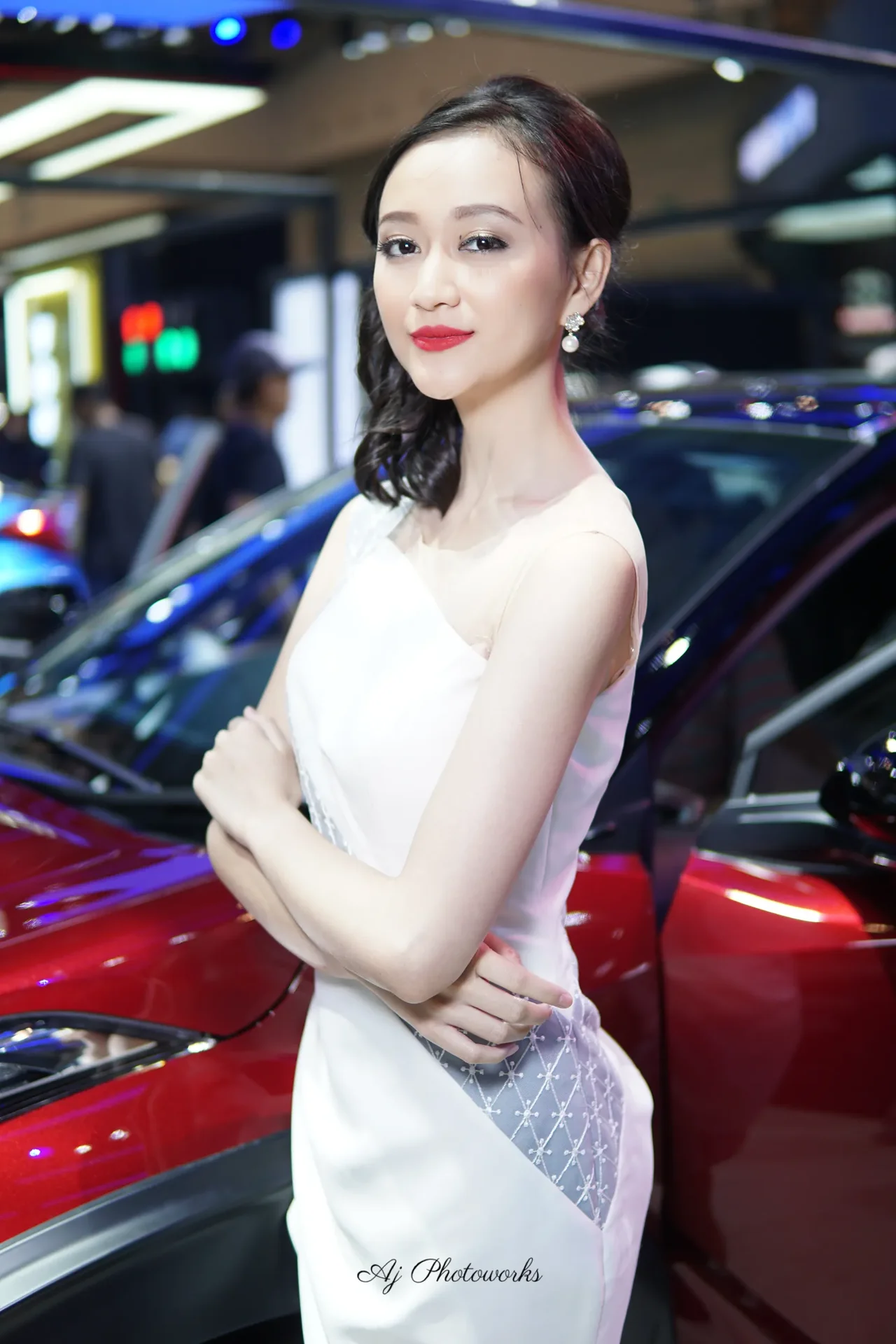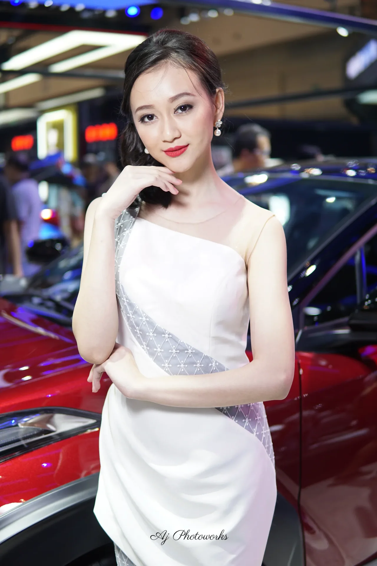 A model gracefully poses beside a sleek red sports car in a vibrant showroom, her elegant white dress contrasting the bold automotive backdrop.