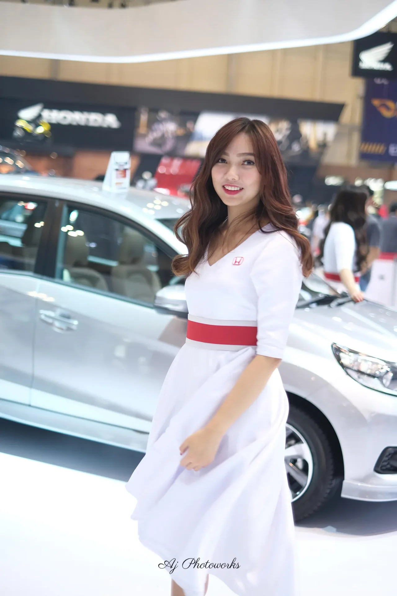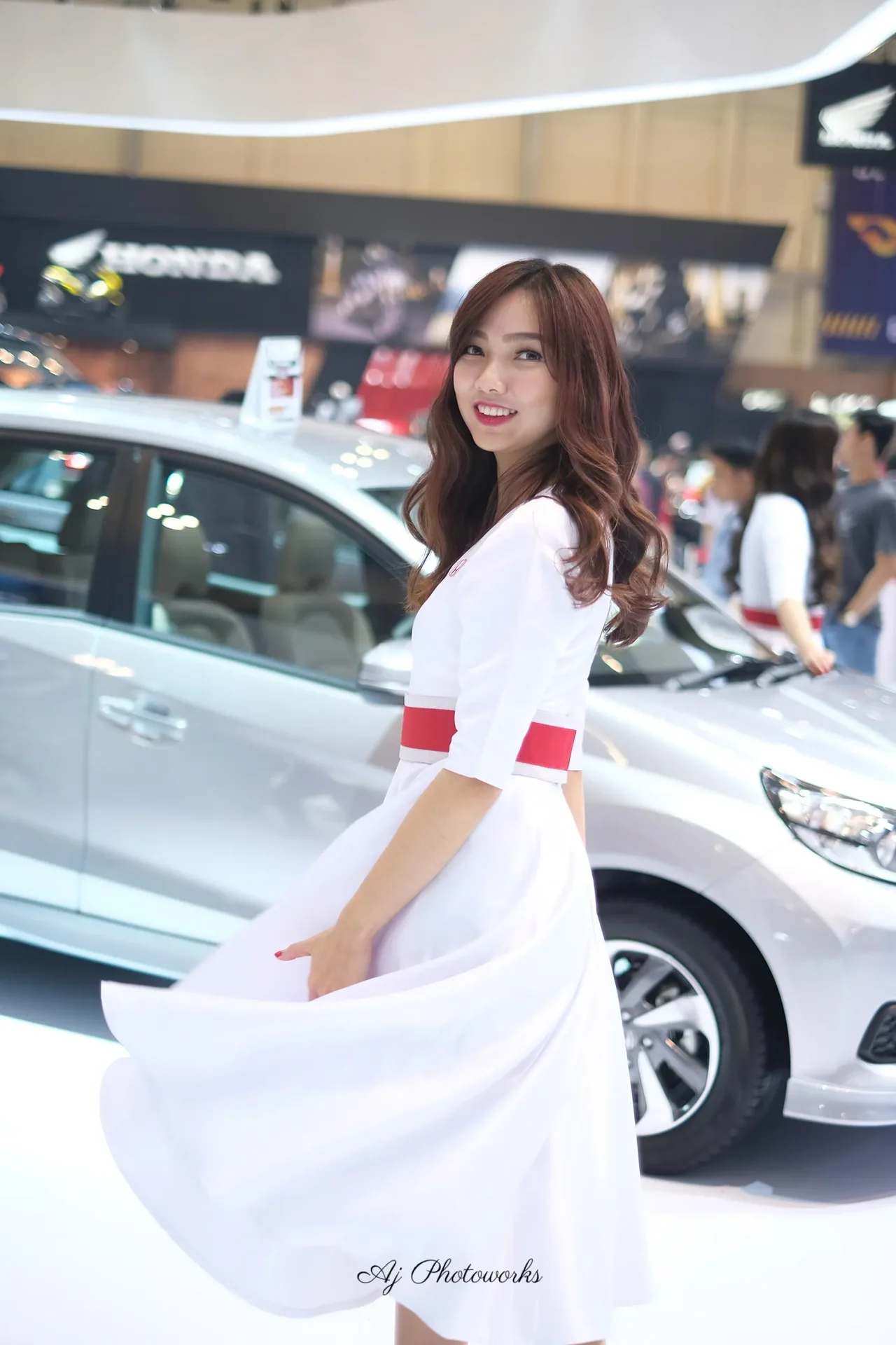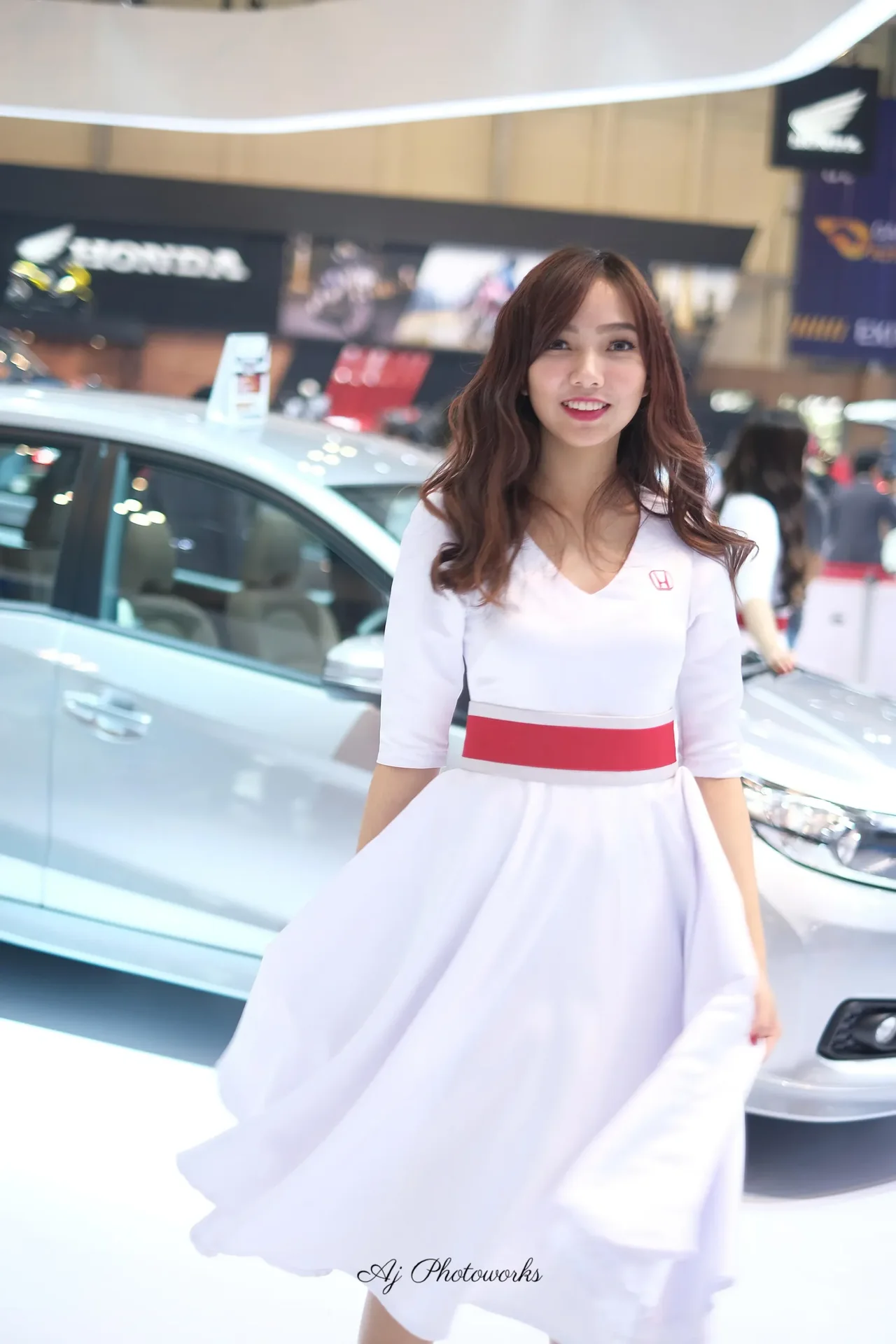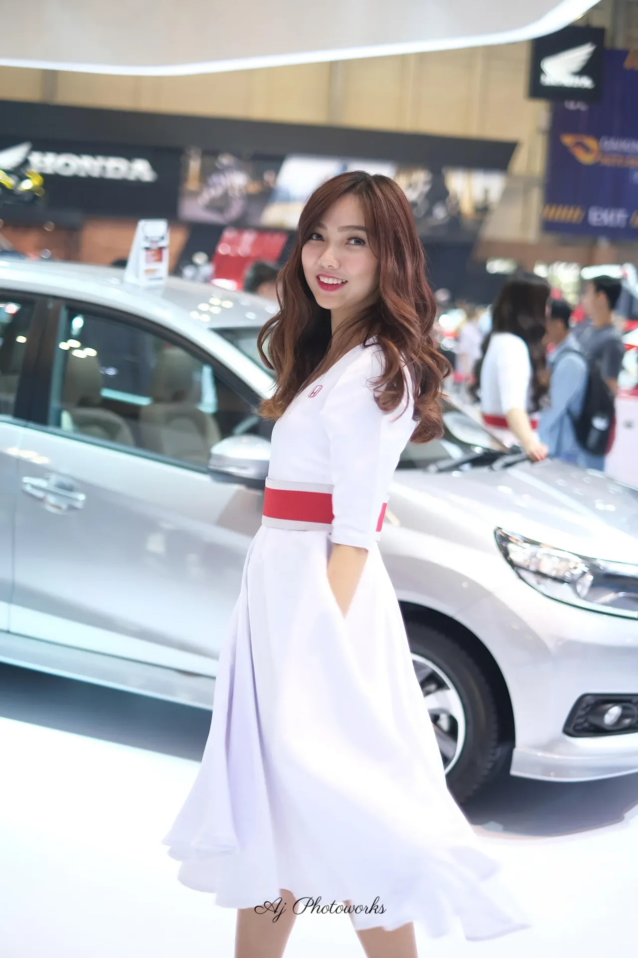 A woman in a white dress with a red waistband stands confidently at a car show, surrounded by sleek automobiles and vibrant event banners, embodying a blend of elegance and dynamic energy.