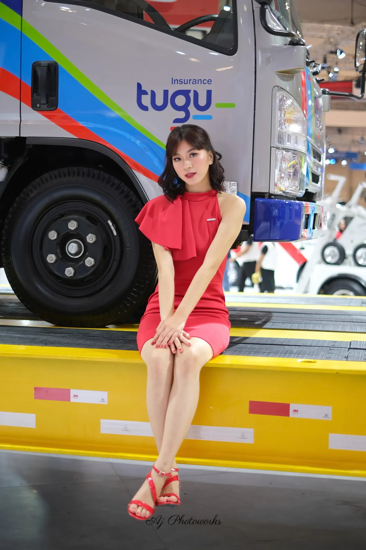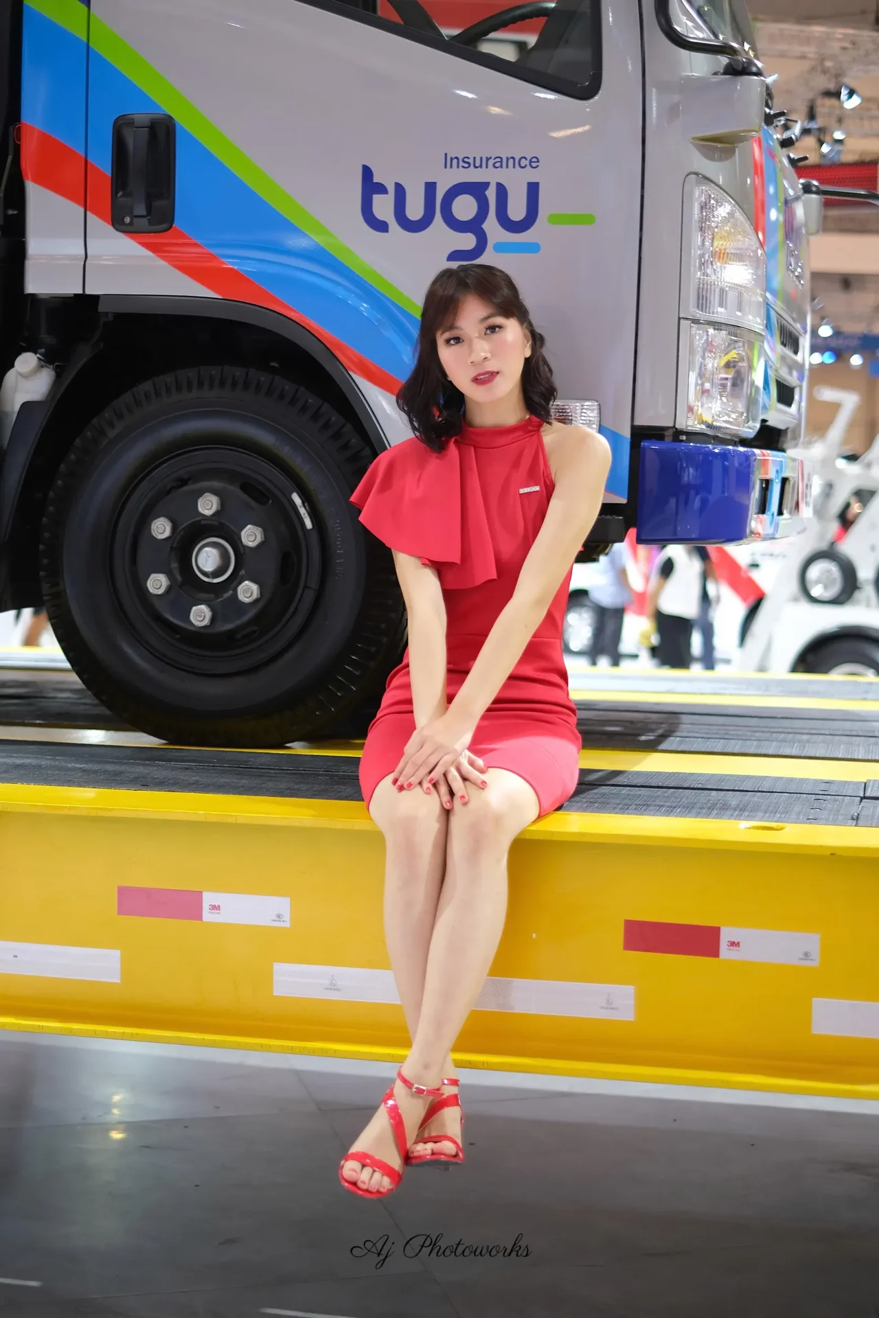 A vibrant fashion shoot featuring a red-clad model beside a stylized promotional truck at an indoor trade show, emphasizing bold colors and confident aesthetics.