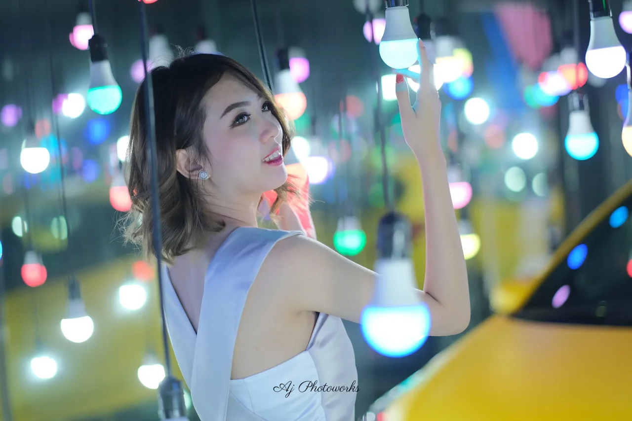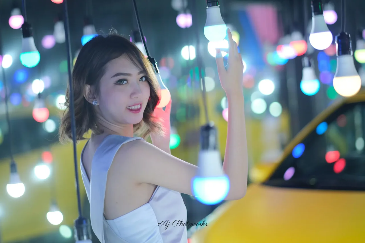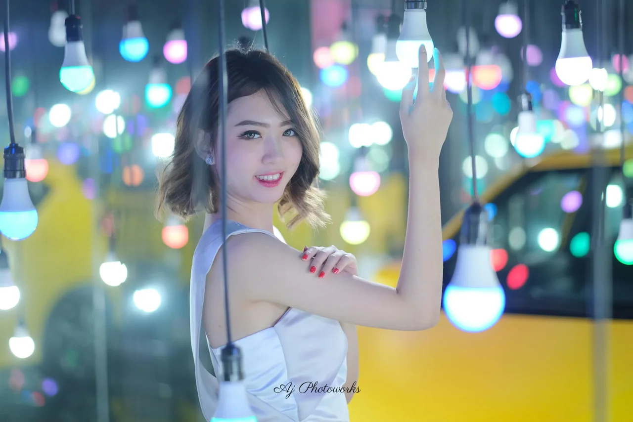A woman interacts with colorful, suspended light bulbs in a vibrant urban night setting, blending modern fashion with surreal neon ambiance.