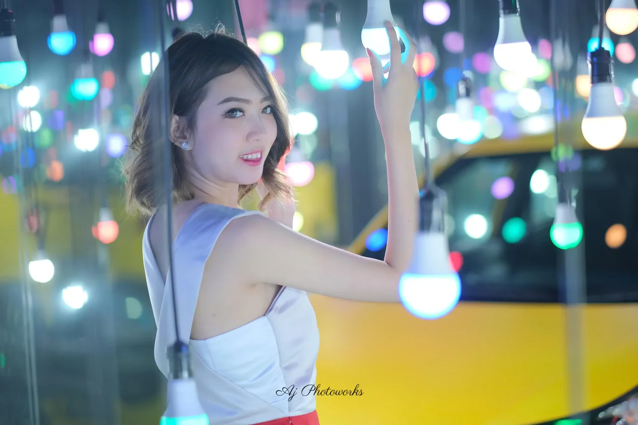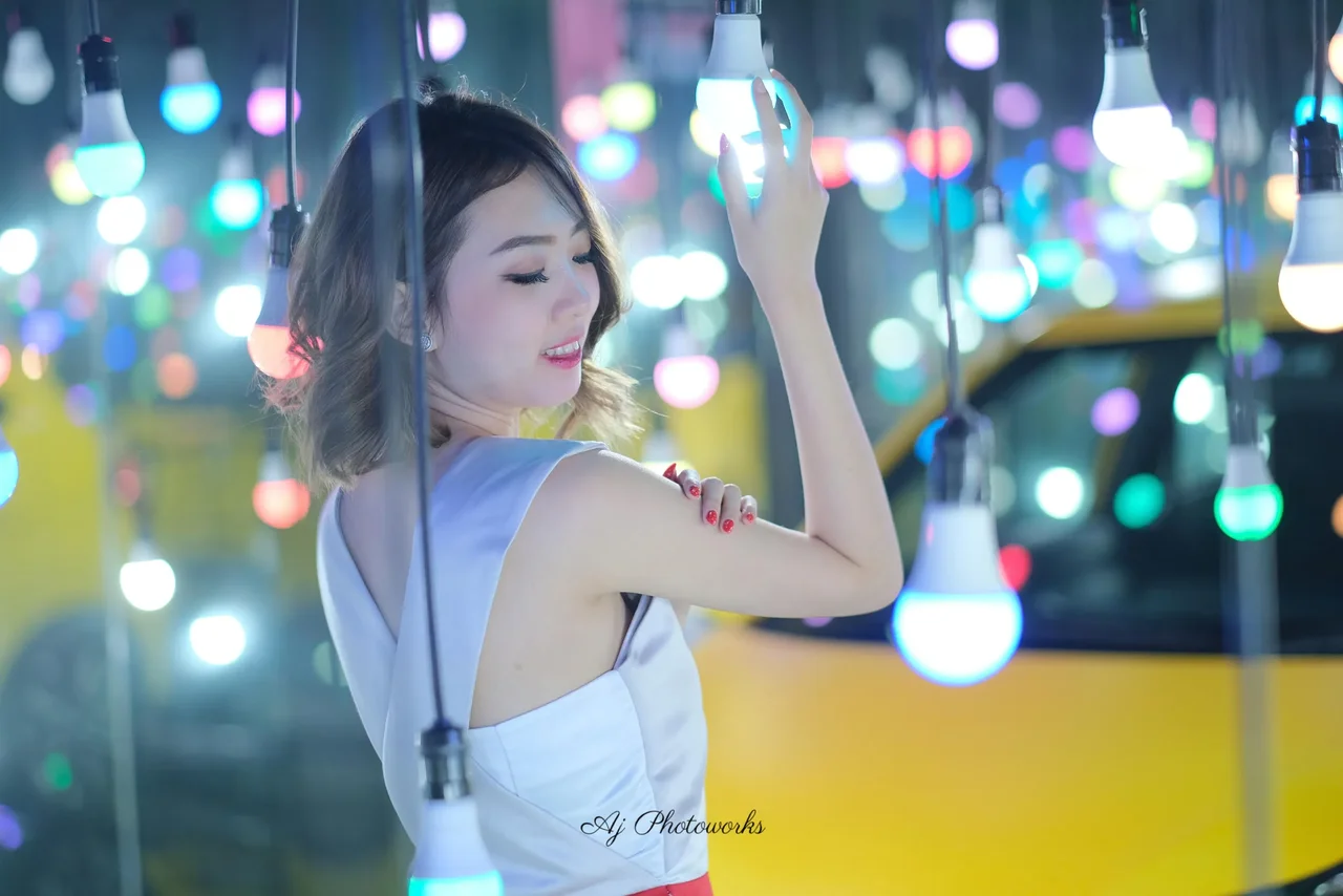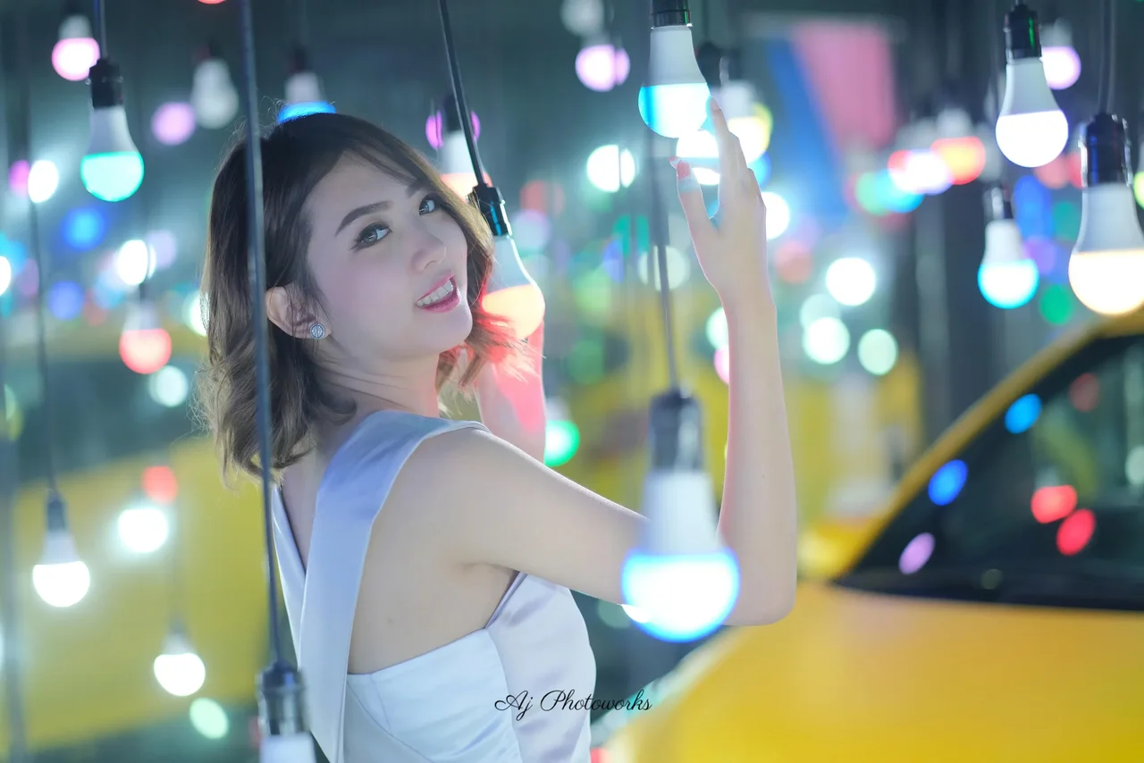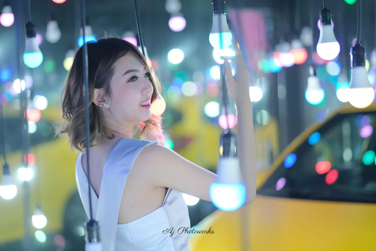 A woman interacts with colorful, suspended light bulbs in a vibrant urban night setting, blending modern fashion with surreal neon ambiance.