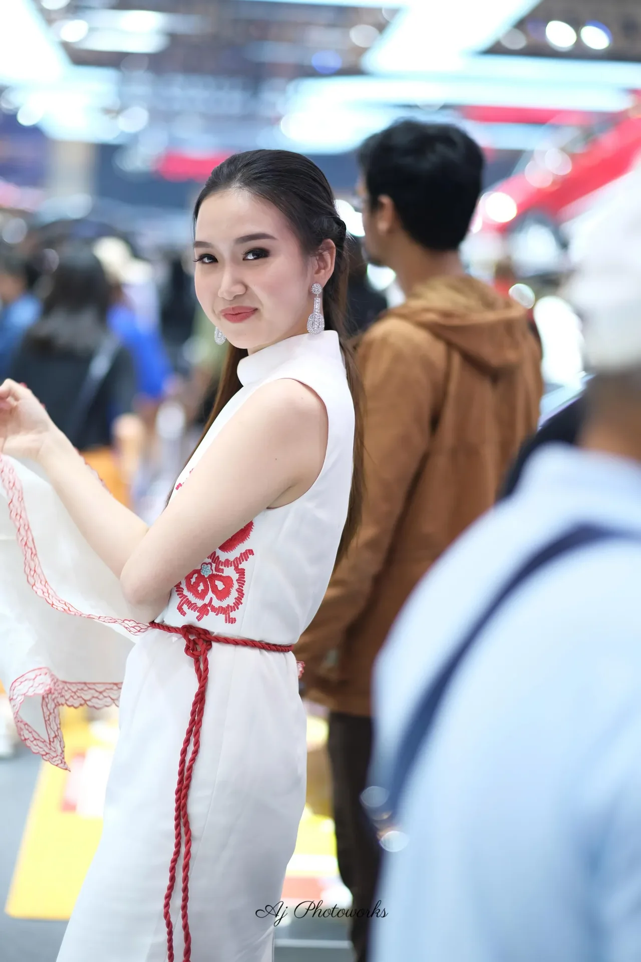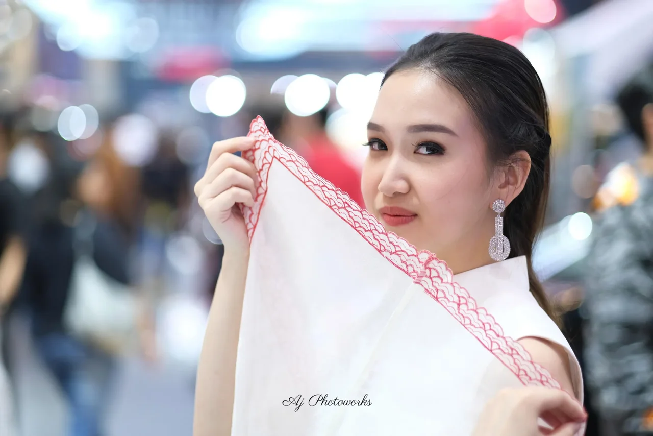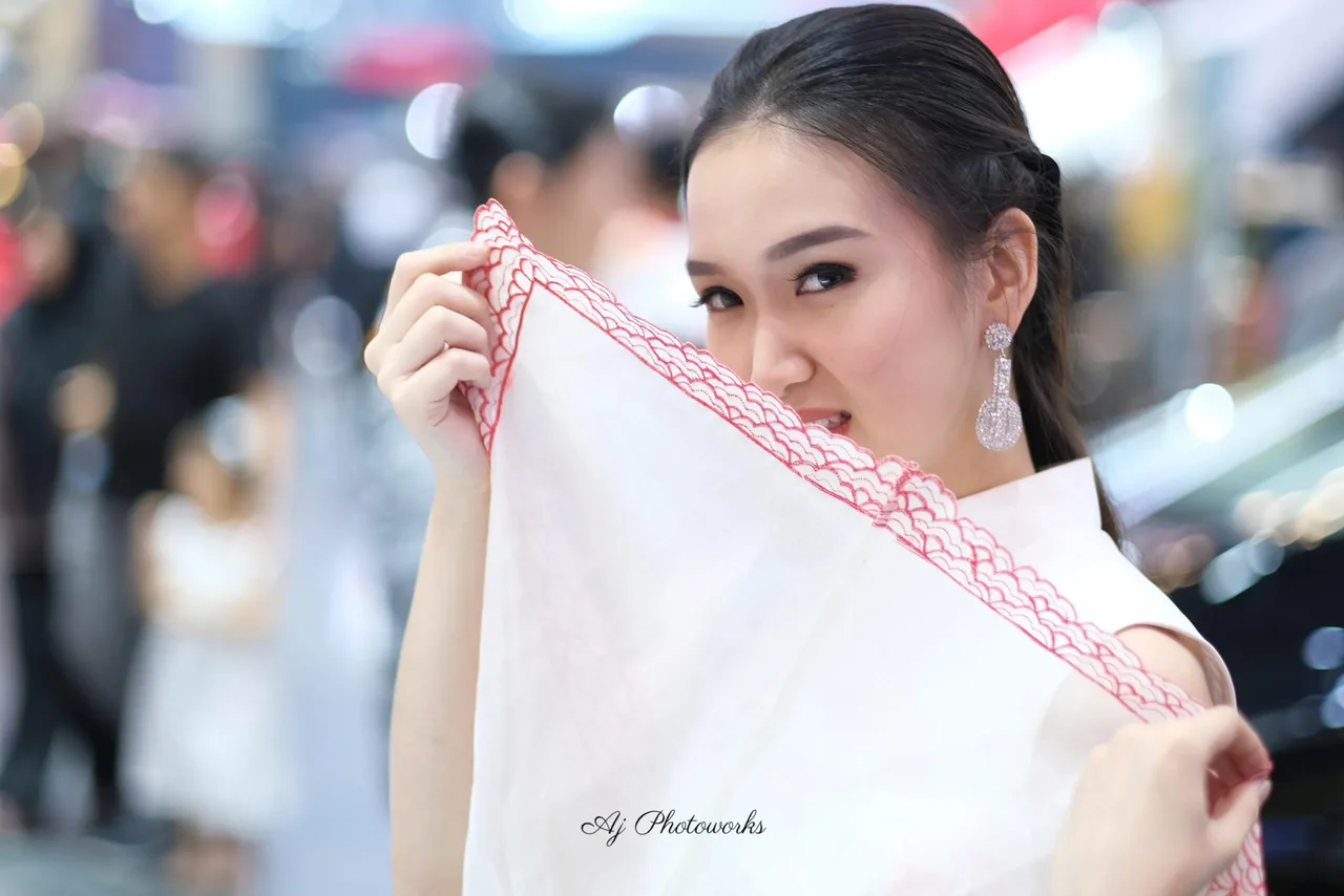 Elegance in tradition meets modern elegance as a confident woman showcases a white lace-trimmed dress adorned with red embroidery and a matching sash, set against the vibrant backdrop of an indoor automotive event.