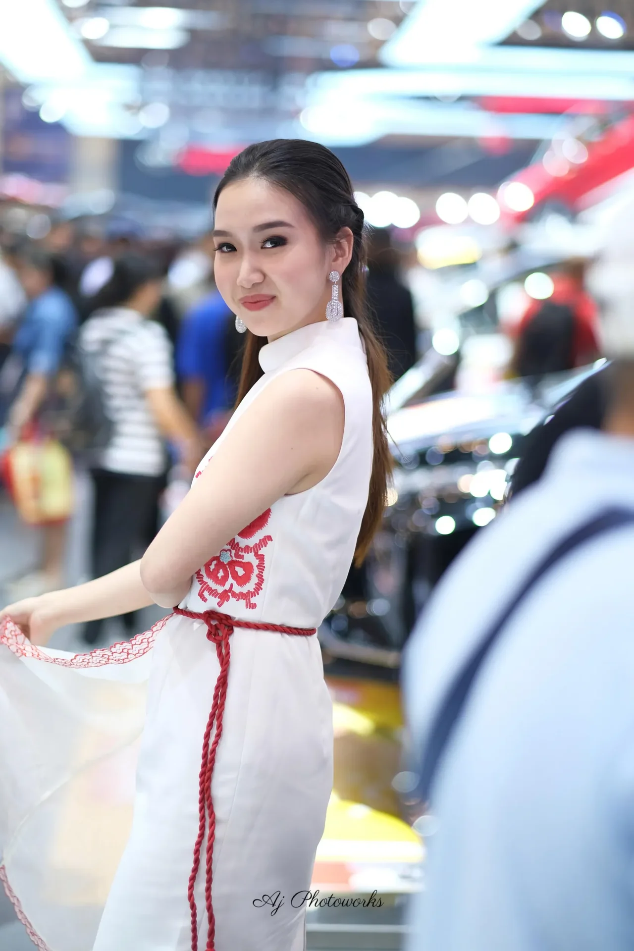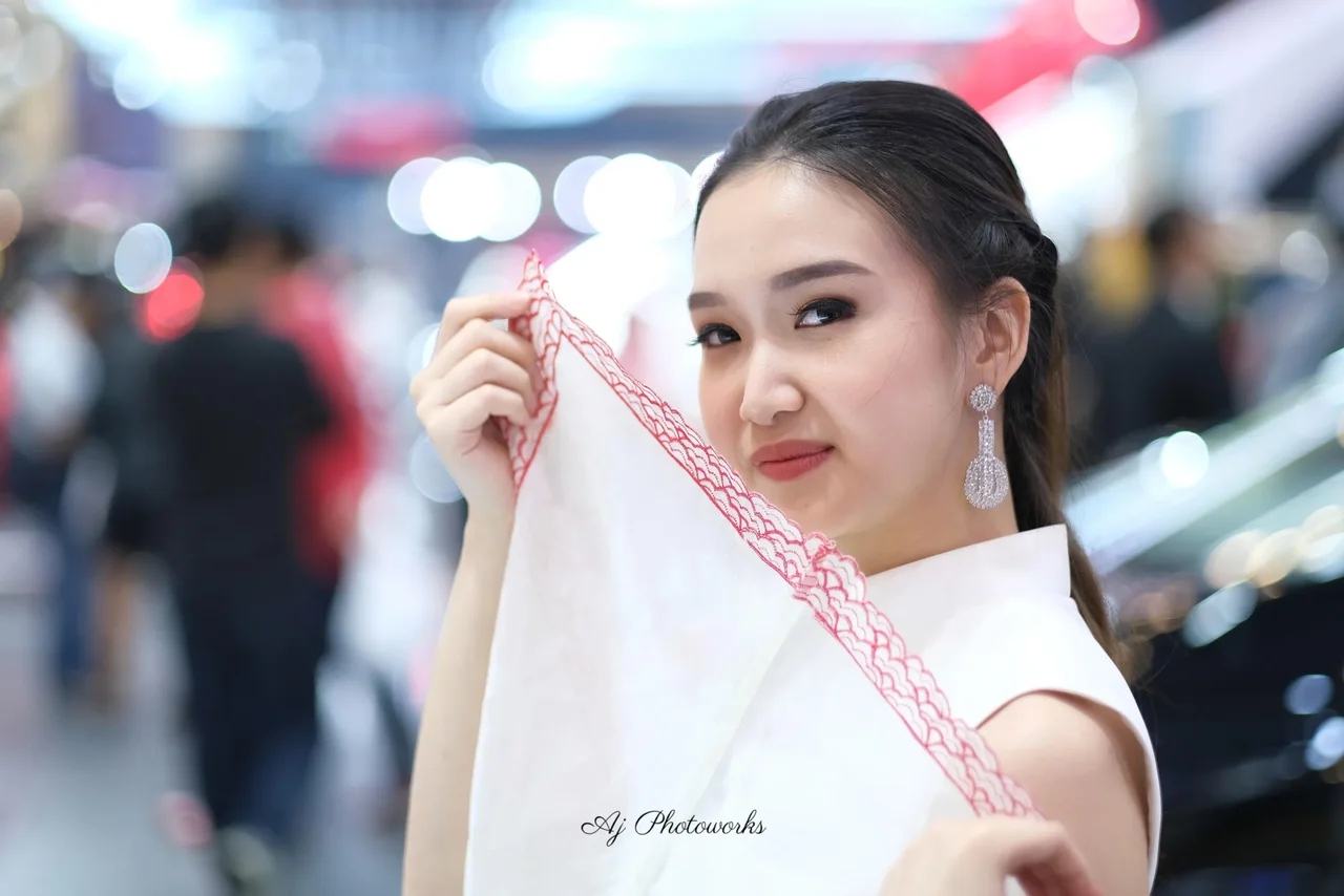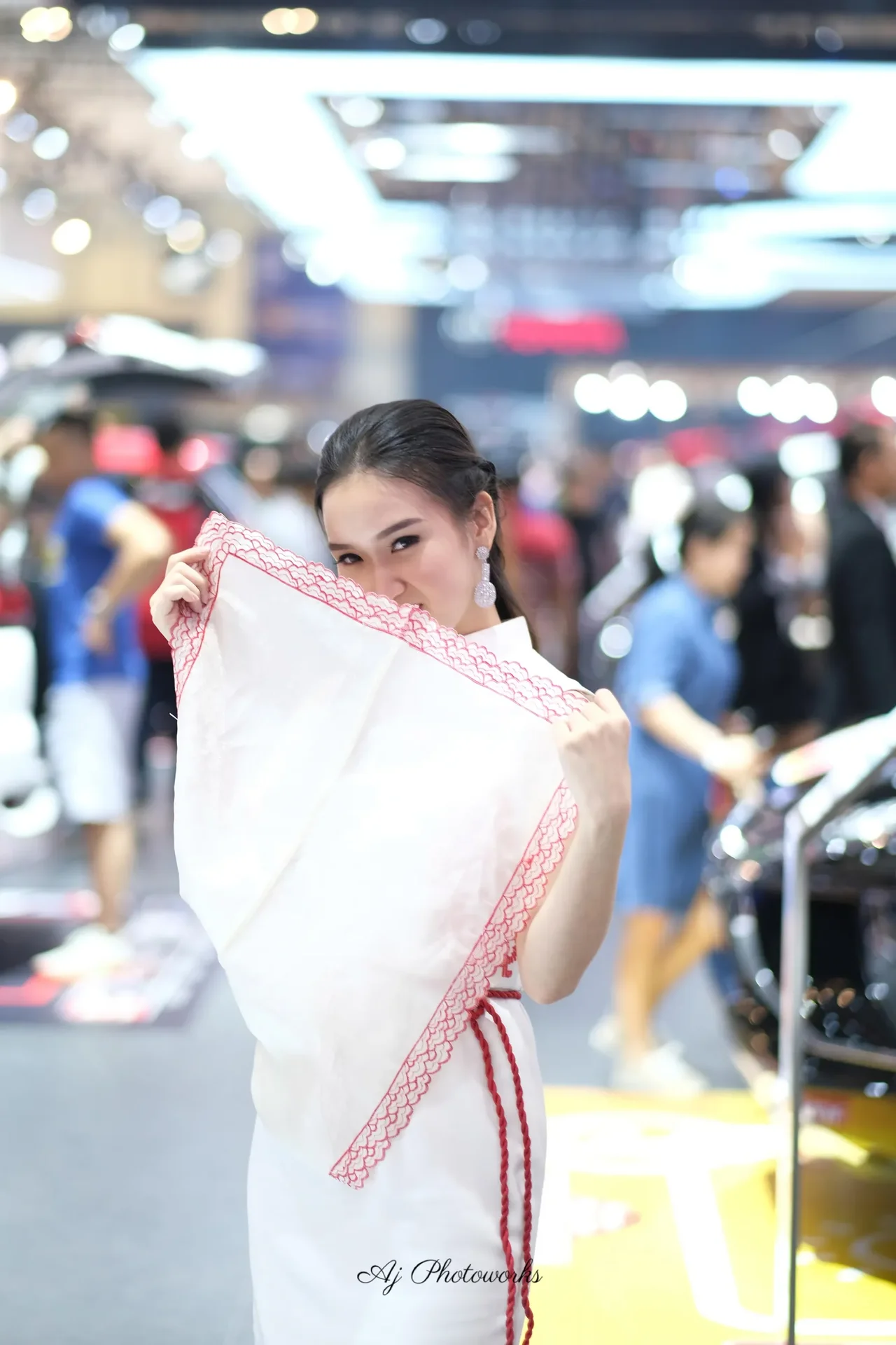 Elegance in tradition meets modern elegance as a confident woman showcases a white lace-trimmed dress adorned with red embroidery and a matching sash, set against the vibrant backdrop of an indoor automotive event.