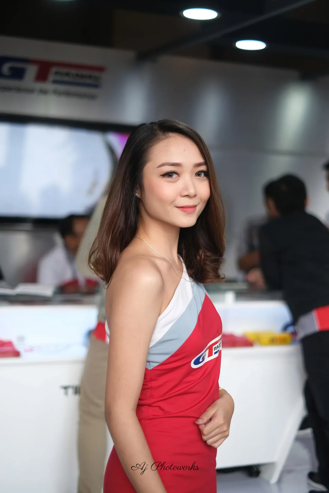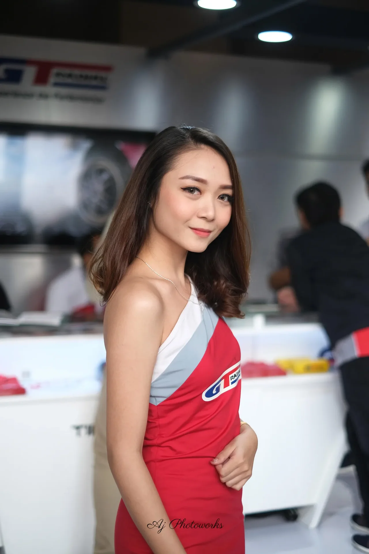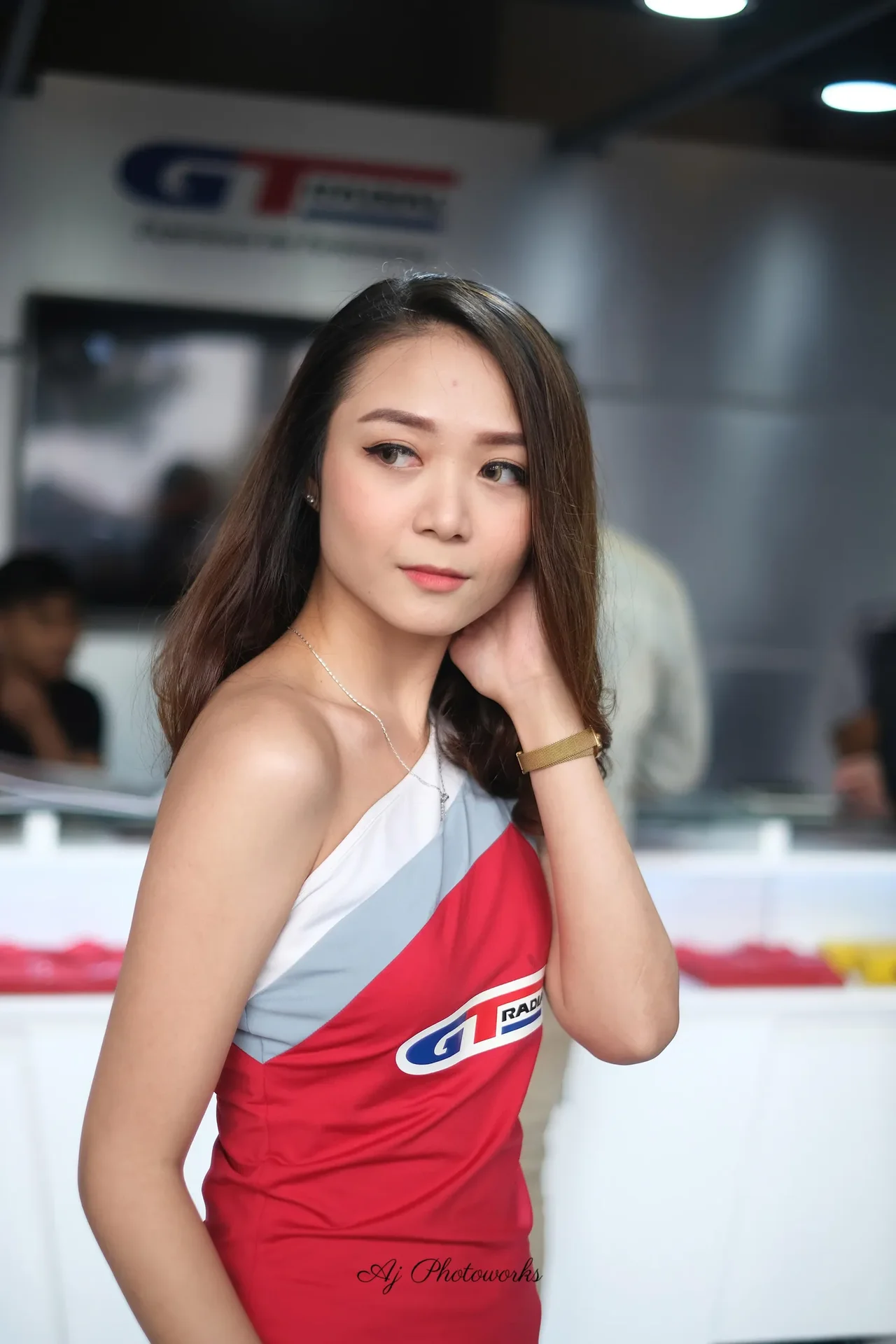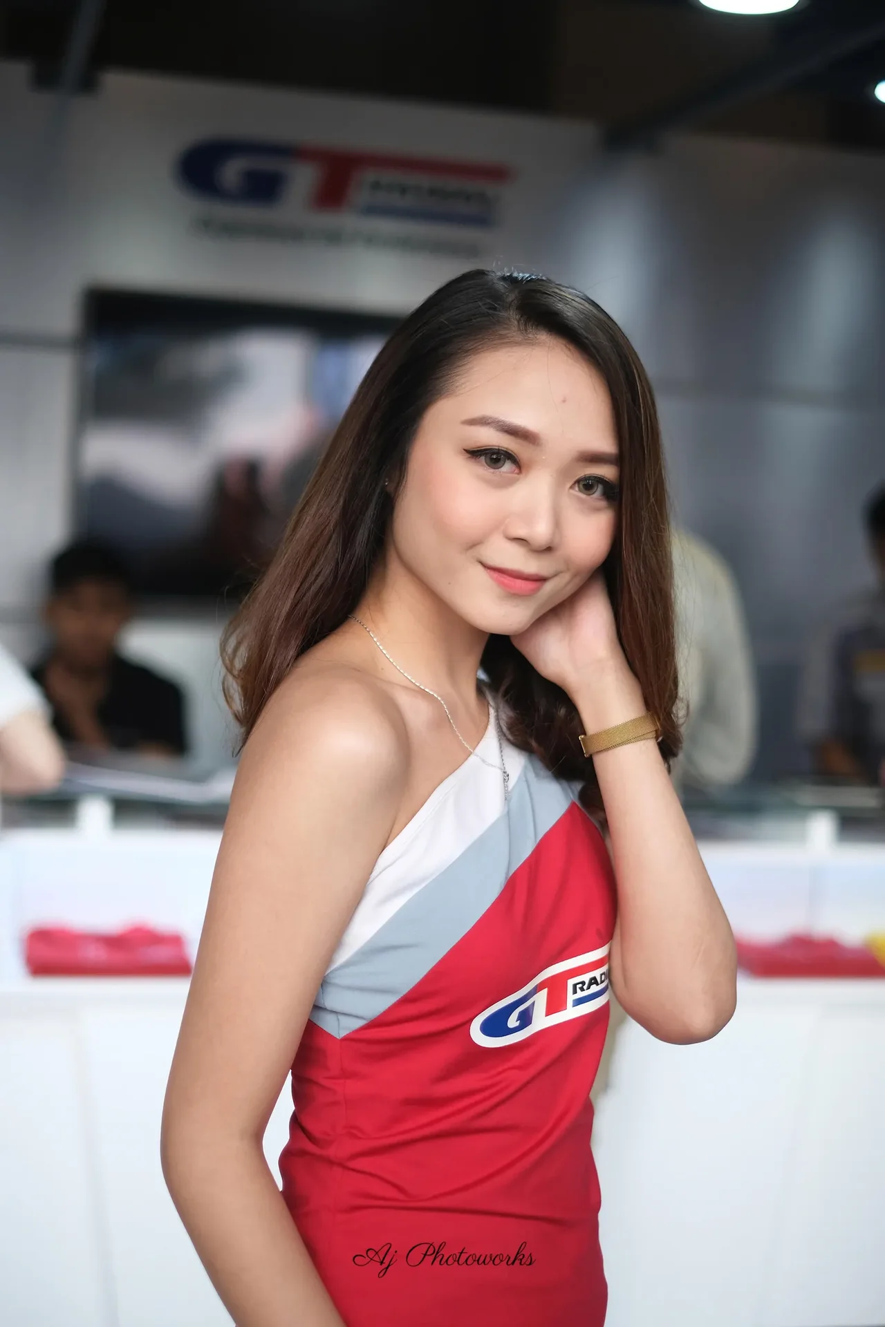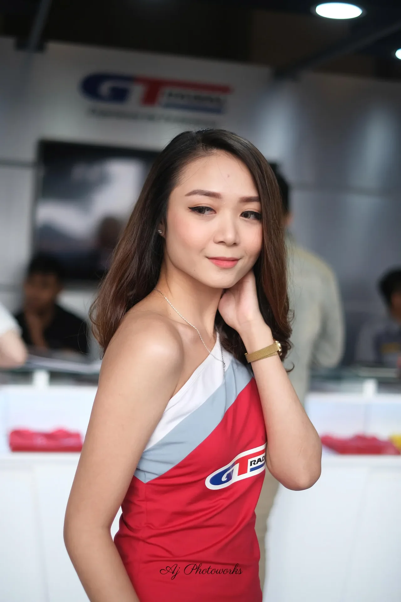 A young woman in a sleeveless red dress with white and gray accents, featuring a blue and red GT logo, accessorized with gold jewelry and hoop earrings, at a promotional event with merchandise tables and branded banners in the background.