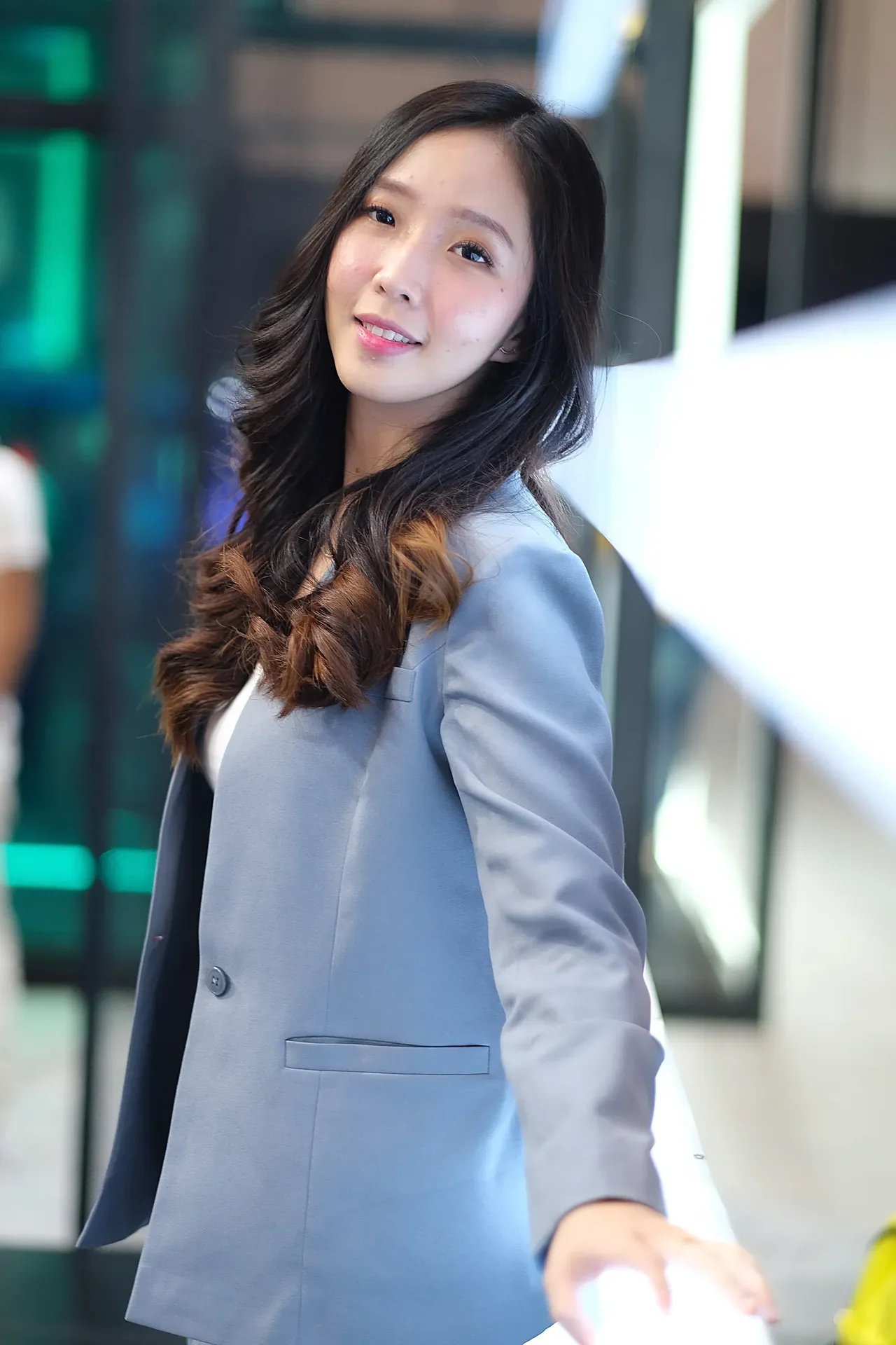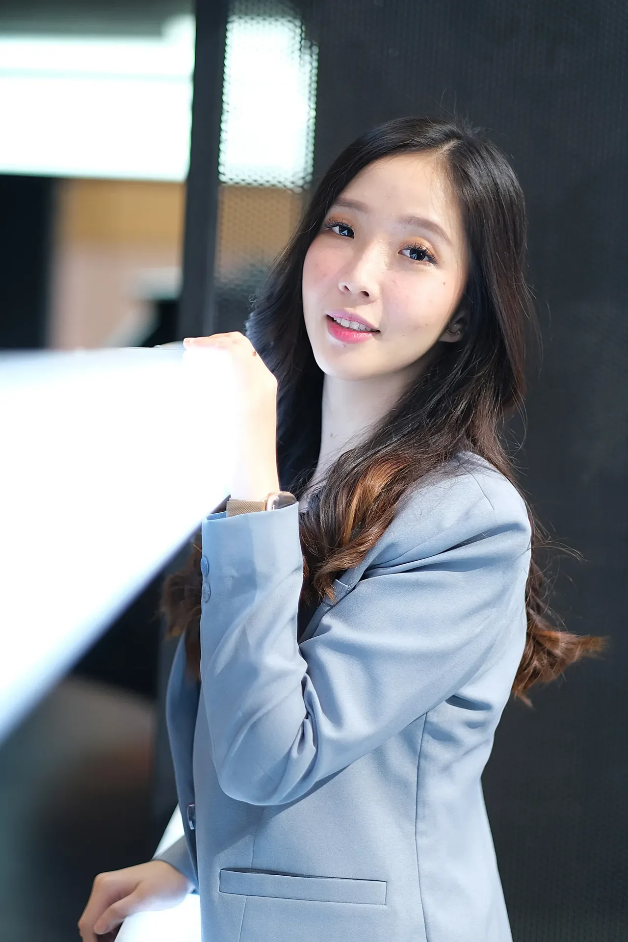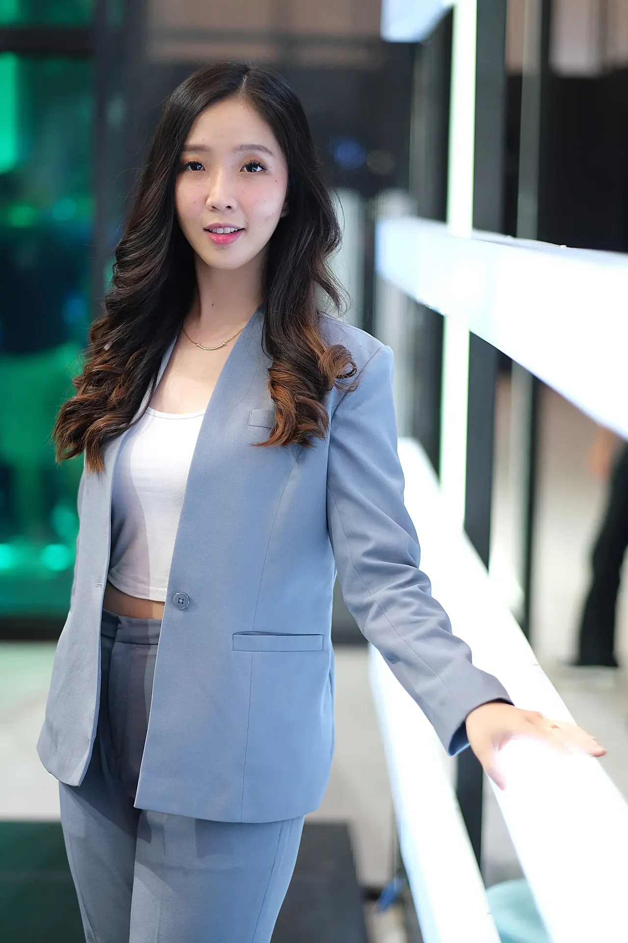 A modern professional ensemble in a high-tech workspace, blending structured elegance with contemporary design.