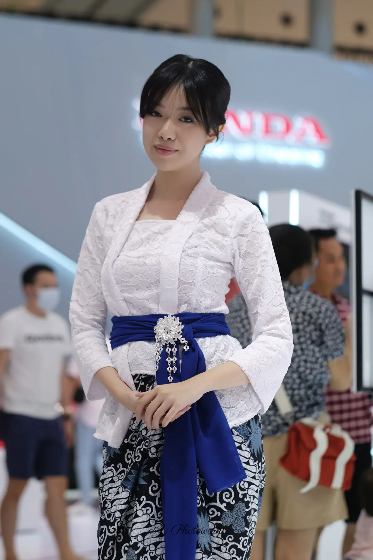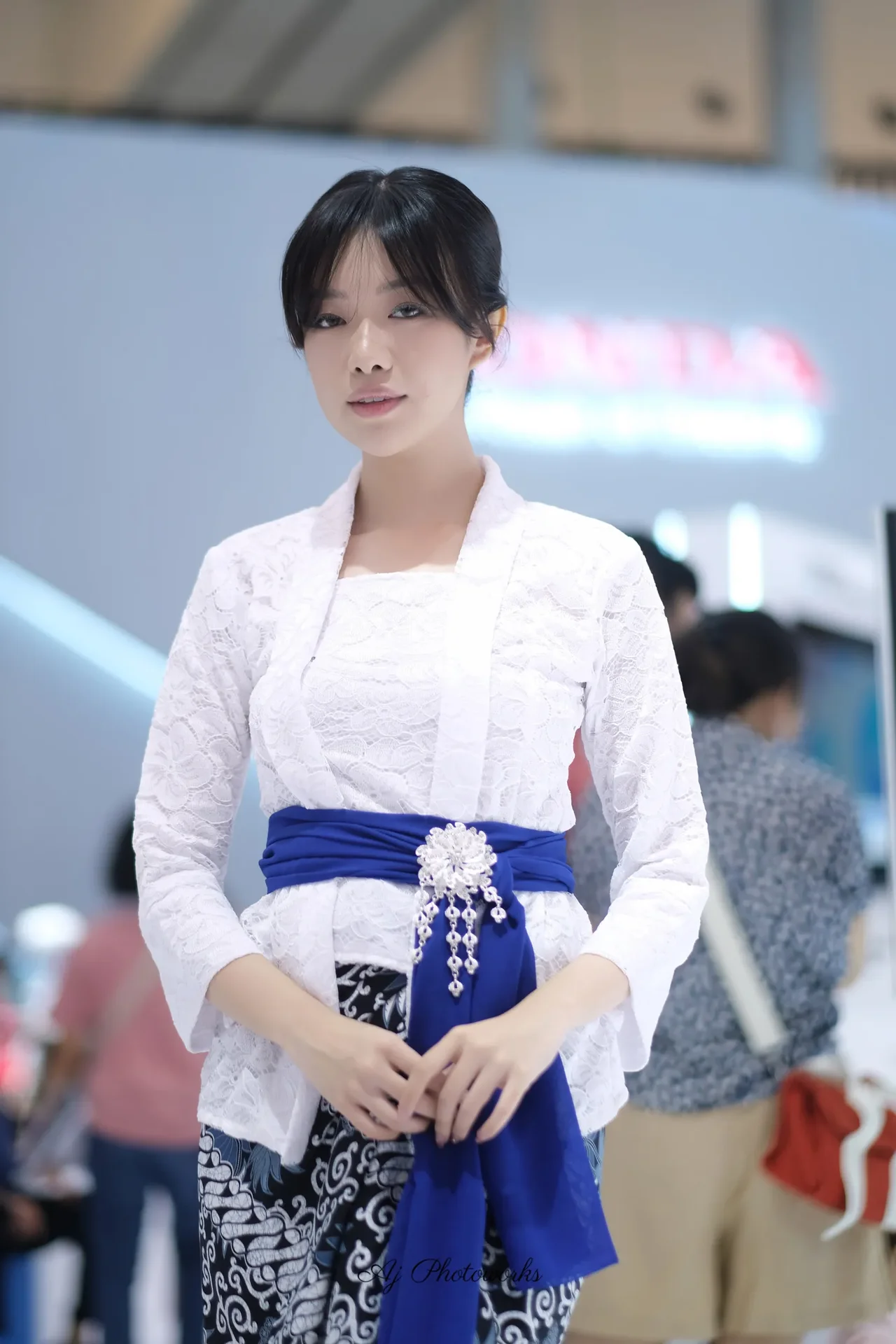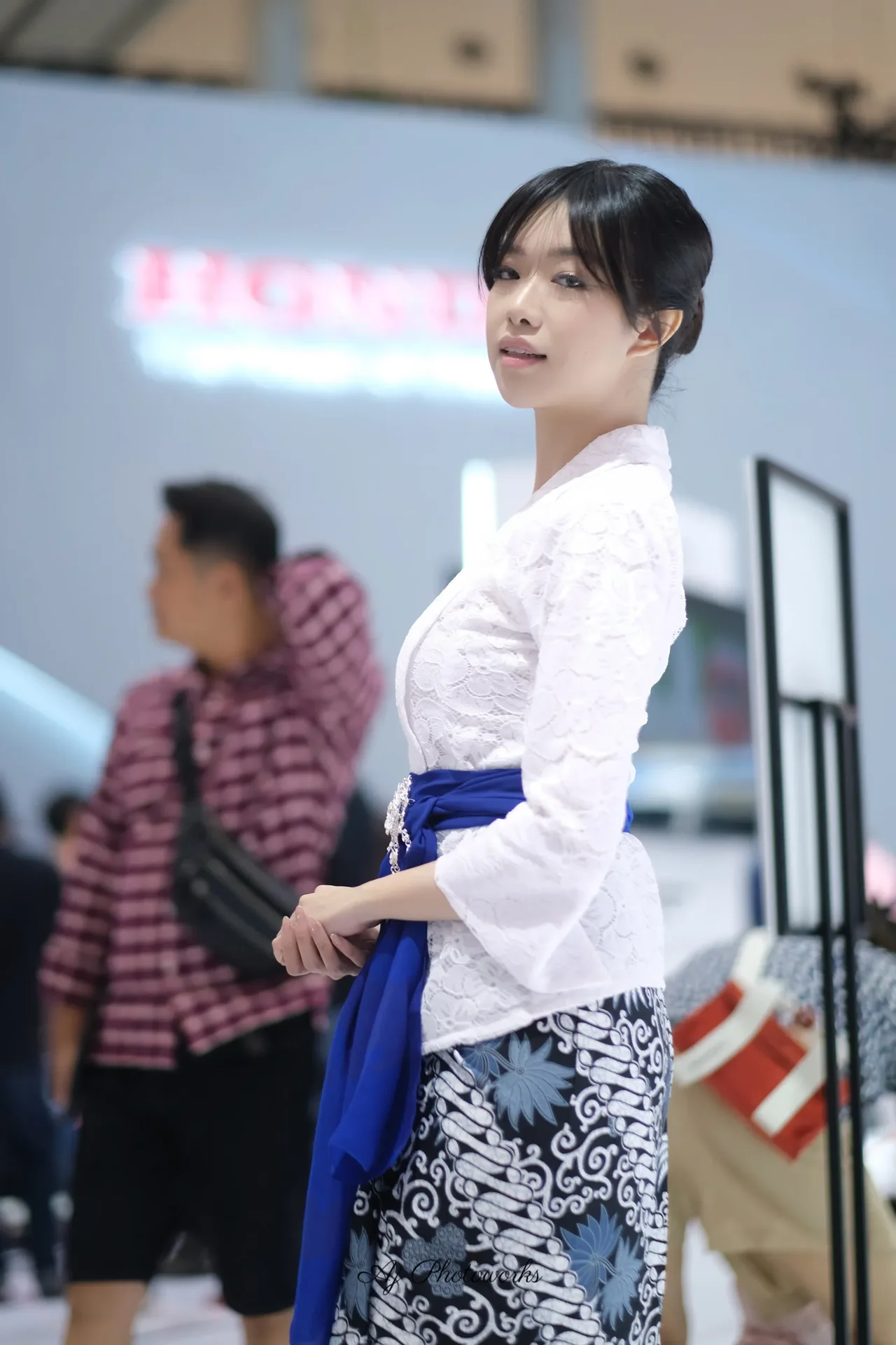 A traditional cultural attire meets modern styling in a vibrant exhibition setting.
