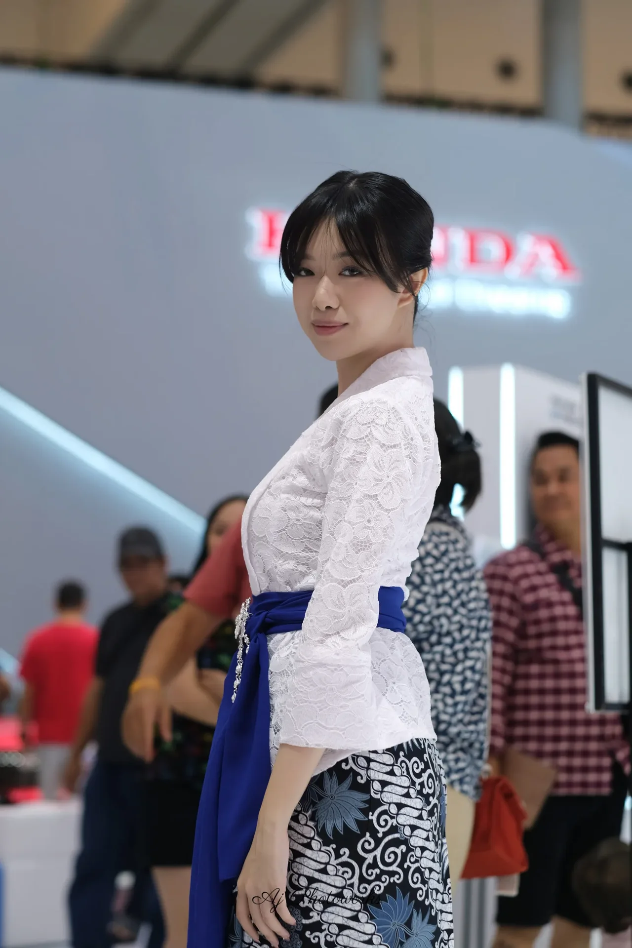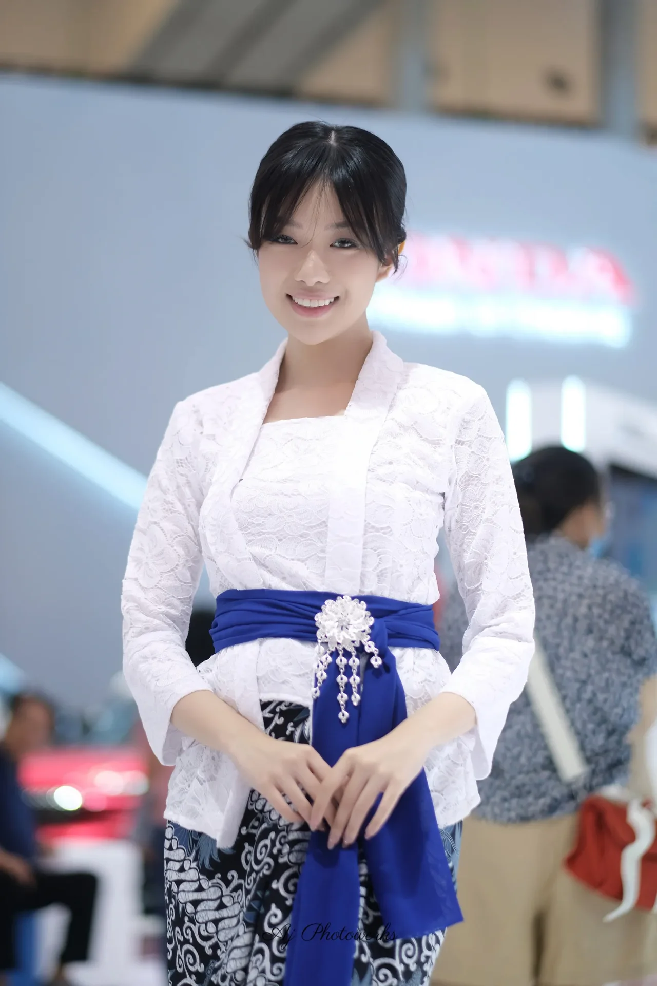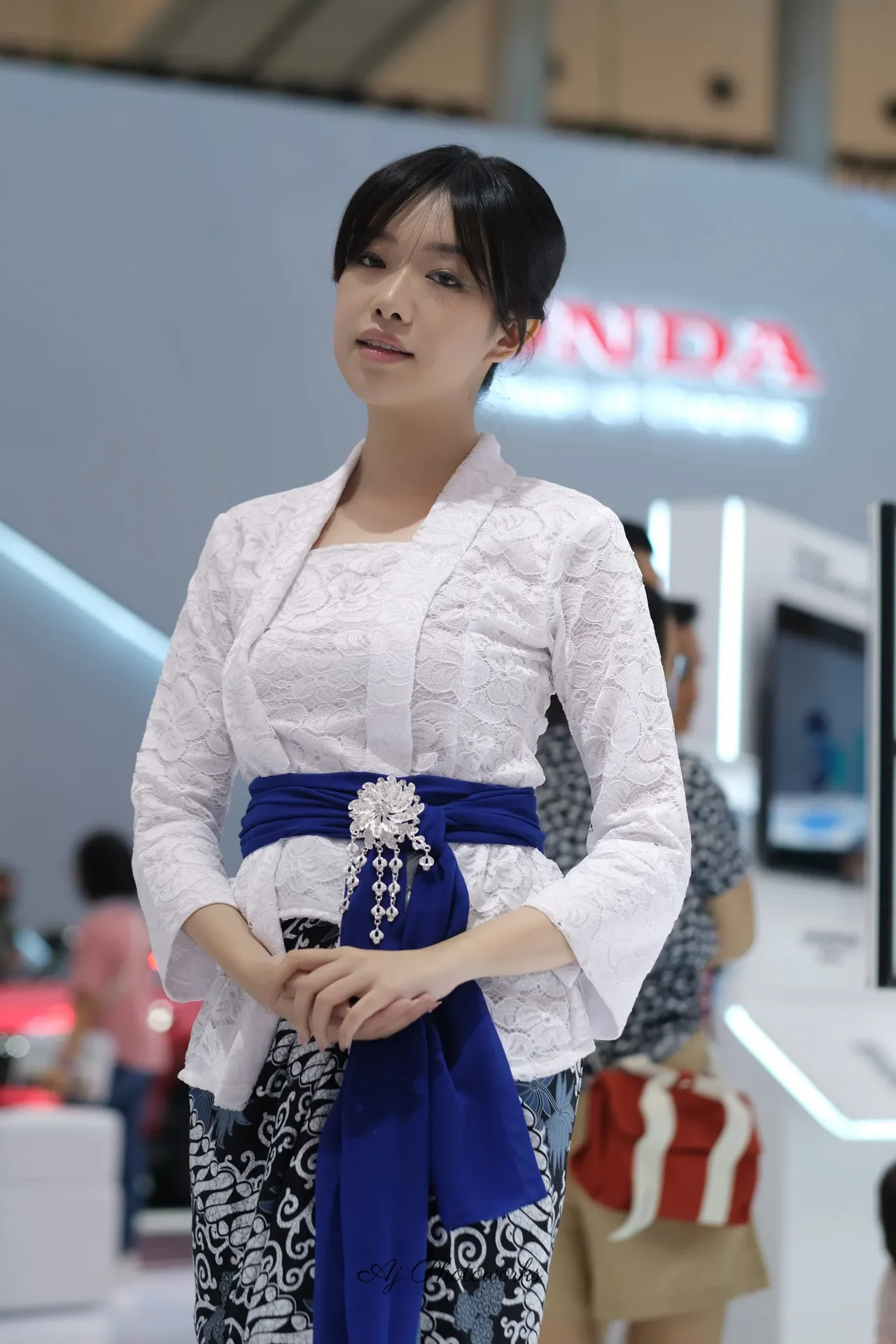 A traditional cultural attire meets modern styling in a vibrant exhibition setting.