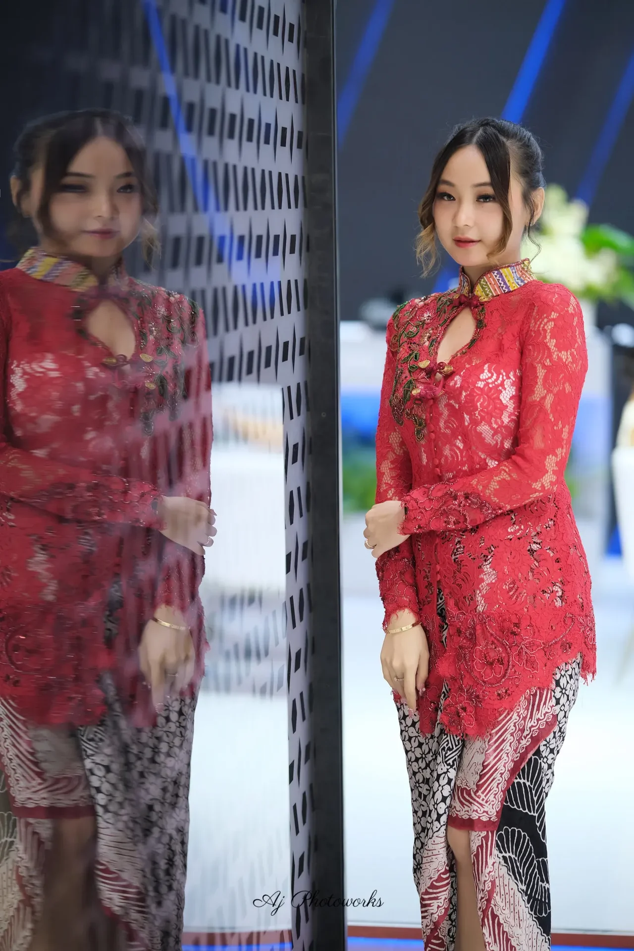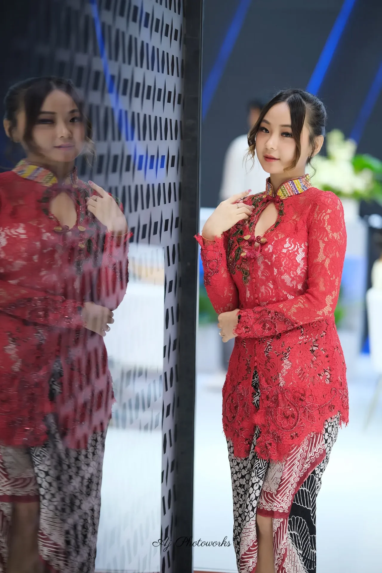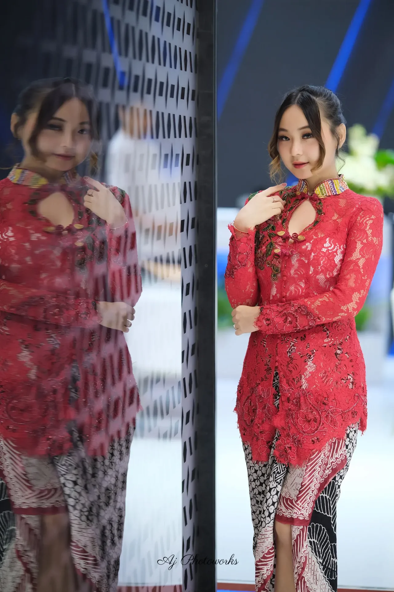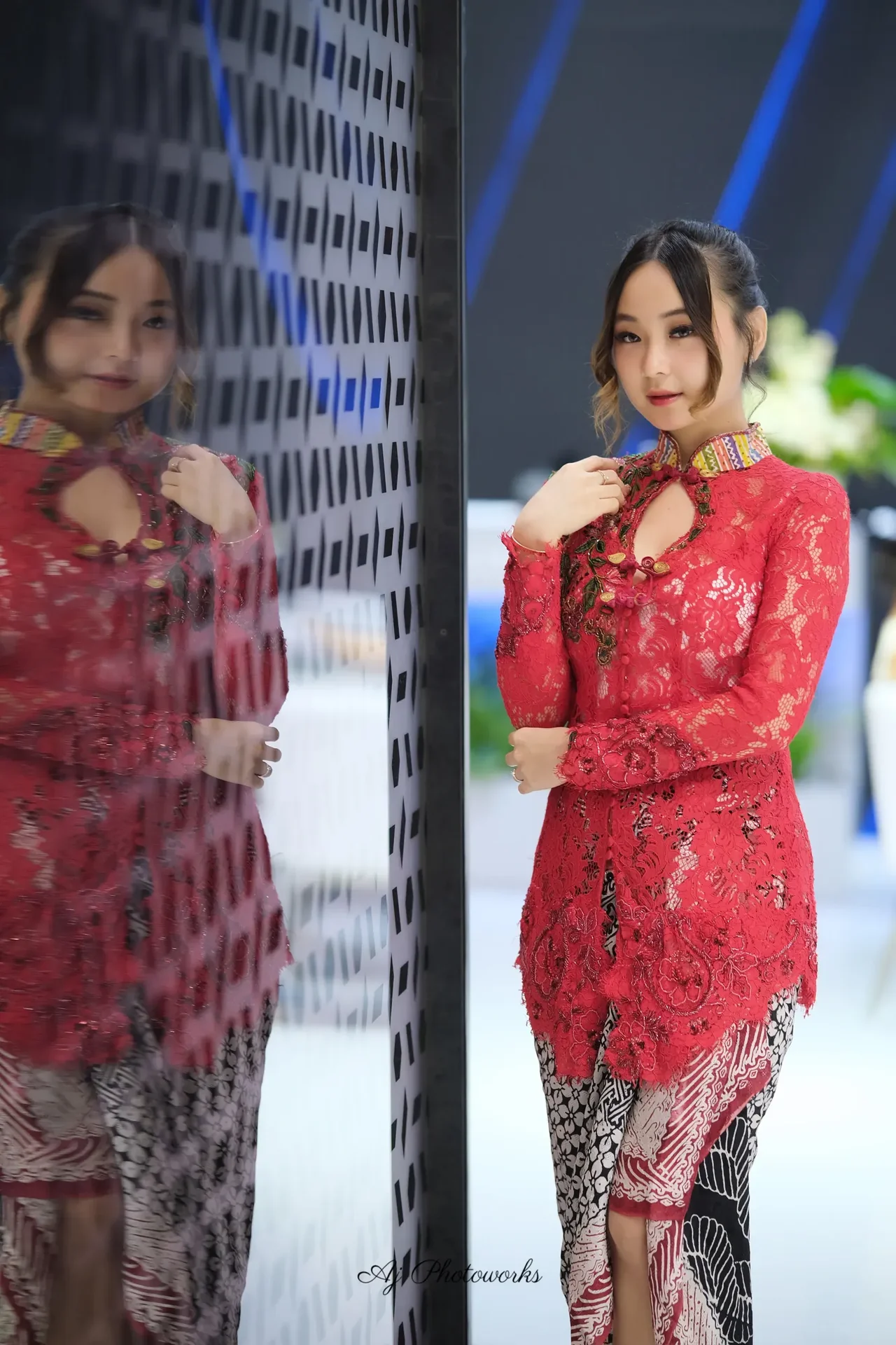 A model in a vibrant red lace ensemble with intricate floral patterns stands before a reflective lattice panel, blending traditional and modern aesthetics in a high-contrast studio setting.