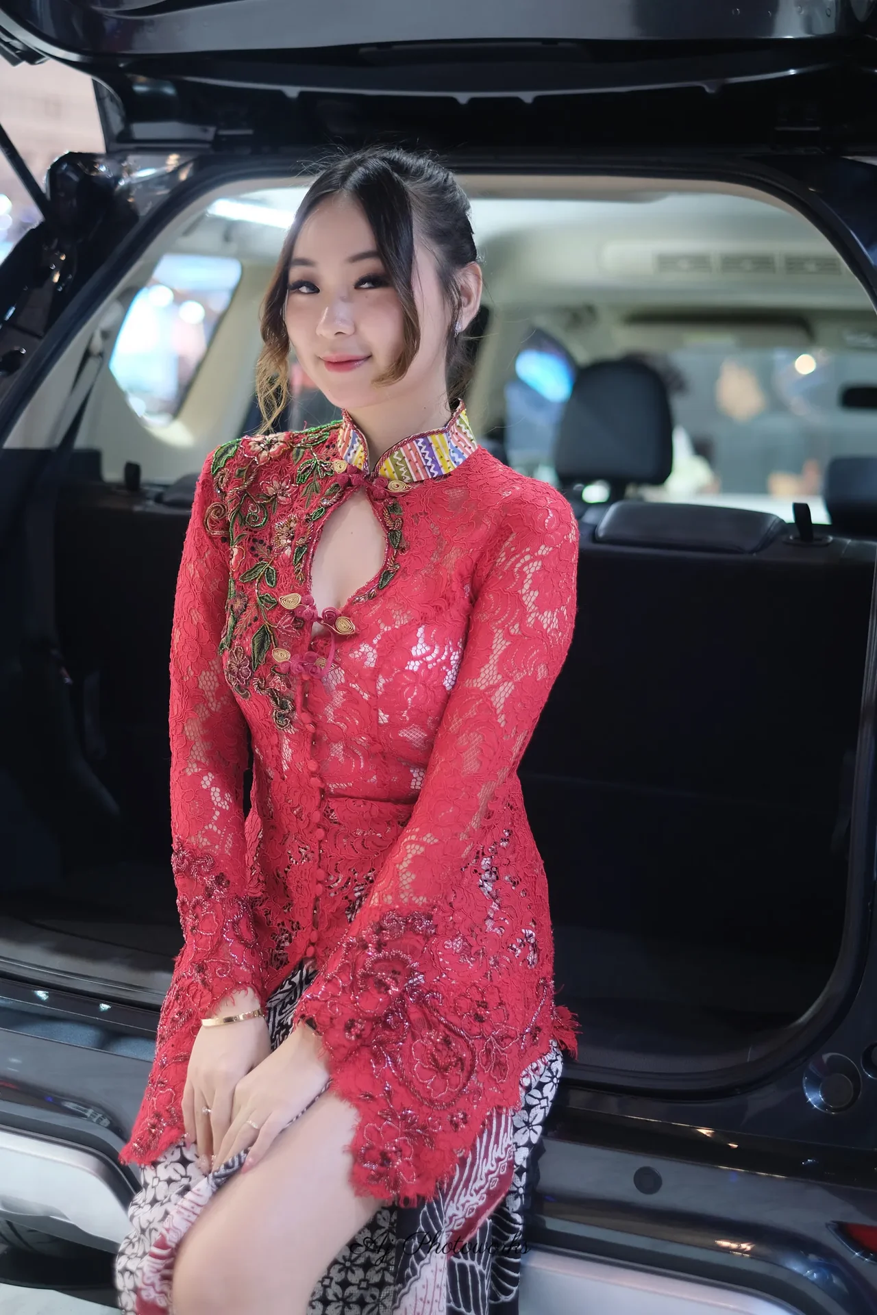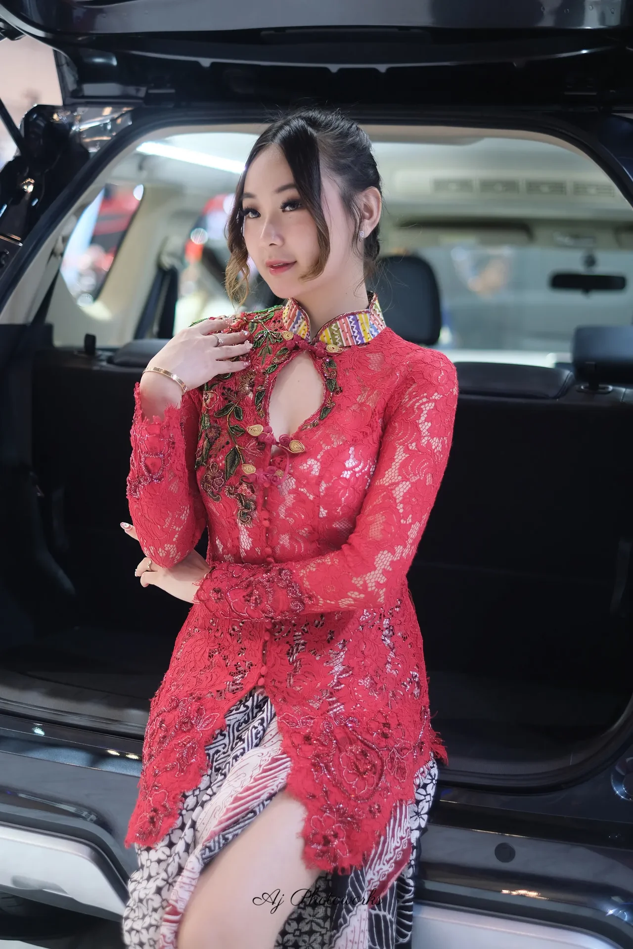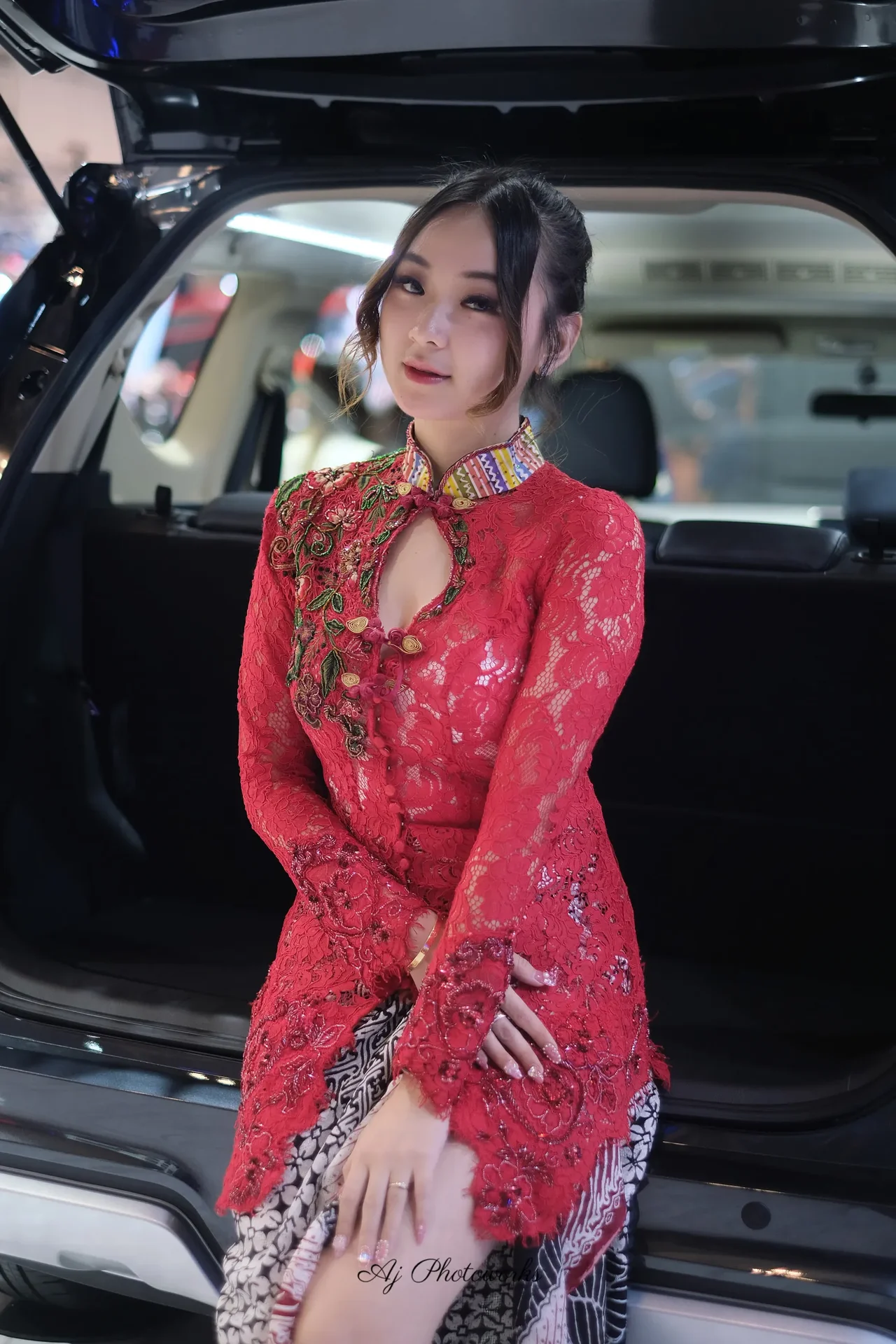 A model in a vibrant red lace dress with intricate floral embroidery poses beside an illuminated car trunk under bright studio lighting, blending luxury and cultural motifs.