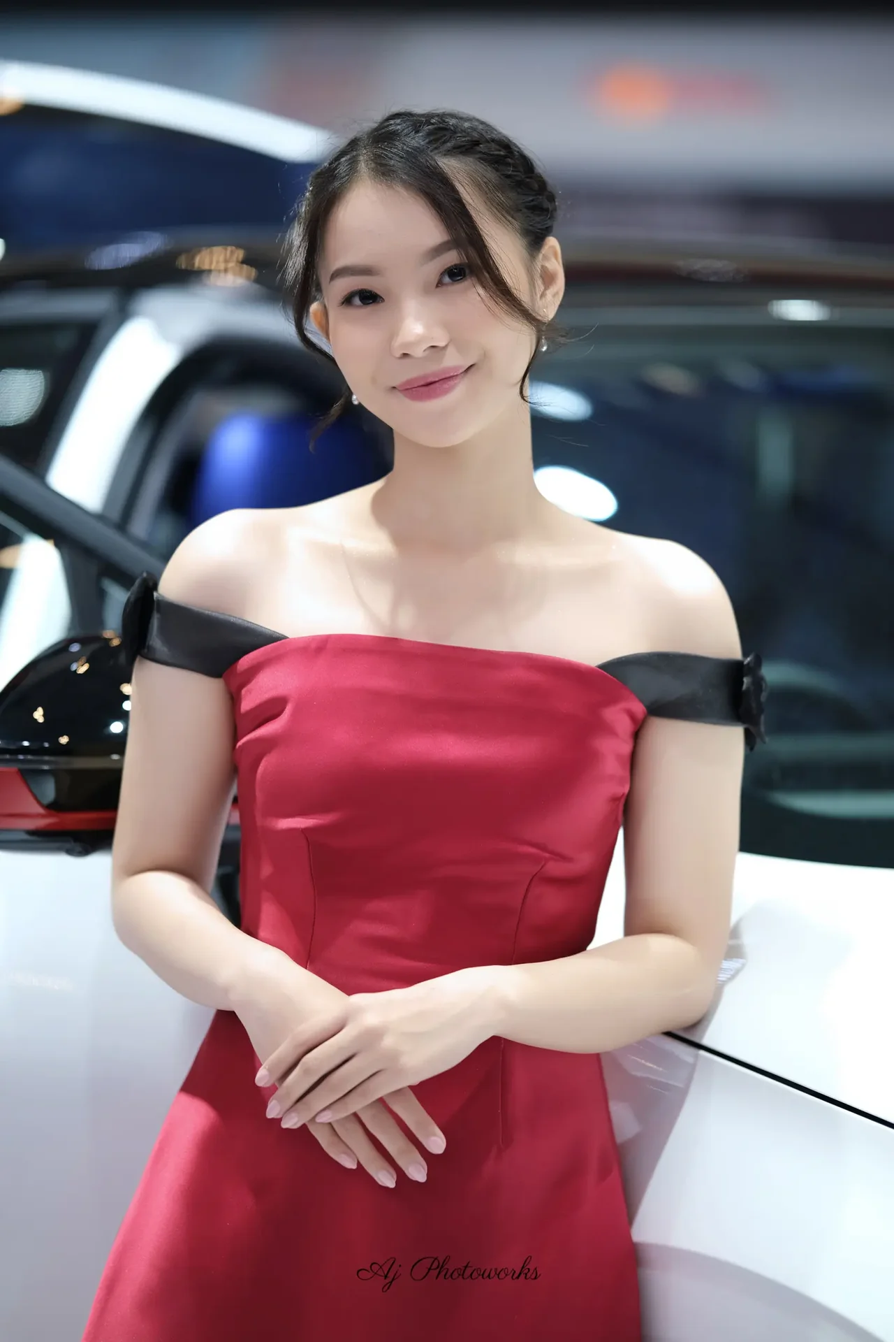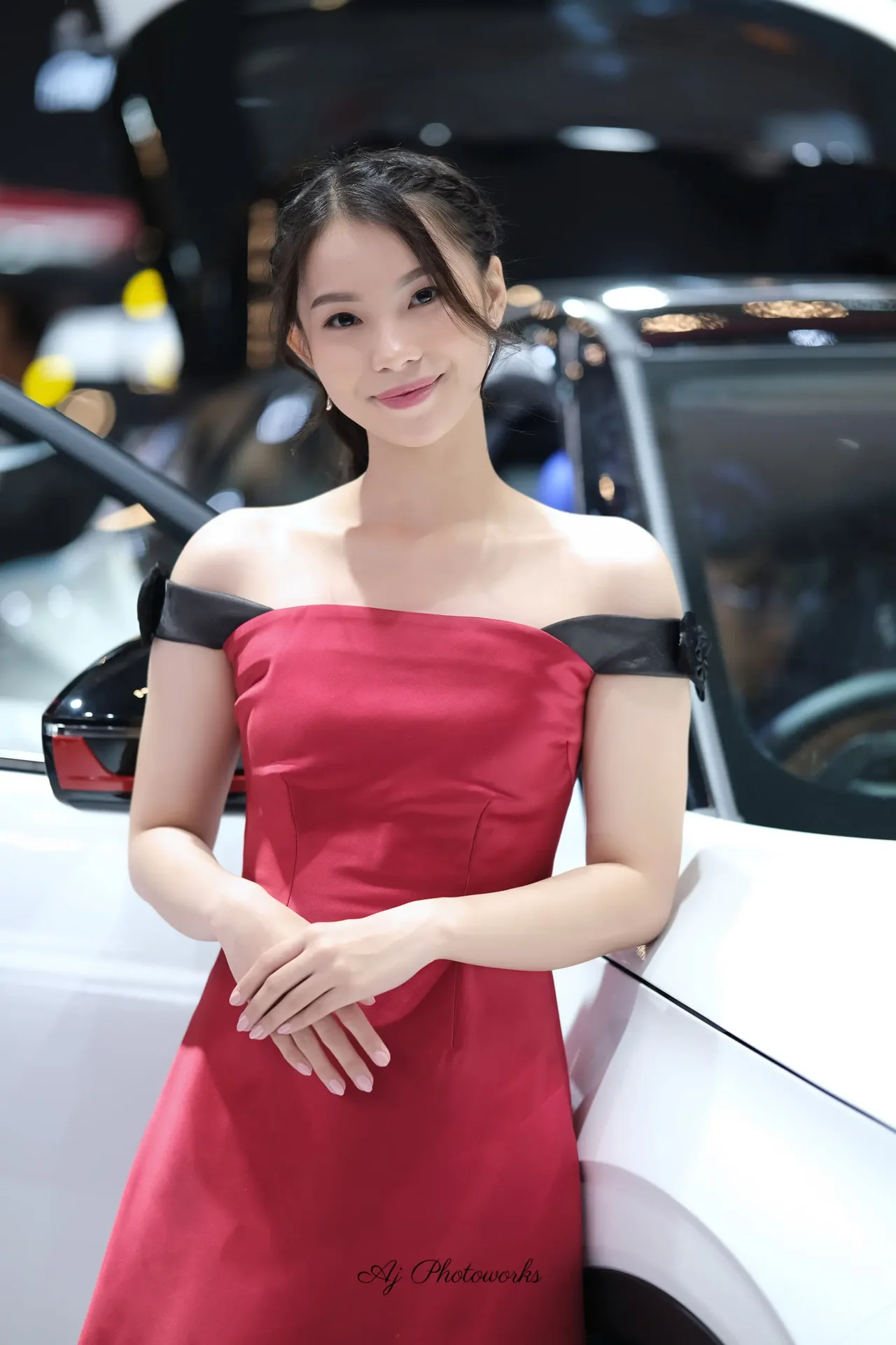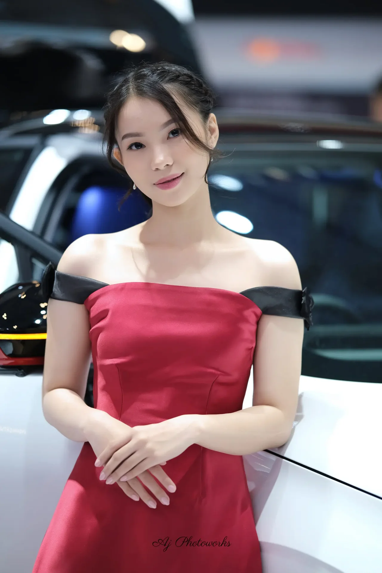 An elegantly poised woman in a vibrant red off-the-shoulder dress poses confidently against a modern exhibition backdrop, exuding glamour and sophistication.
