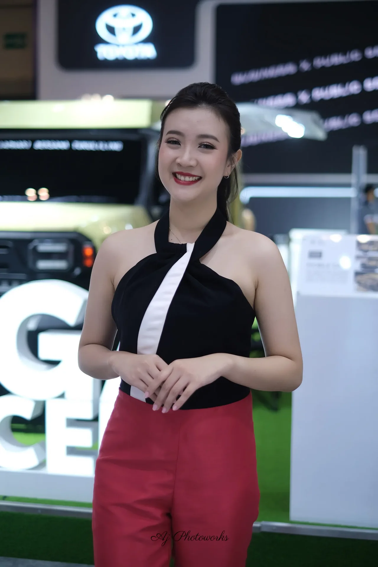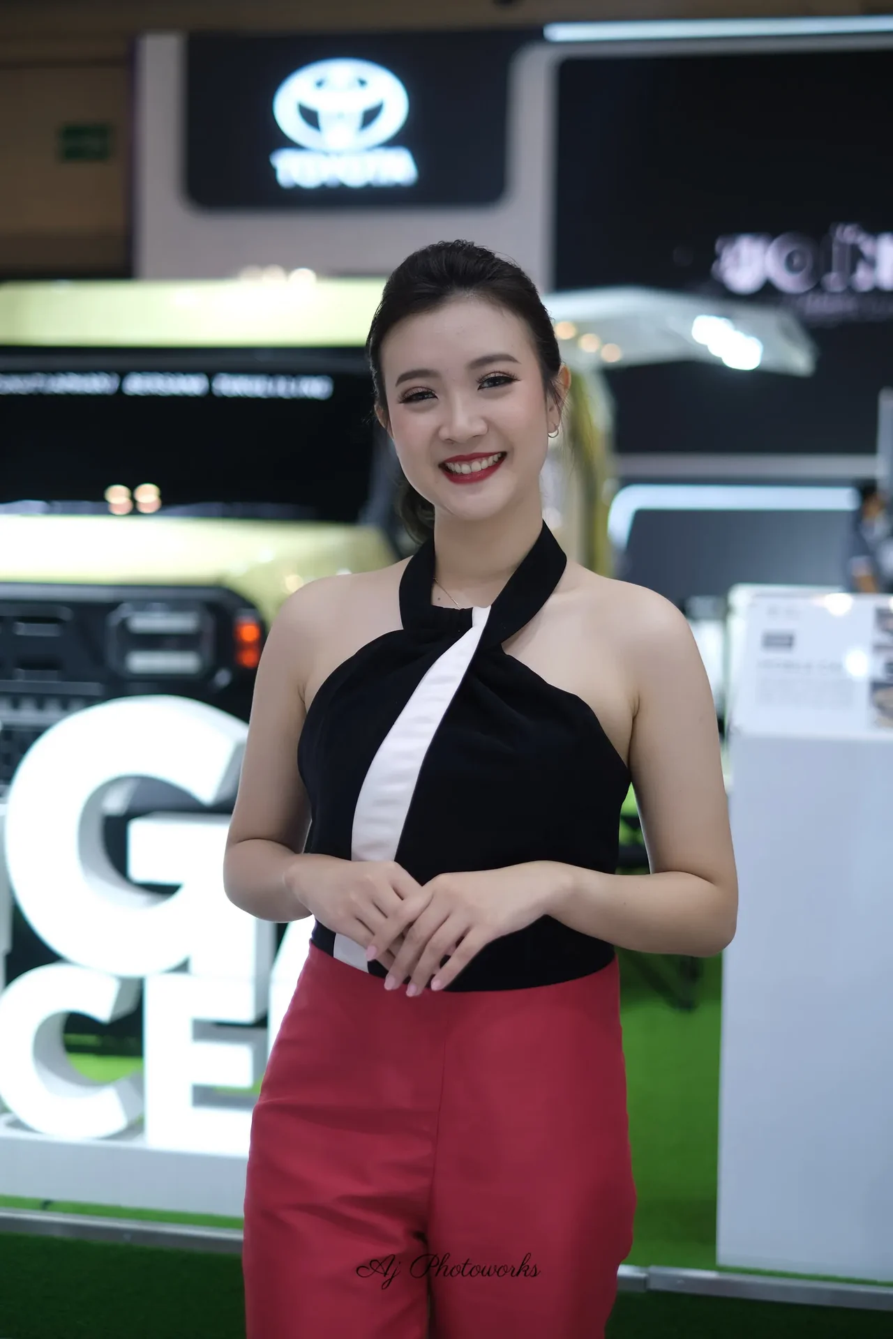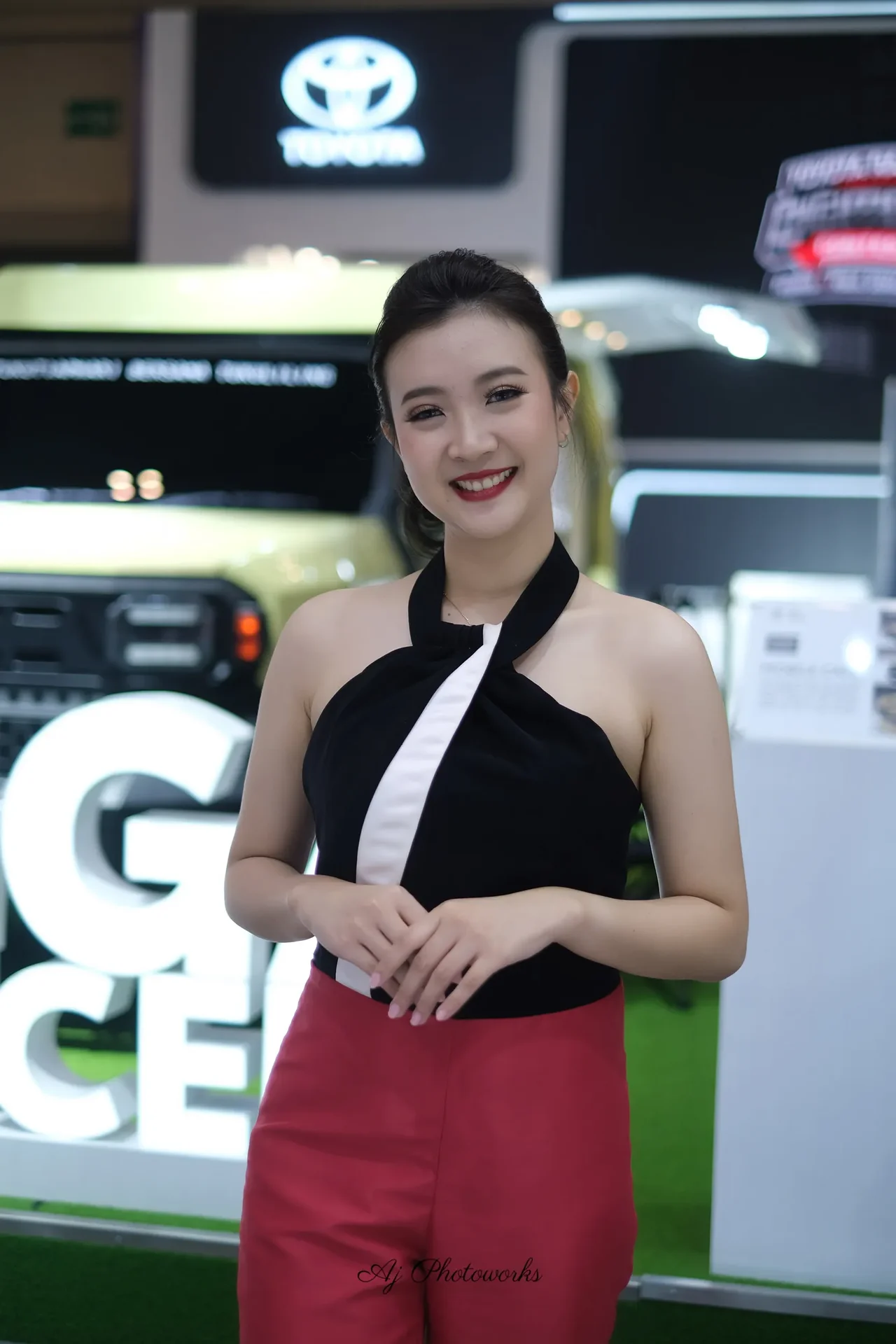 A fashion-forward individual showcases a bold black and white strapless top with a white diagonal accent, paired with vibrant red high-waisted trousers, posed against a dynamic automotive exhibition backdrop featuring a prominent Toyota logo and sleek vehicle displays.