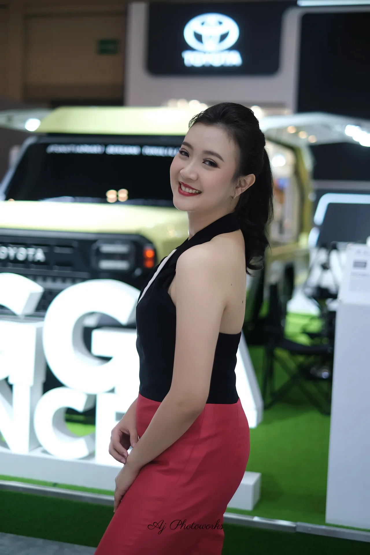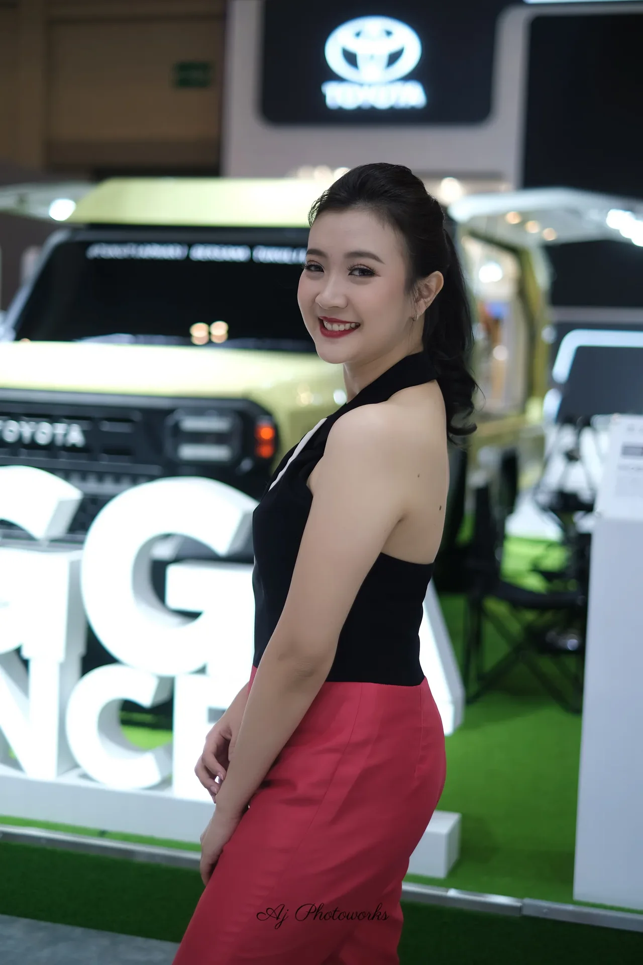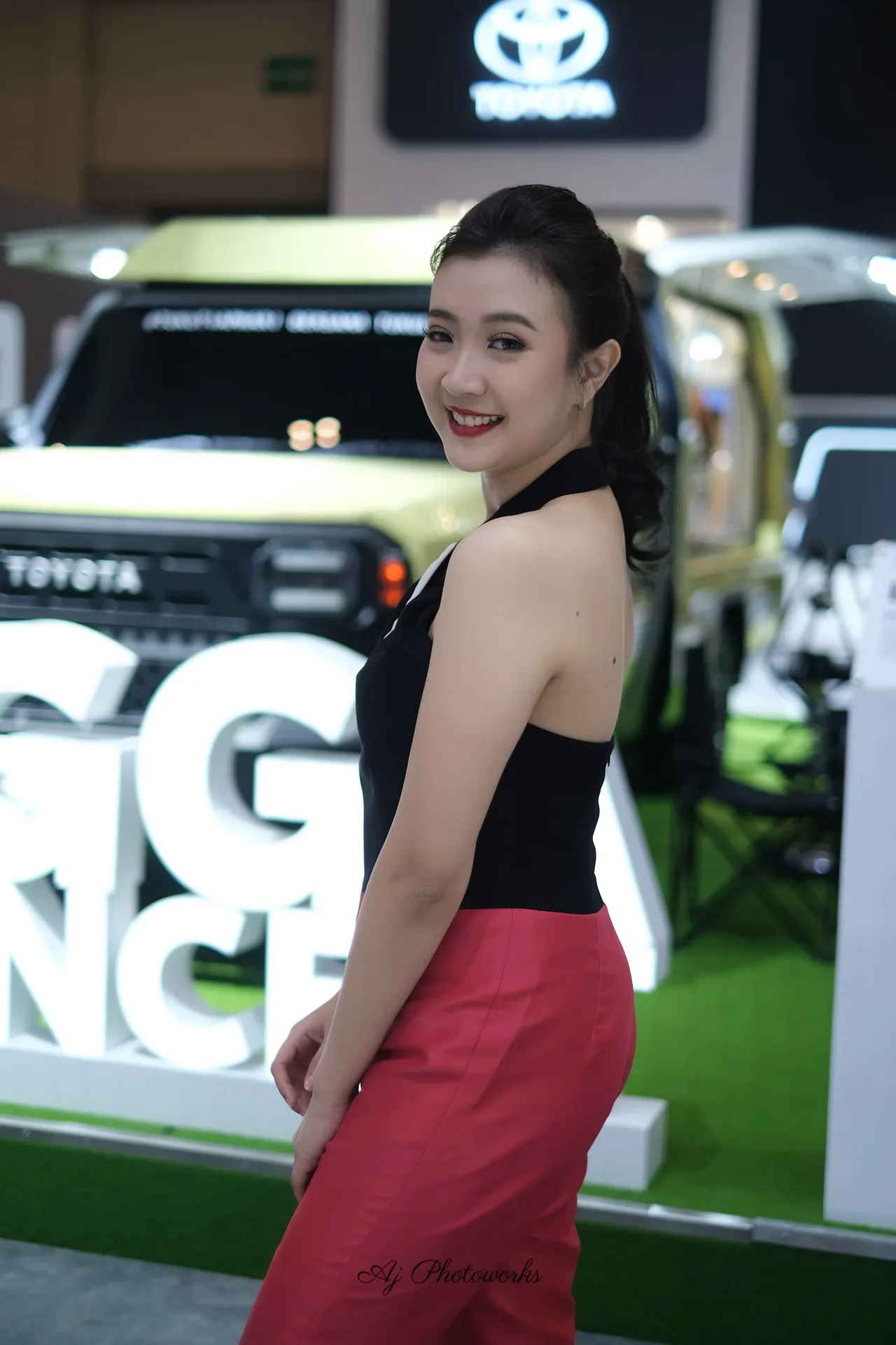 A fashion-forward individual showcases a bold black and white strapless top with a white diagonal accent, paired with vibrant red high-waisted trousers, posed against a dynamic automotive exhibition backdrop featuring a prominent Toyota logo and sleek vehicle displays.
