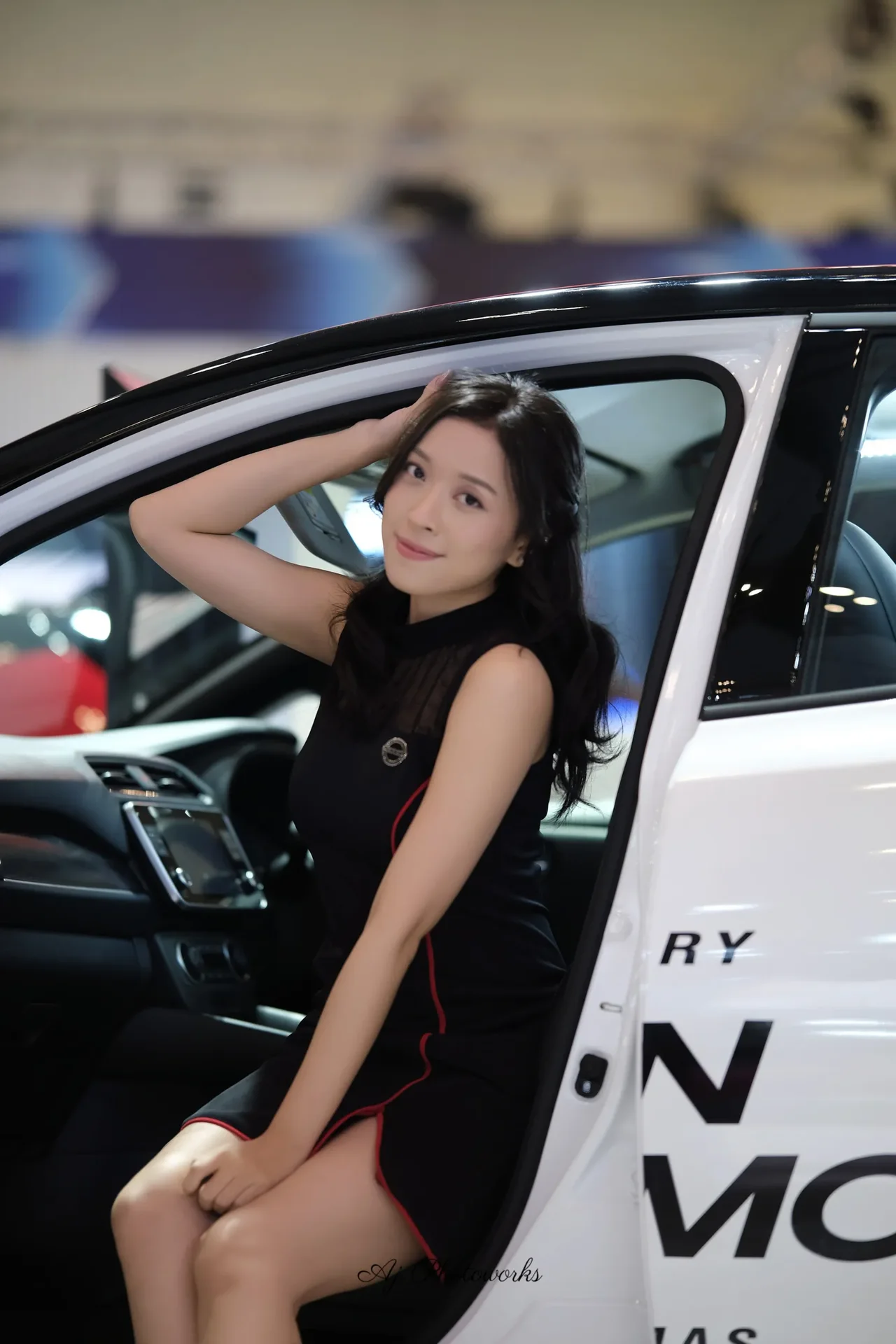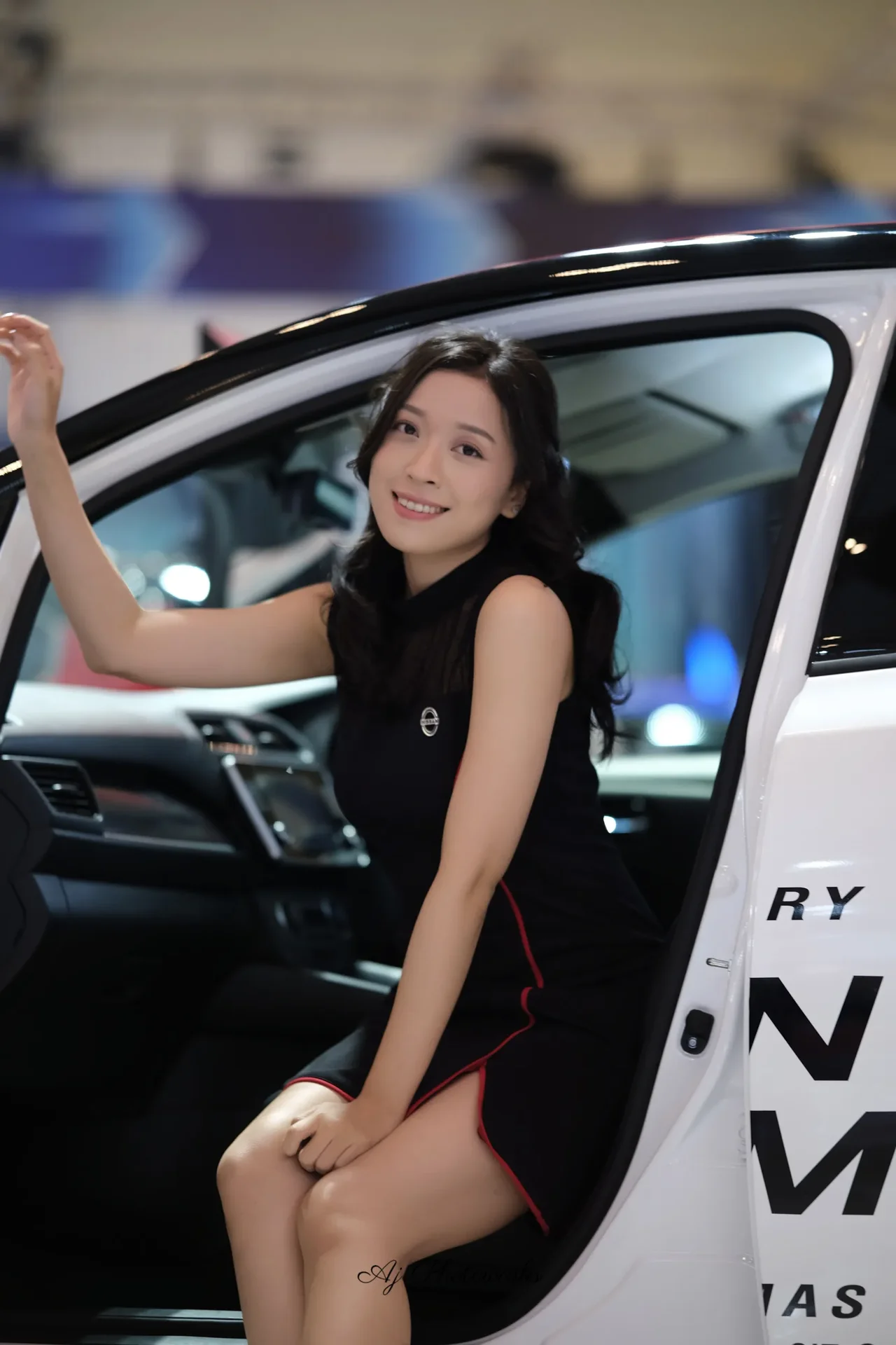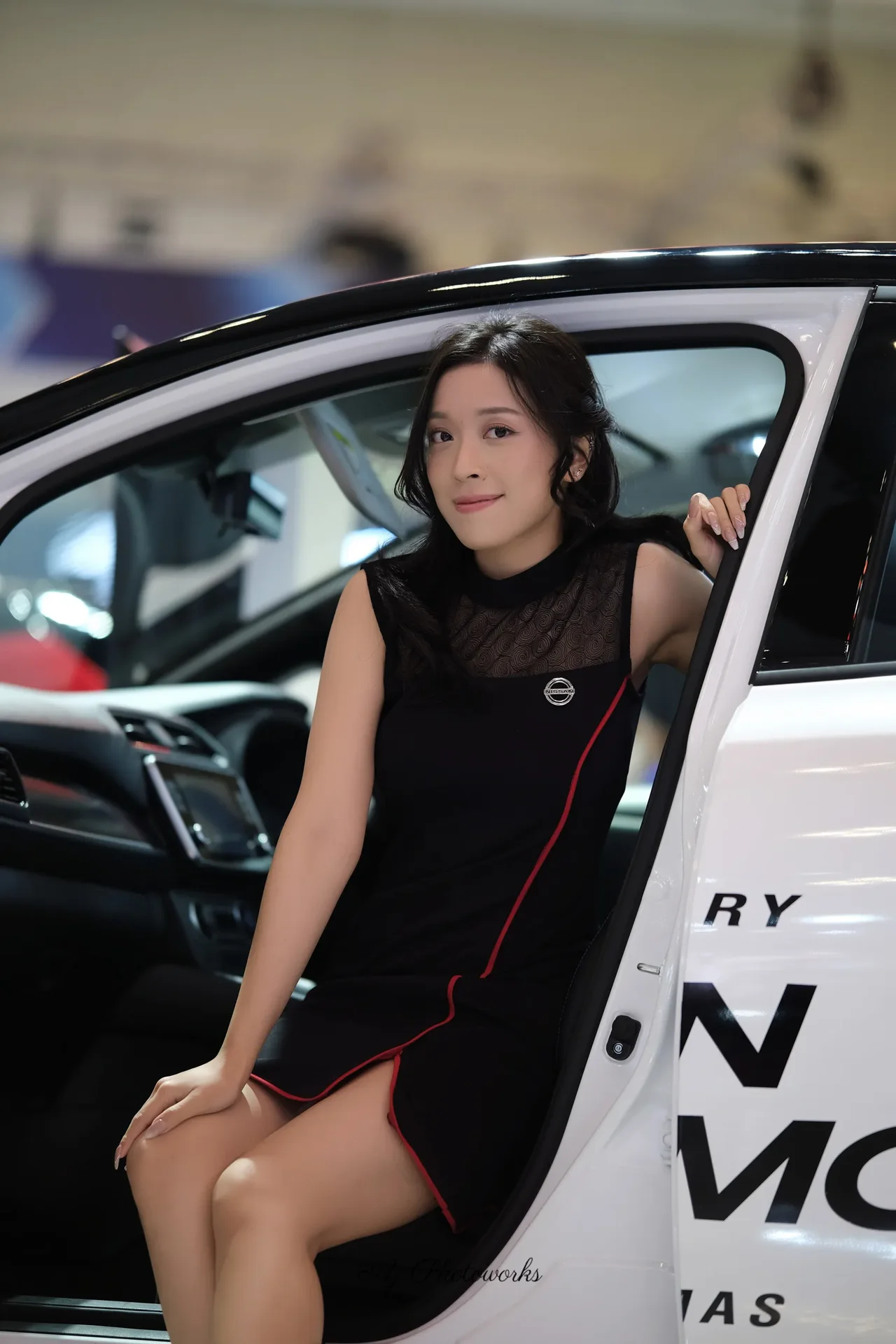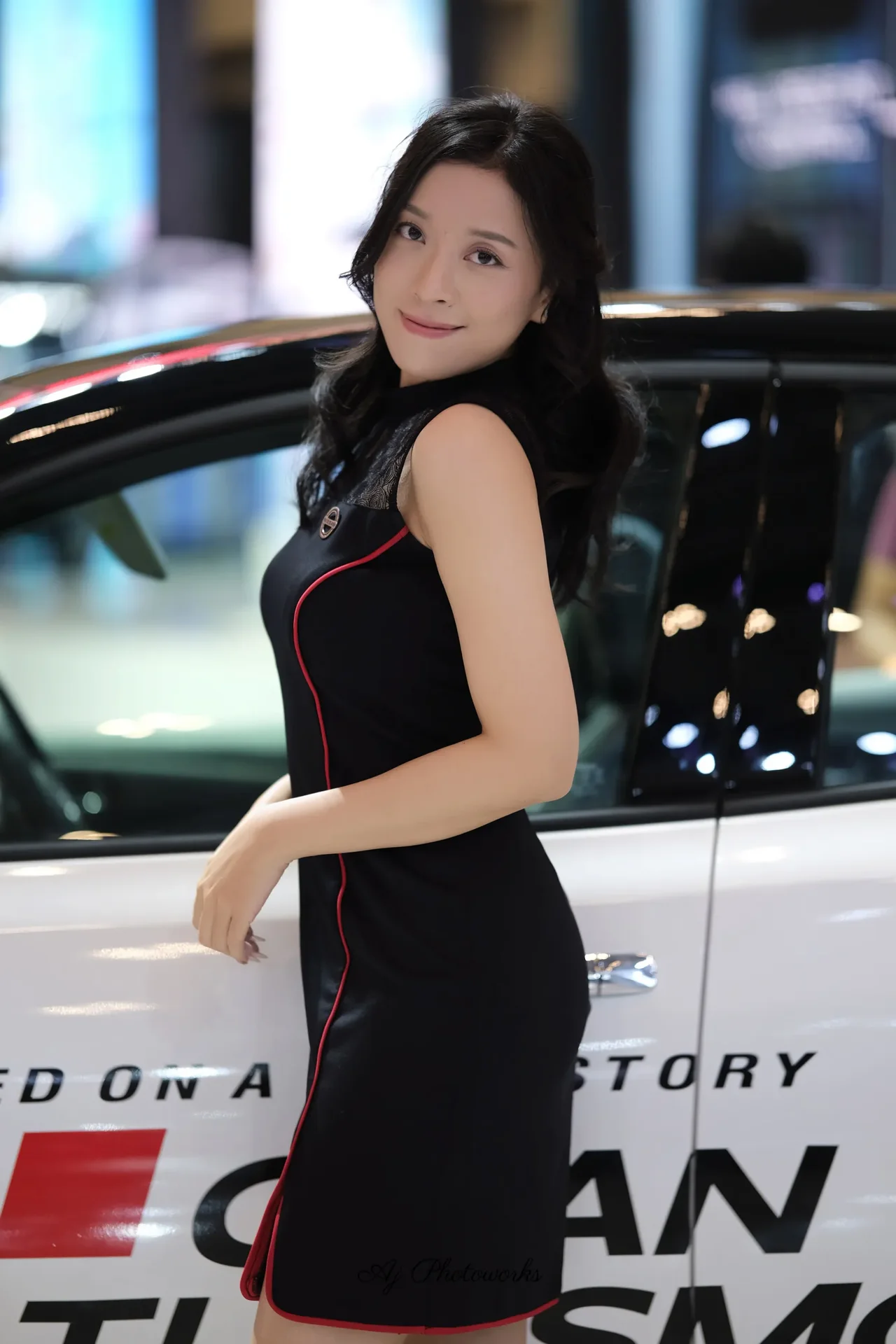 Elegance meets automotive precision in this commercial photoshoot featuring a model in a sleek black-and-red dress near a white sports car at a high-end exhibition.
