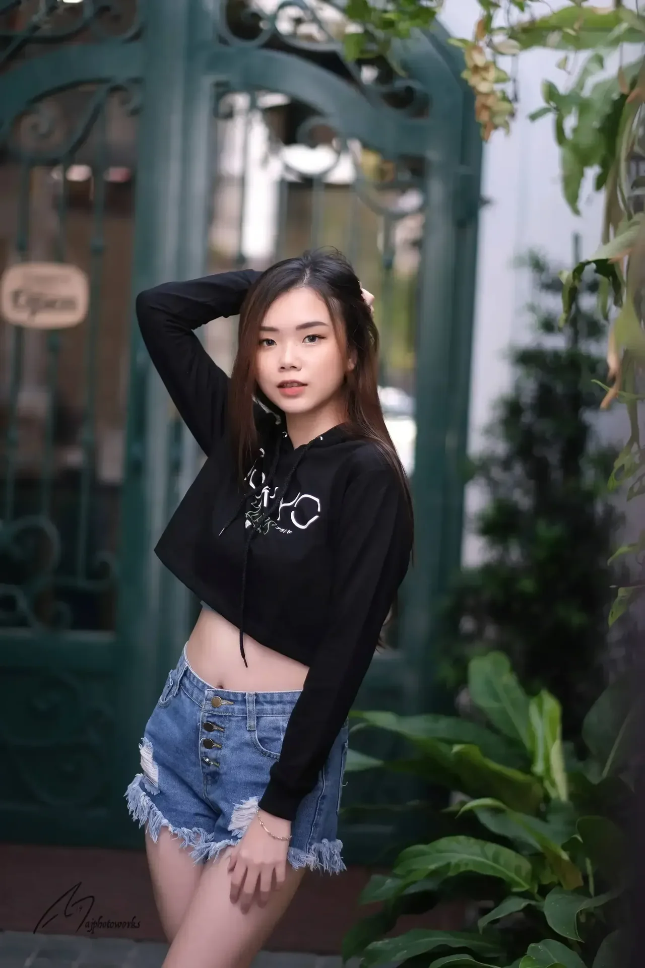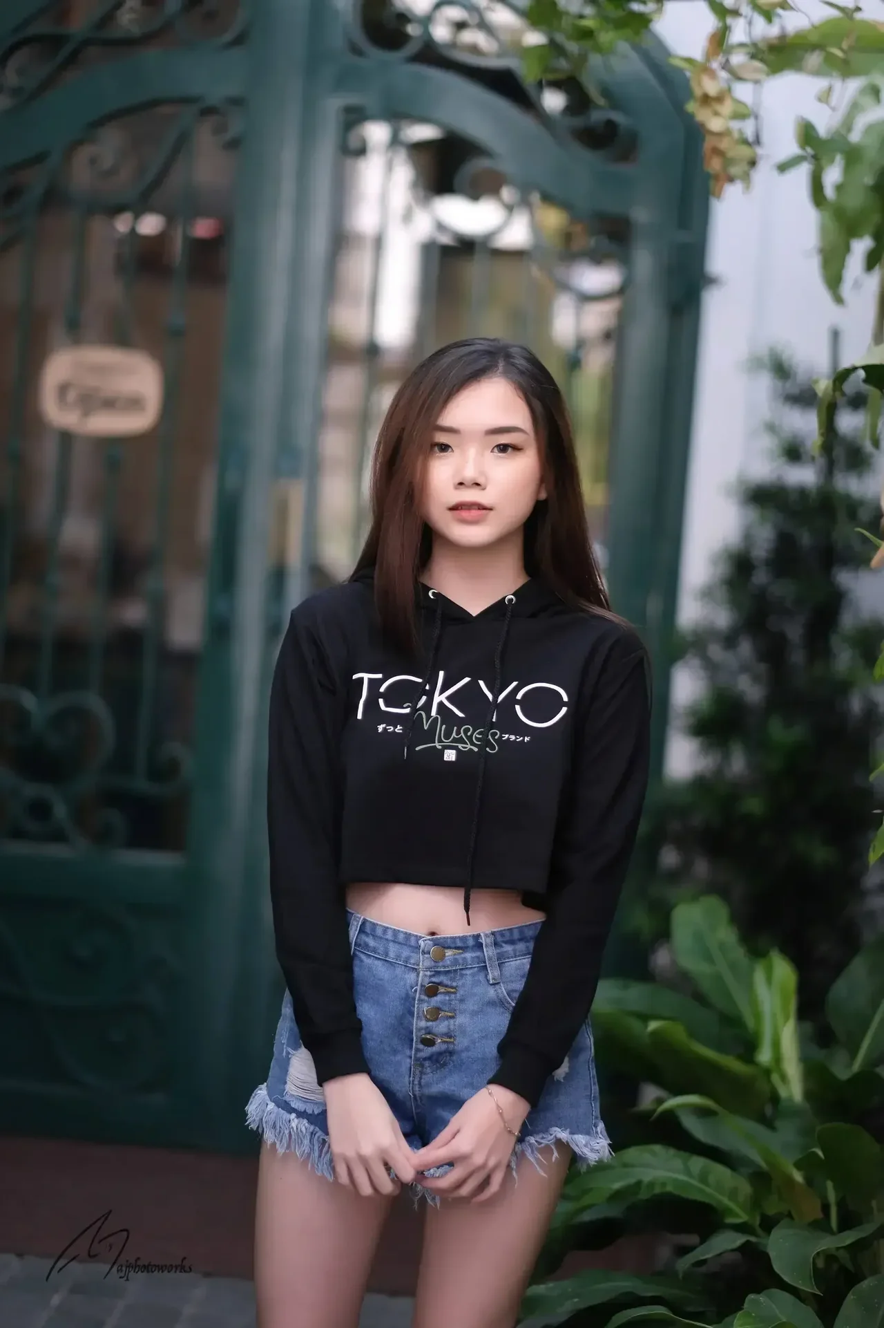 A woman in a black 'TOKYO' hoodie and frayed denim shorts poses confidently in an urban setting, blending modern streetwear with natural elements.