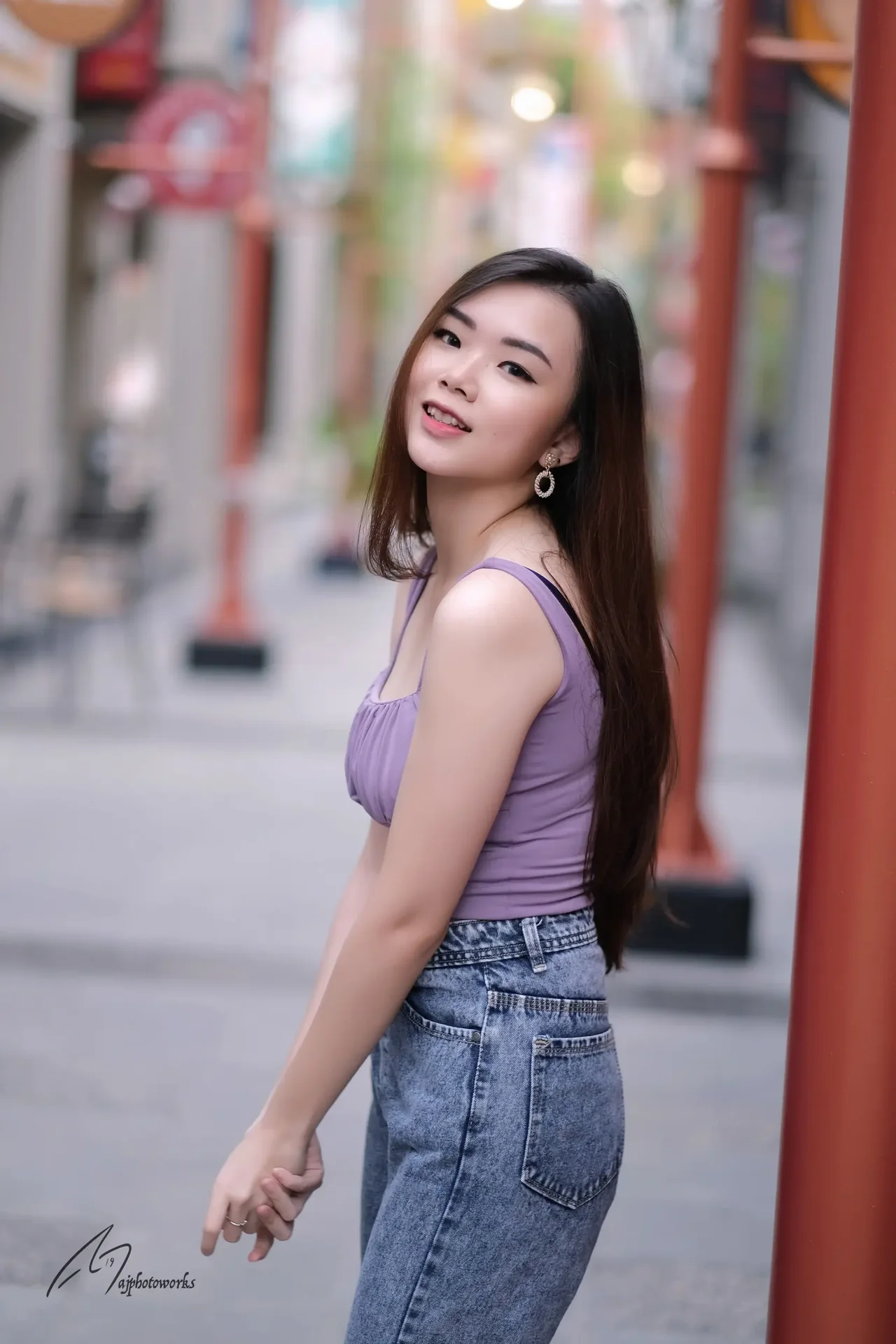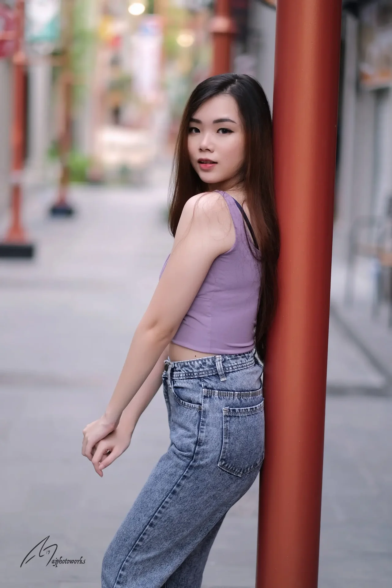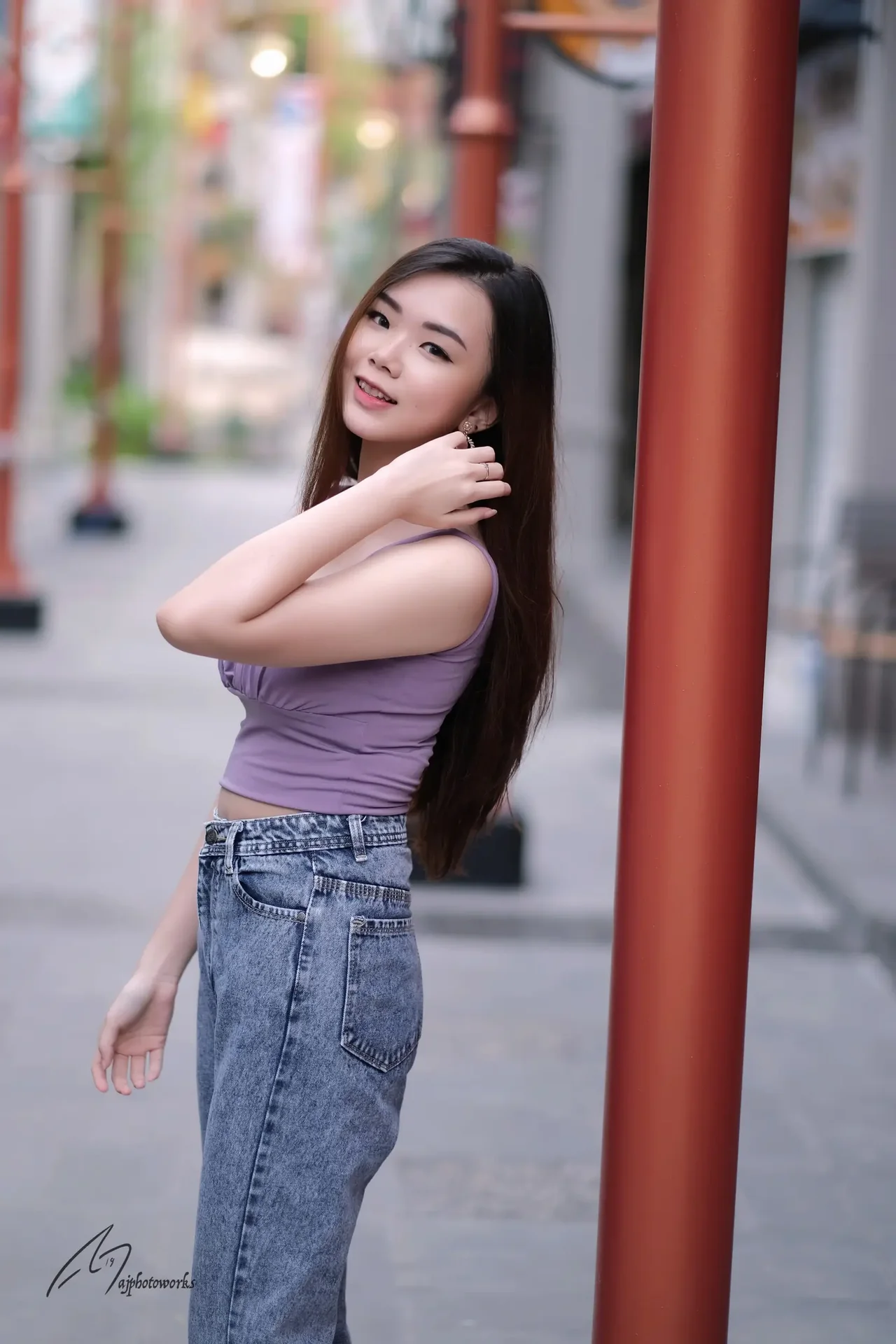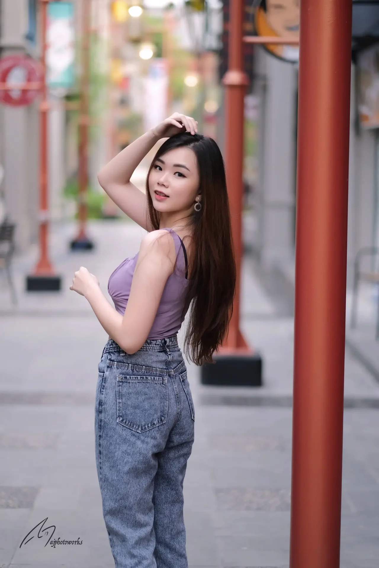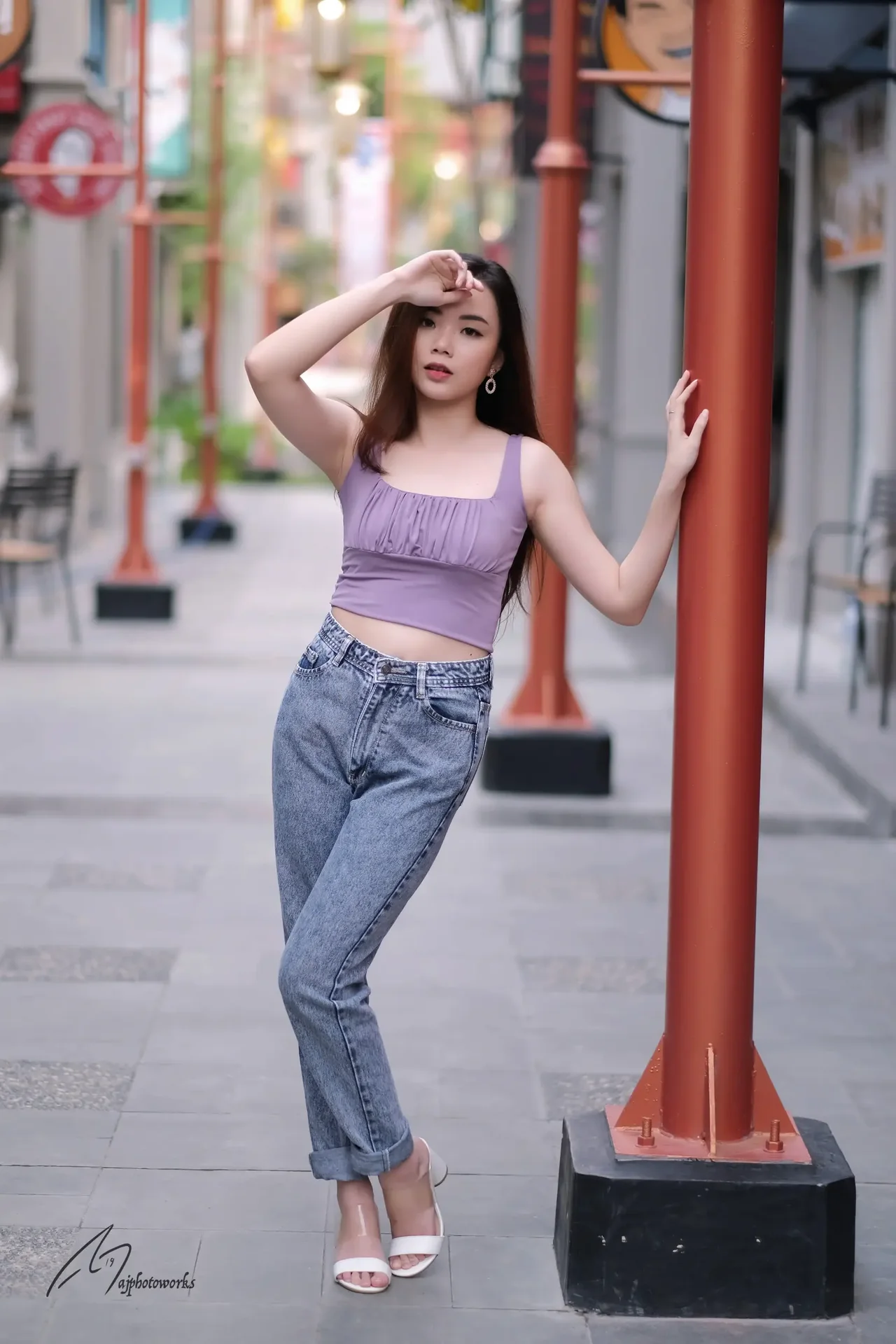 Elegantly captured in motion, a model poses with poise against an urban backdrop, showcasing a mix of casual chic and vibrant city life.