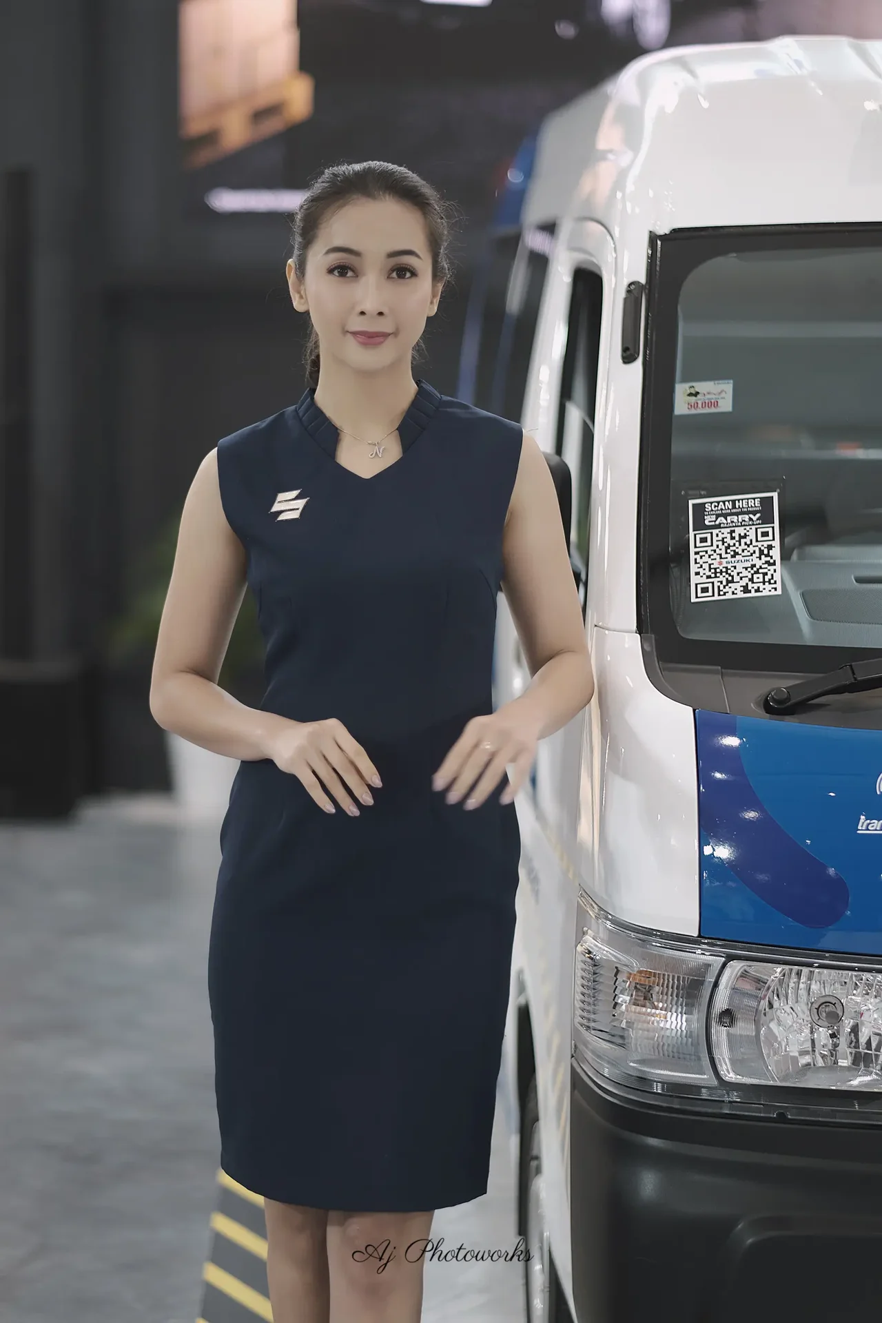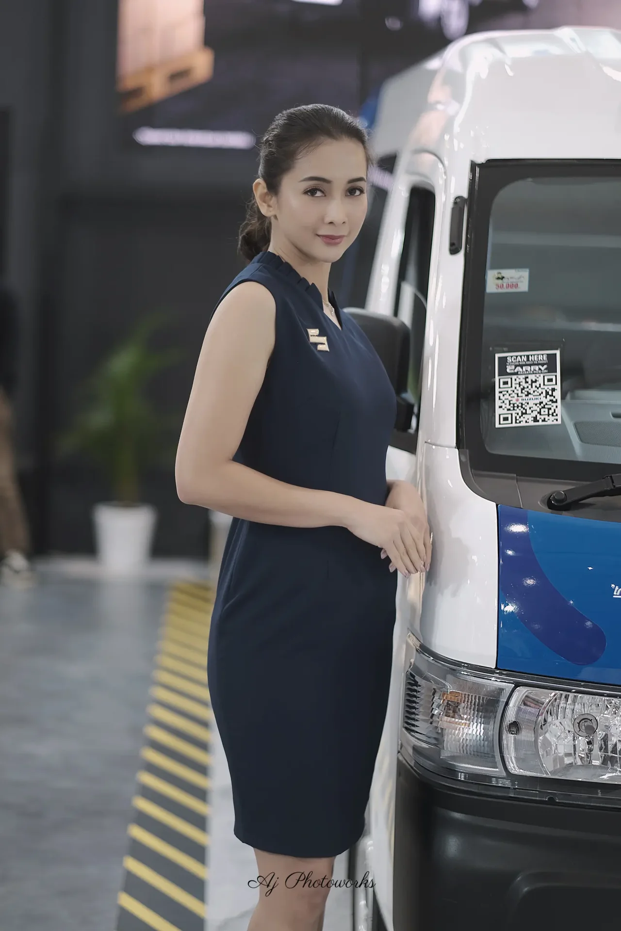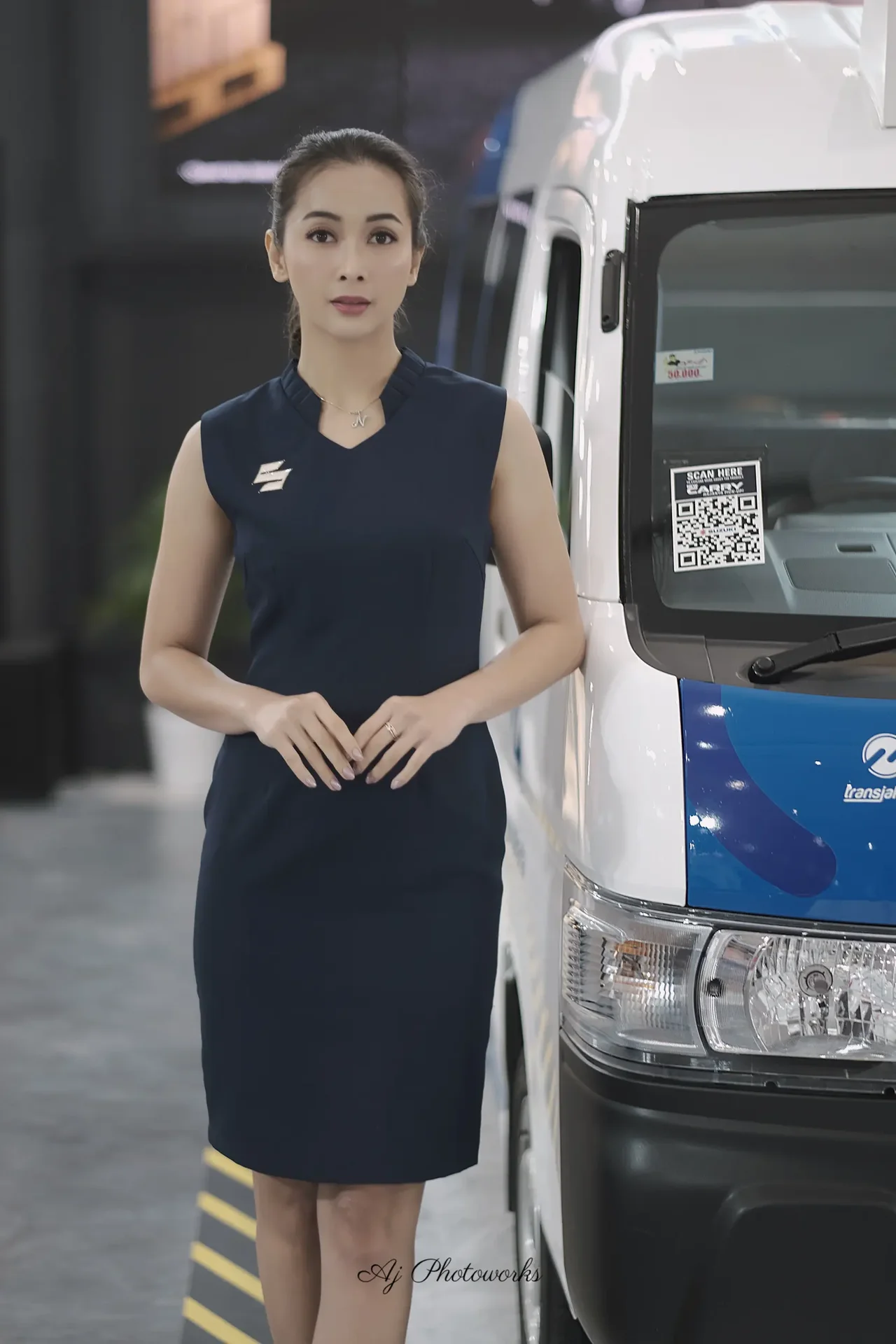 A woman in a navy blue corporate dress stands confidently against a white van backdrop at a polished showroom.