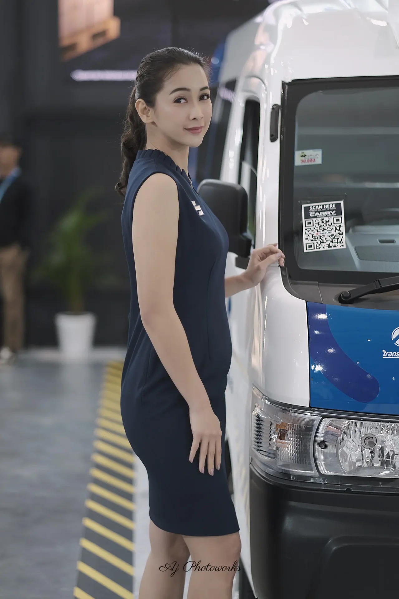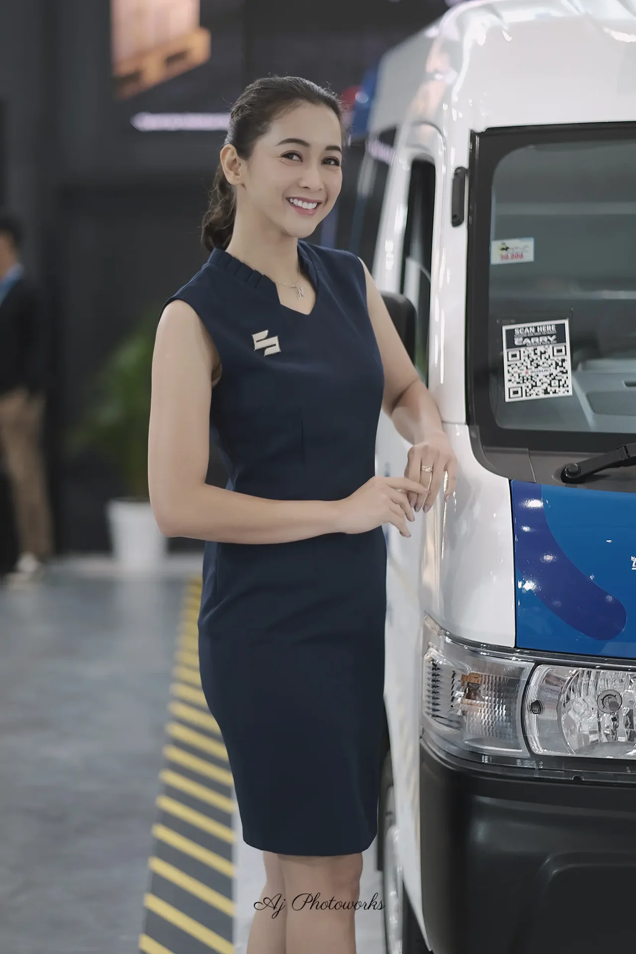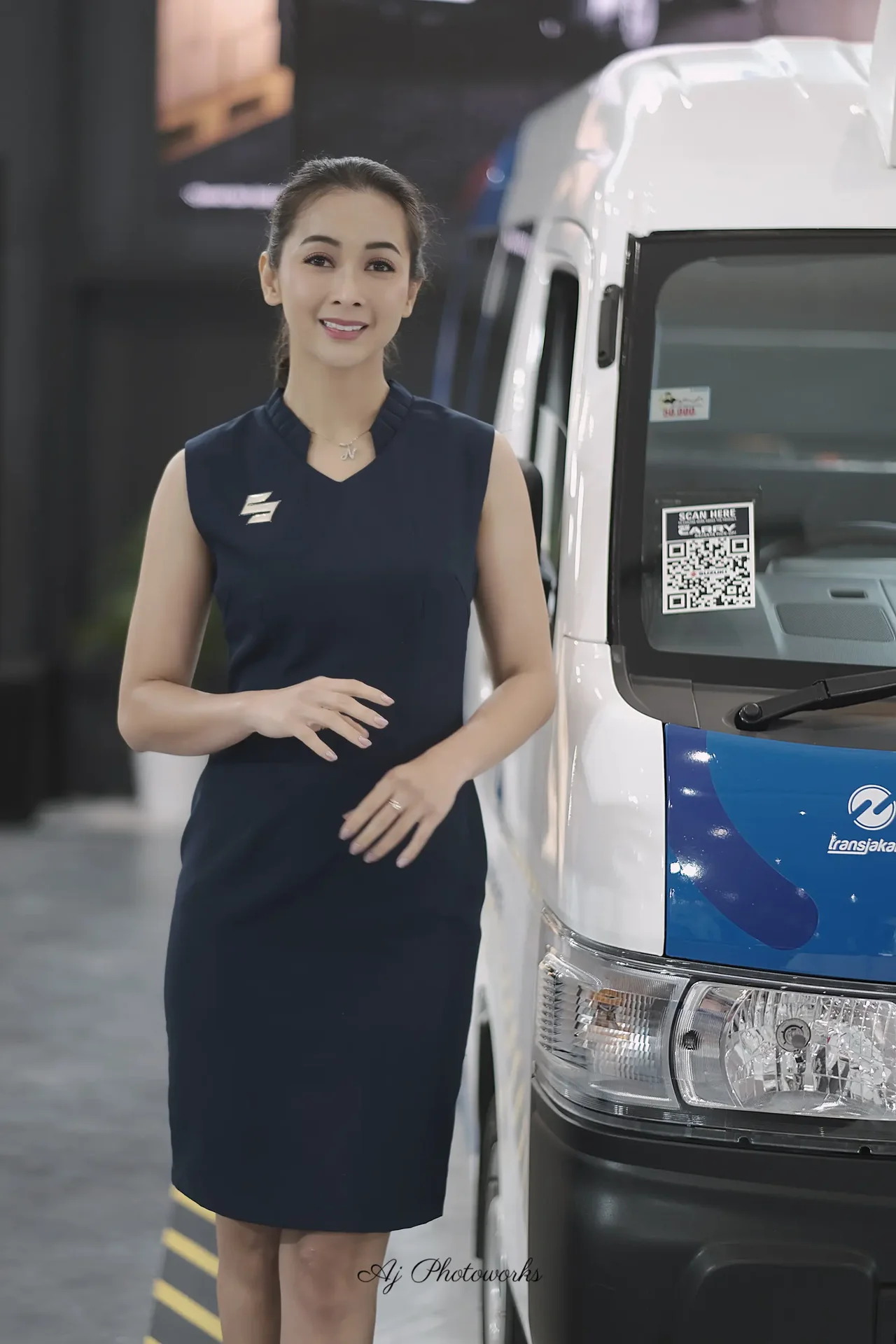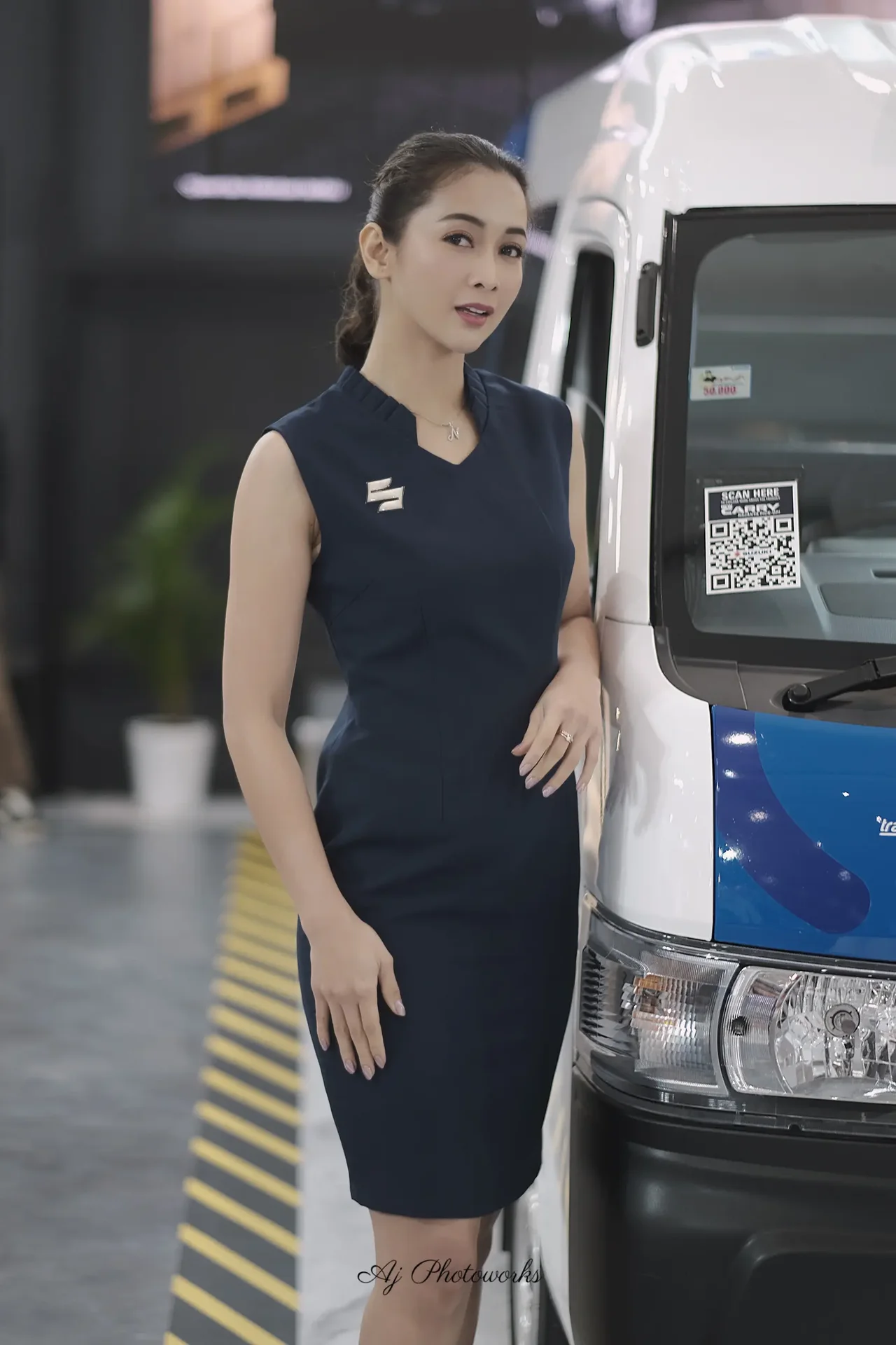 A woman in a navy blue corporate dress stands confidently against a white van backdrop at a polished showroom.
