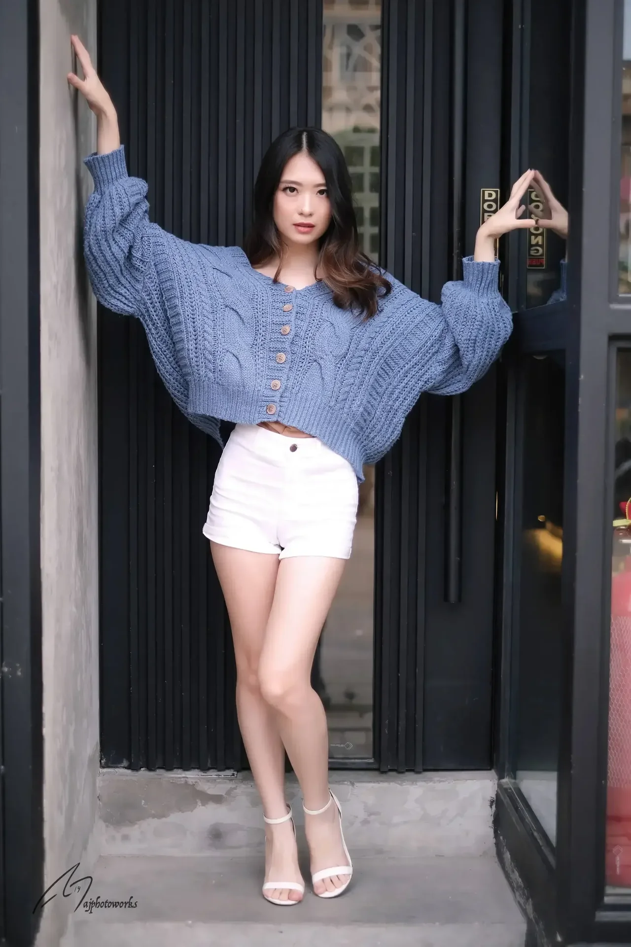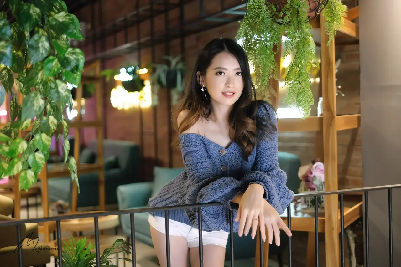A woman in a blue knit ensemble blends urban and cozy aesthetics across varied locations, from a fireplace backdrop to a modern cafe, showcasing fashion in motion.