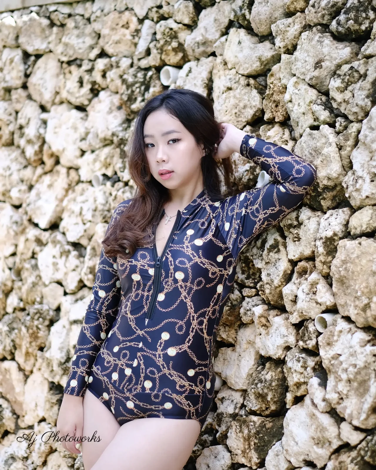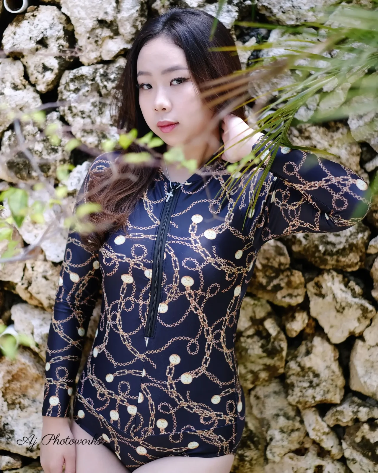 Elegance meets edgy allure in this bold fashion storytelling. The gold chain design on jet-black fabric contrasts dramatically against sunlit natural backdrops, blending urban sophistication with organic serenity.