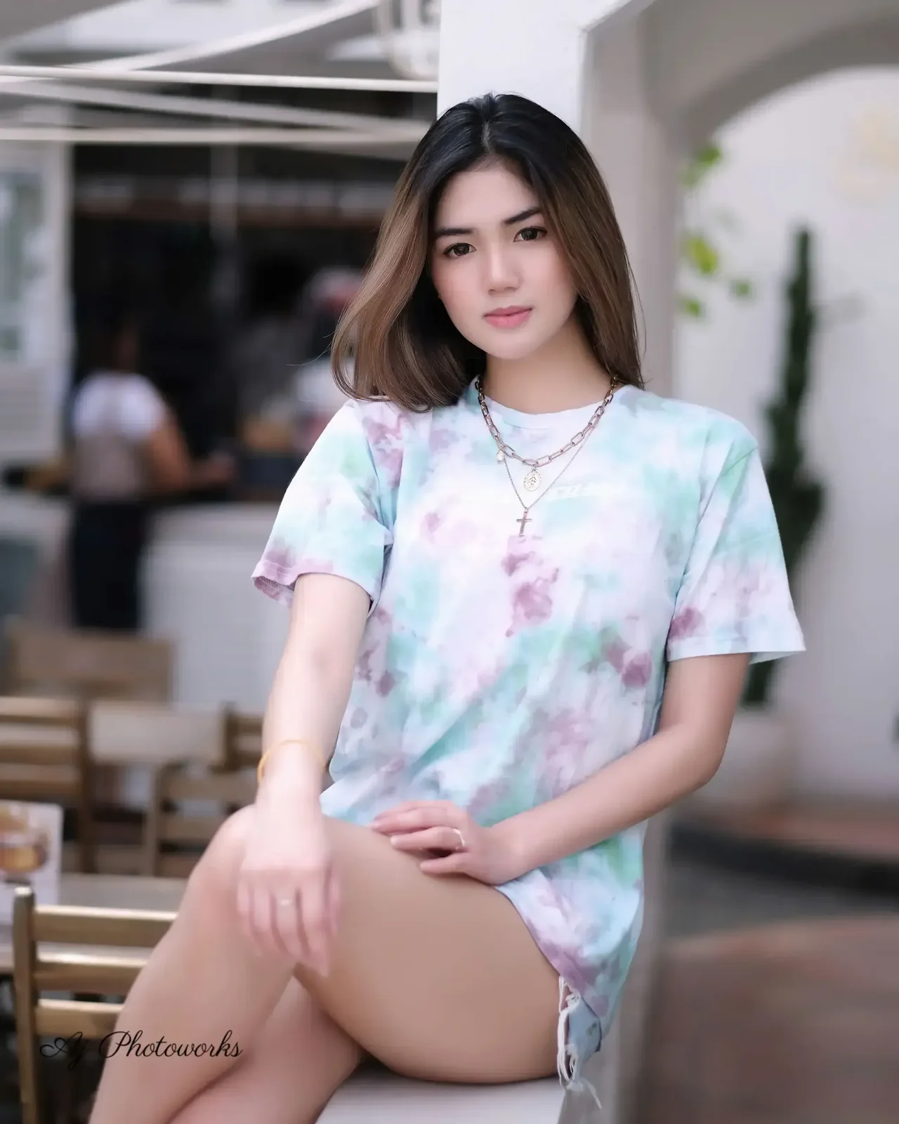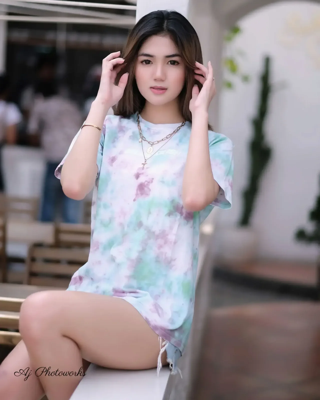 Tie-dye fashion blends comfort and style in a relaxed outdoor portrait.