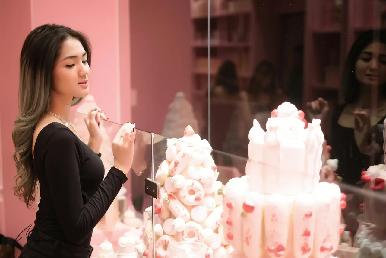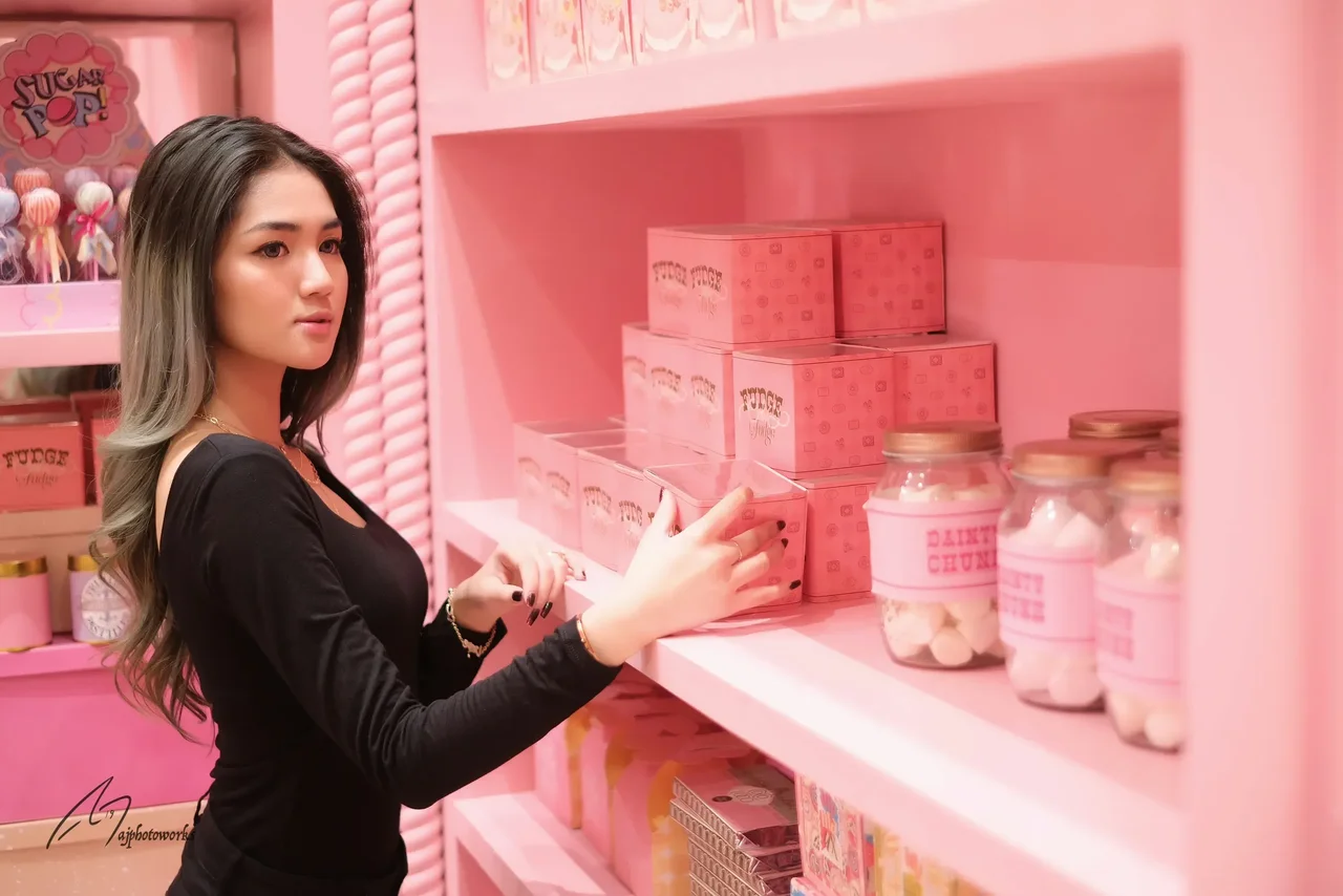 A woman in a black outfit explores a vibrant pink candy store, exuding playful elegance.