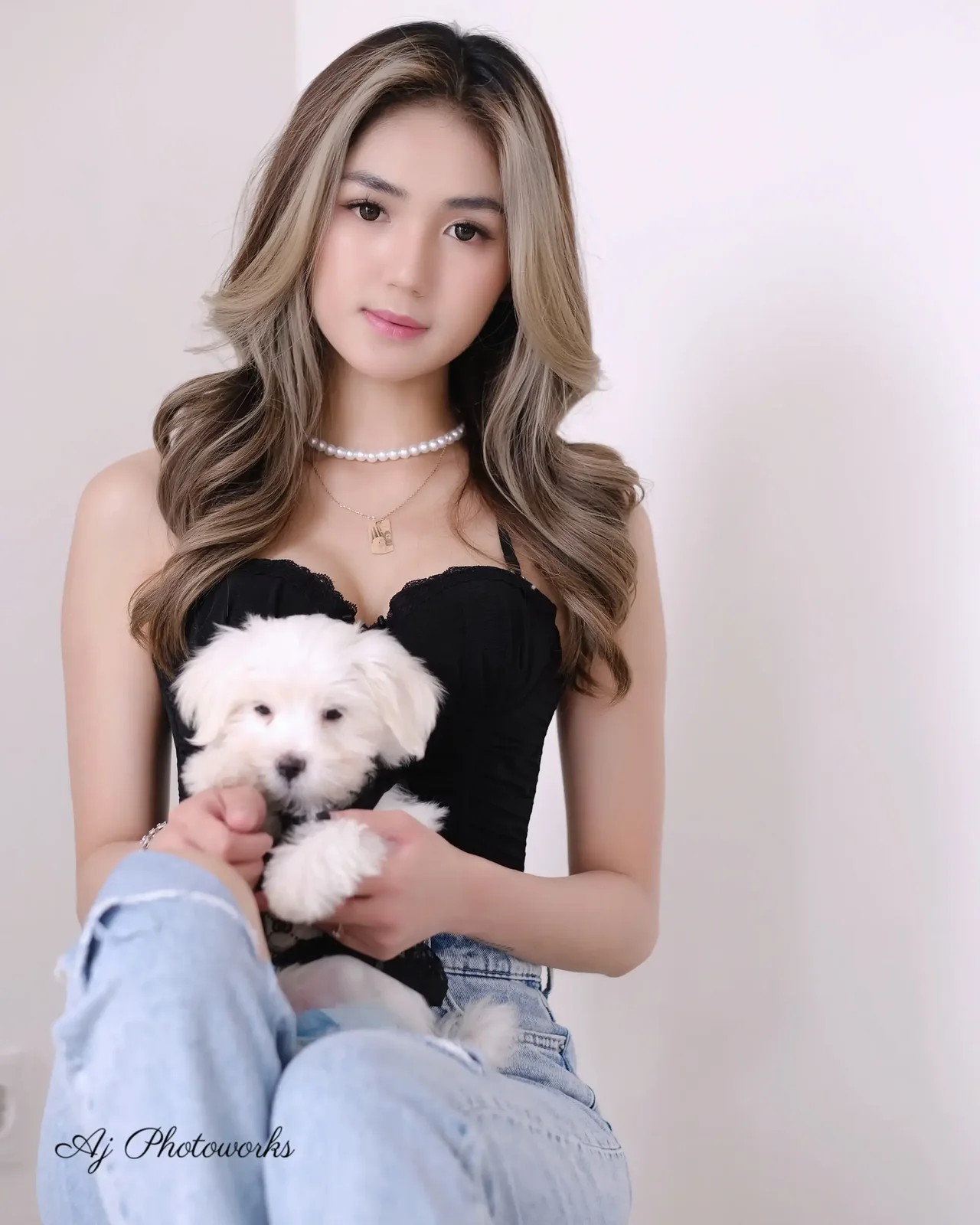 Chic elegance meets casual comfort in a studio setting, where a poised subject radiates style with a beloved canine companion.