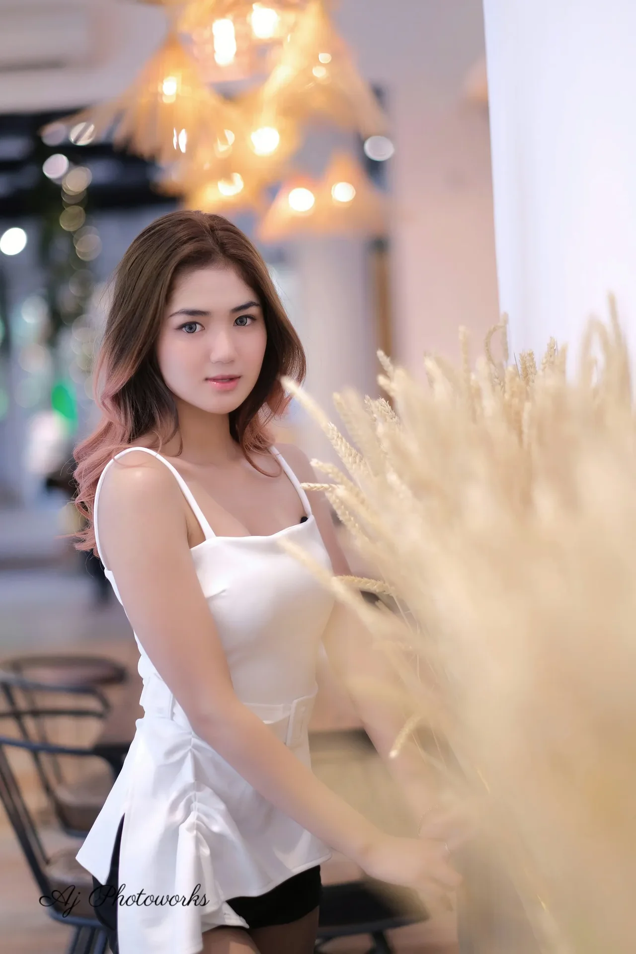 A modern fashion editorial captured in a chic café lounge with soft lighting and warm tones.
